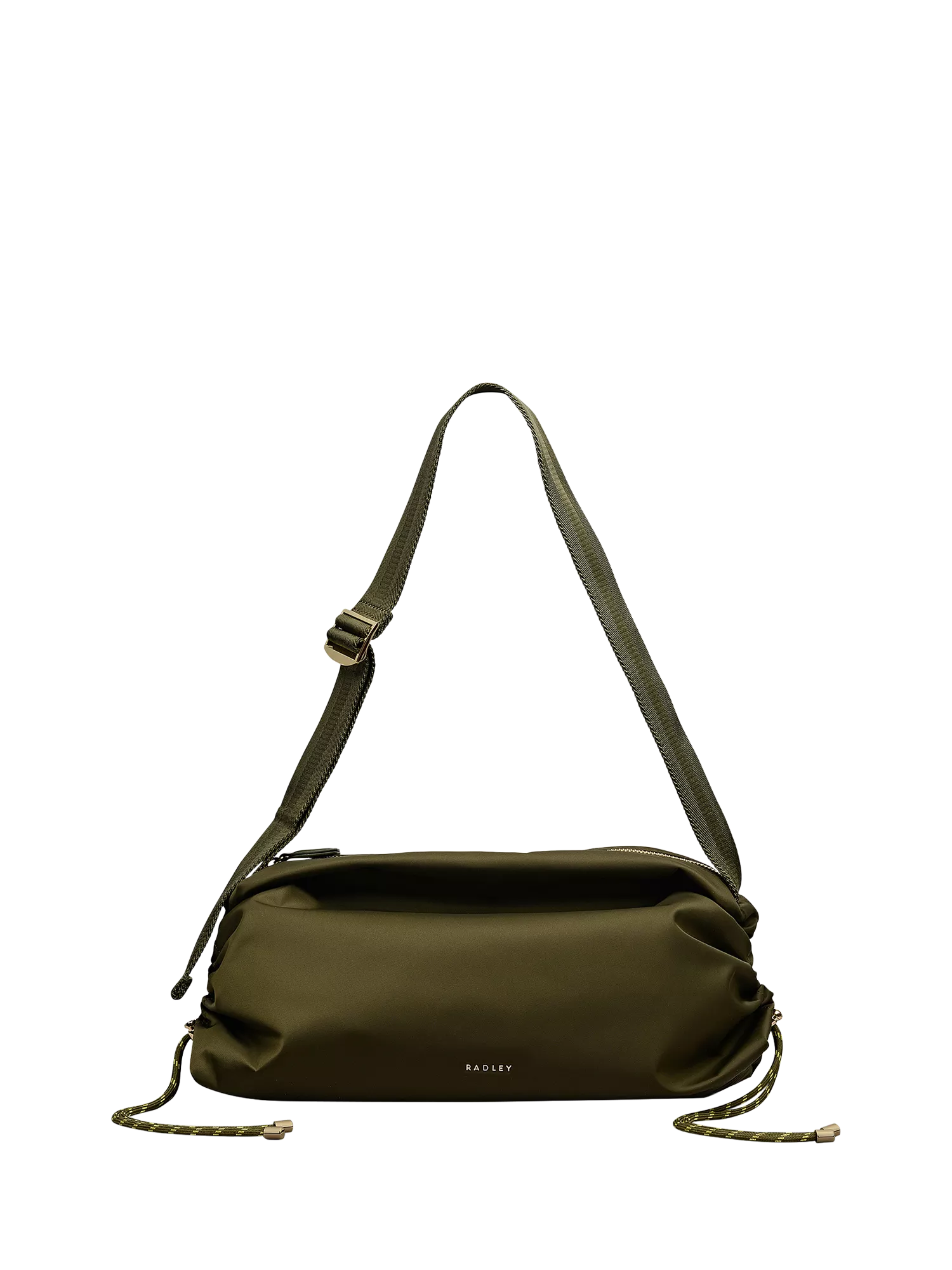 Covetable utility is showcased across the Eden Row crossbody bag, crafted using durable recycled nylon fabric. Designed for practicality, the drawstring sides can be tightened using the toggle to create a compact sling shape, or left open if you need a more space.
