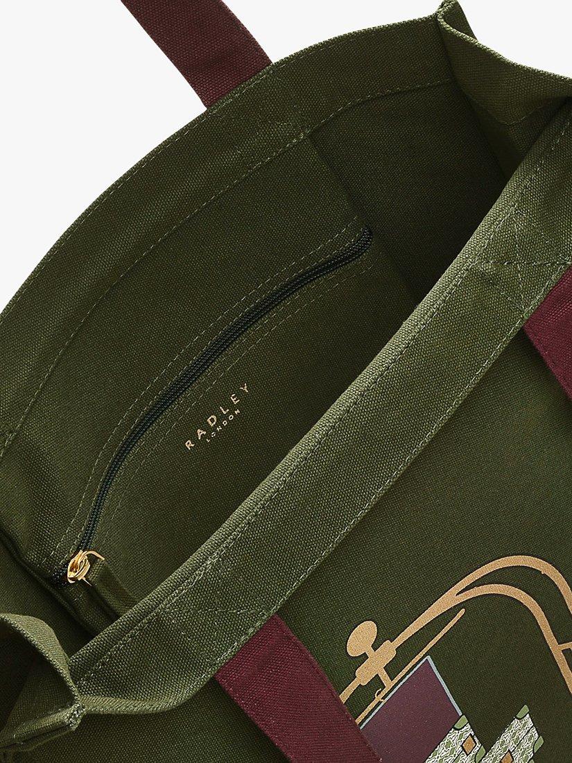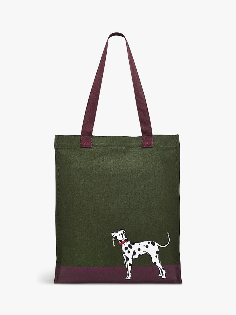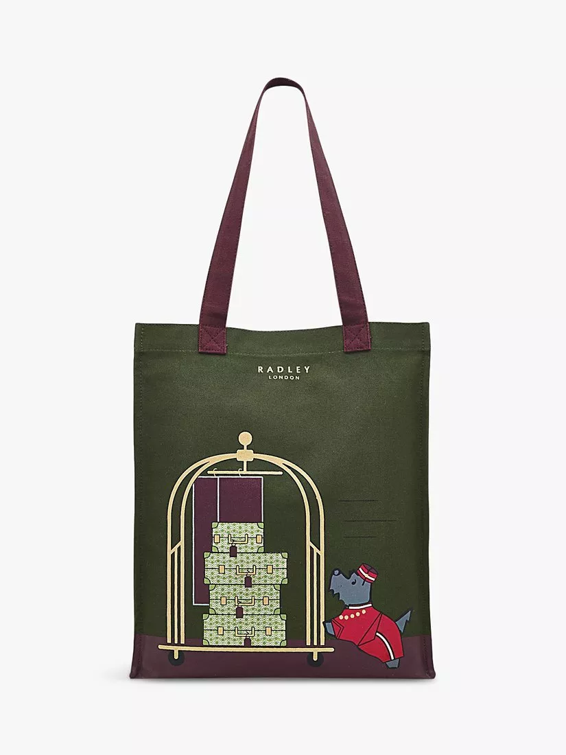 Helping with your bags. Radley's signature Scottie bellboy is handy with a luggage trolley, delivering his spotty friend's Heirloom-print cases on this canvas tote bag. Crafted using recycled cotton and designed with an interior zipped pocket to storing valuables safely.