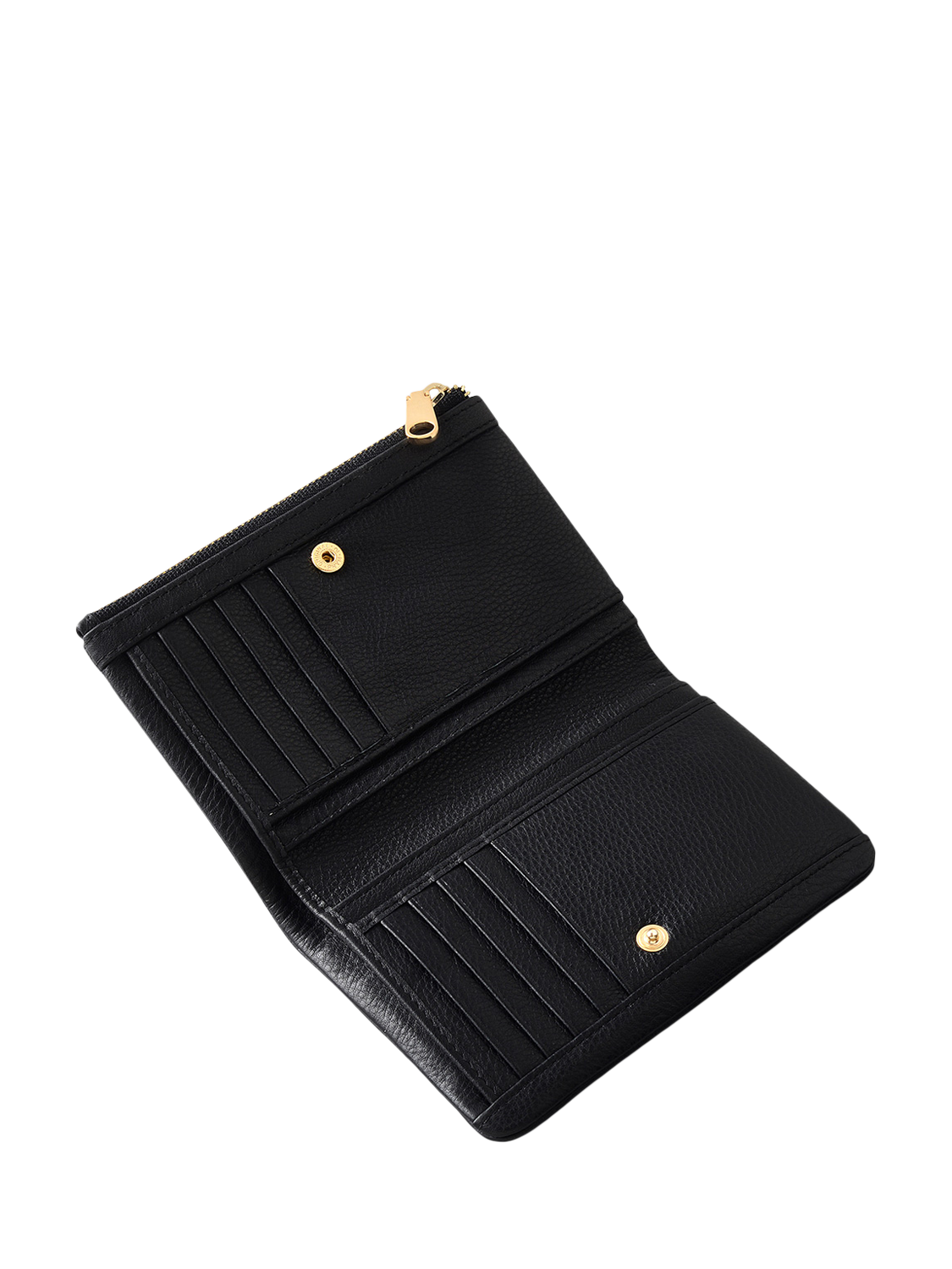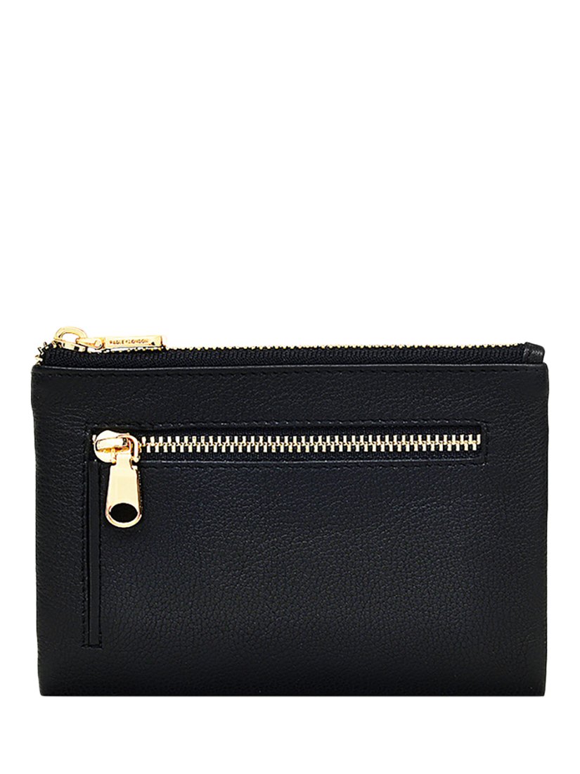 There are two compartments and an exterior zipped coin pocket. The main compartment has a zip closure, and the interior card slots are inside the flap-over shape with a simple press stud fastening. Completed with a foil logo and comes with a dust bag.