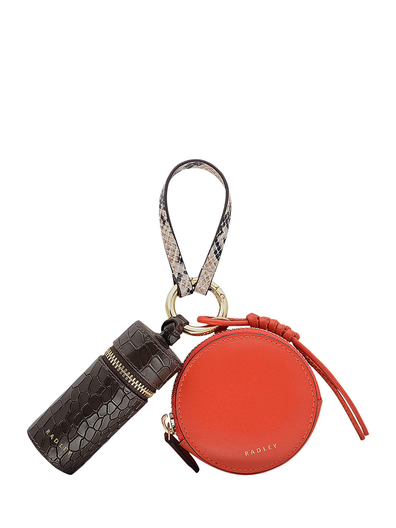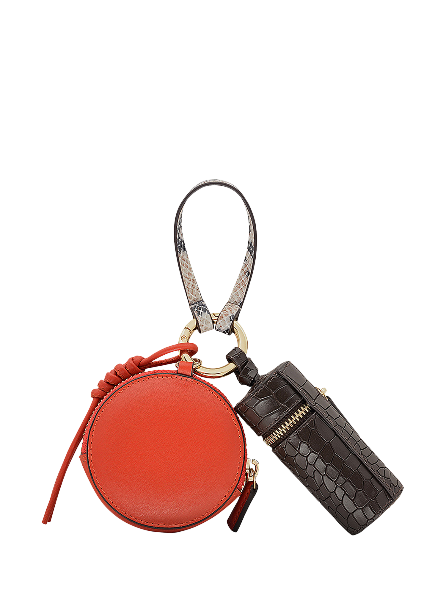 More than just a decoration, the Nicholas Road keyring features two zipped pouches perfect for storing those mini essential items. Crafted with contrasting textures of croc and snake-embossed leathers, a knotted leather charm and carabiner clip ring hardware.