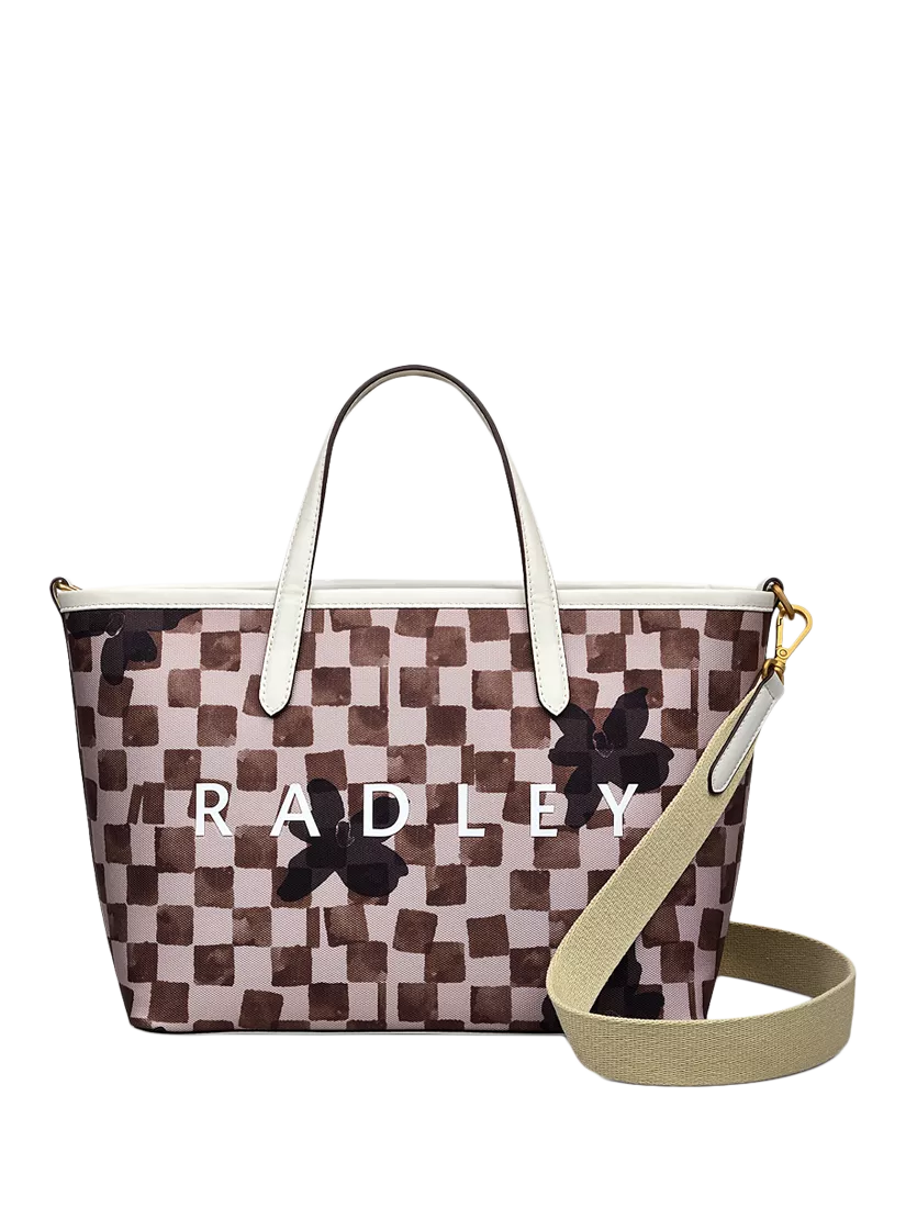 Chequerboard and floral prints decorate the fabric of Radley's Southwell Gardens tote bag. Boasting generous space and faux-leather trims, this piece features slim padded handles, dog clip fastening and an interior hanging pocket.