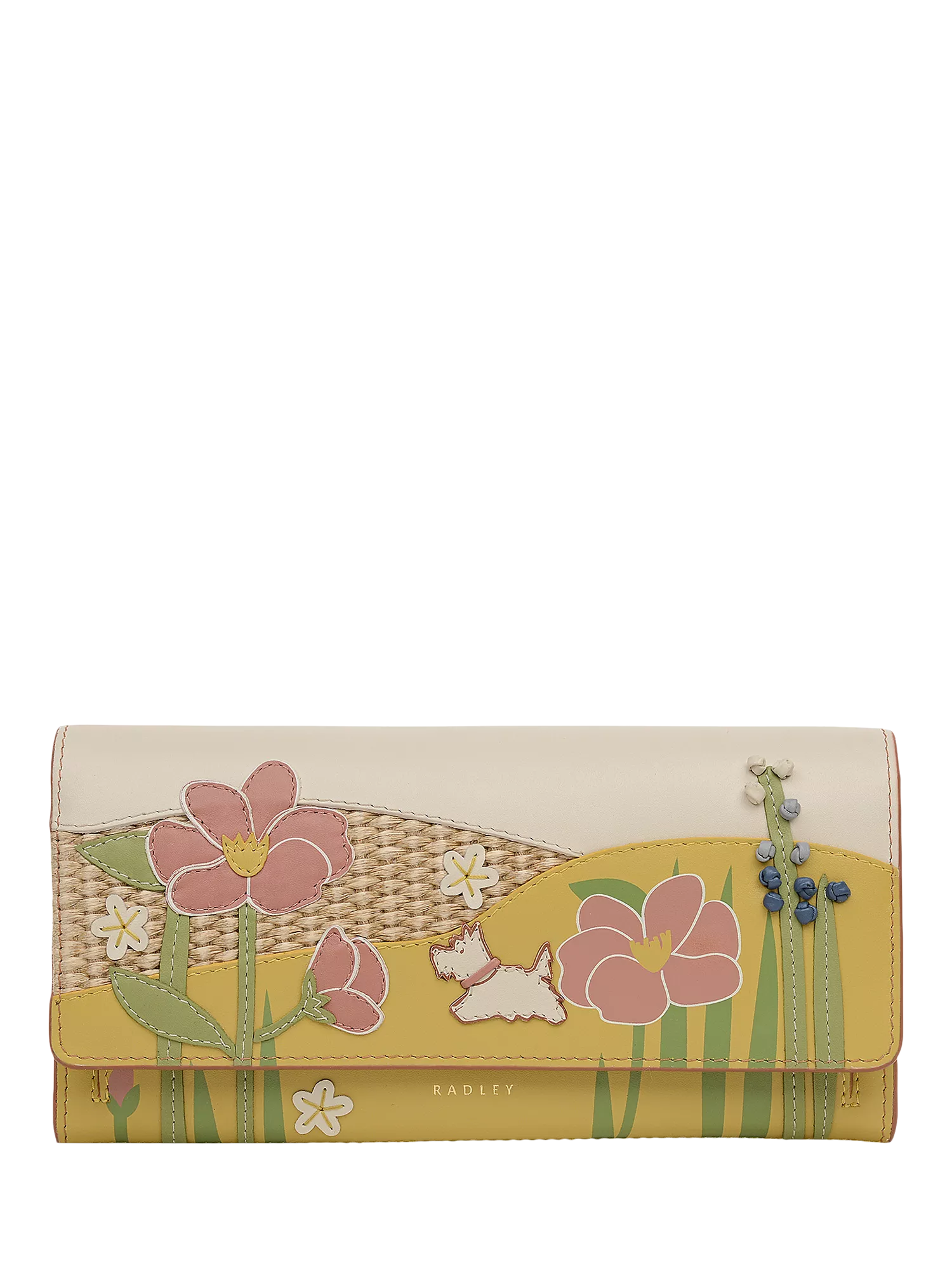 An icon of leathercraft, Radley's picture purse returns this spring as a textural masterpiece. Inlaid woven raffia and smooth leather come together to form the backdrop of the Spring Blooms collectible, with intricate floral details showcased in leather appliqué, ombre knotting, stitching and screen prints. Features a flap-over shape with press-stud fastening, two compartments, 10 interior card slots, zipped pocket and slip back pocket. Comes with a dust bag.