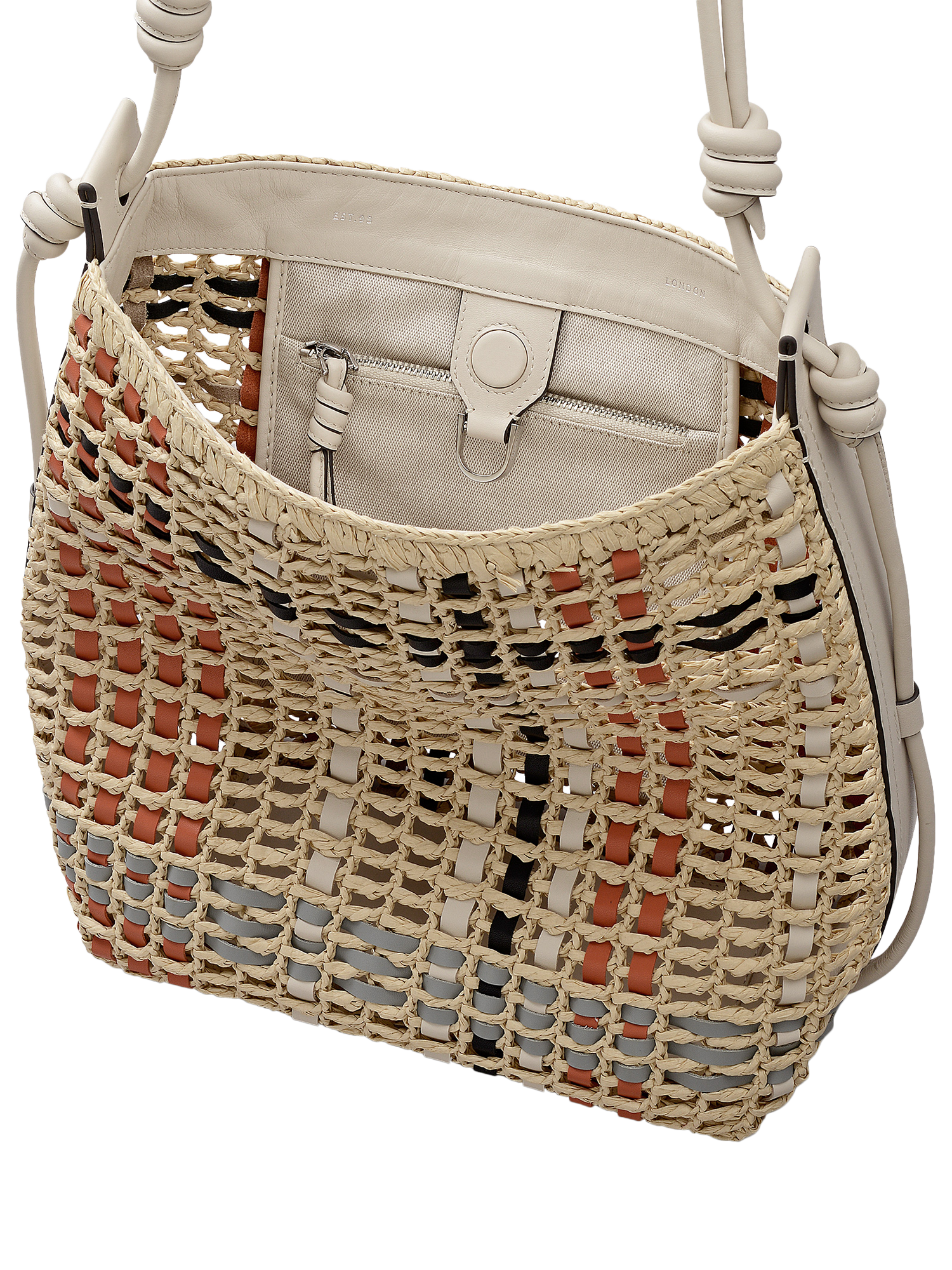 Craft details transform The Camden from an everyday beach-style bucket bag into an artisanal creation. This Raffia Check edition is made with strips of contrasting smooth leather threaded throughout the open raffia weave, creating a checked pattern. This bag’s details continue in the signature tubular leather strap with sliding adjustability and knotted finishes.