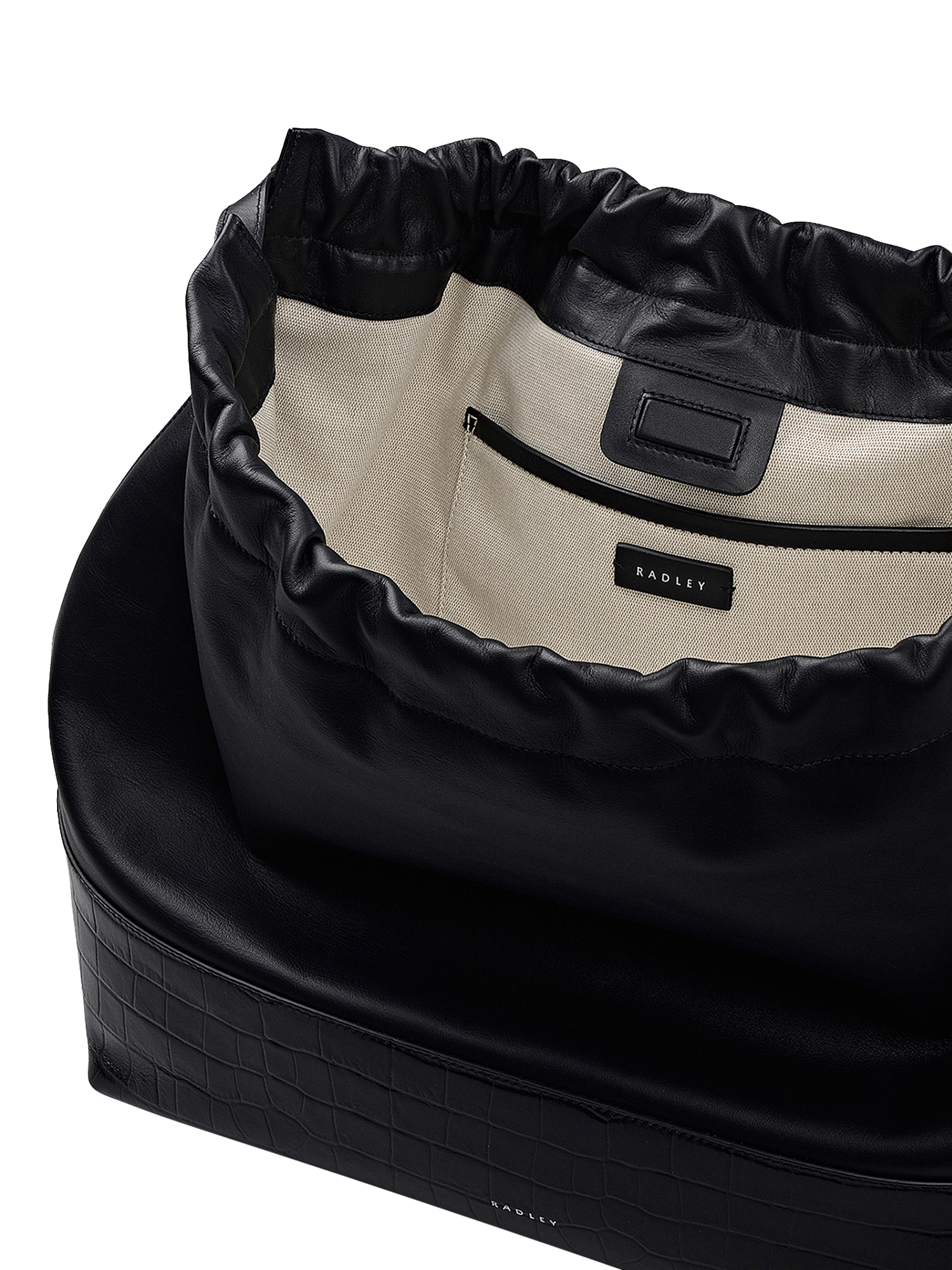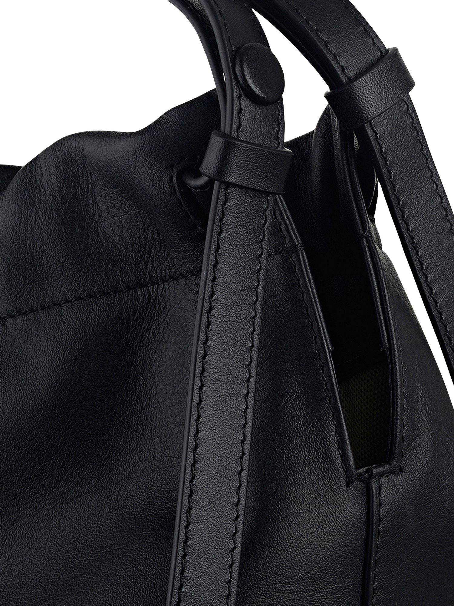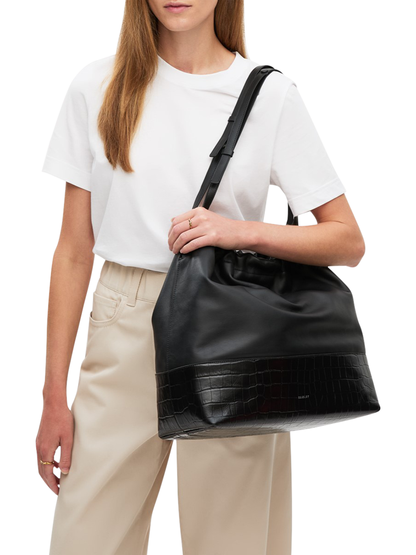 A neat horizontal seam allows contrasting leathers to come together across The Portobello, a modern oversized market bag with a supple drawstring top and textured leather along the base.