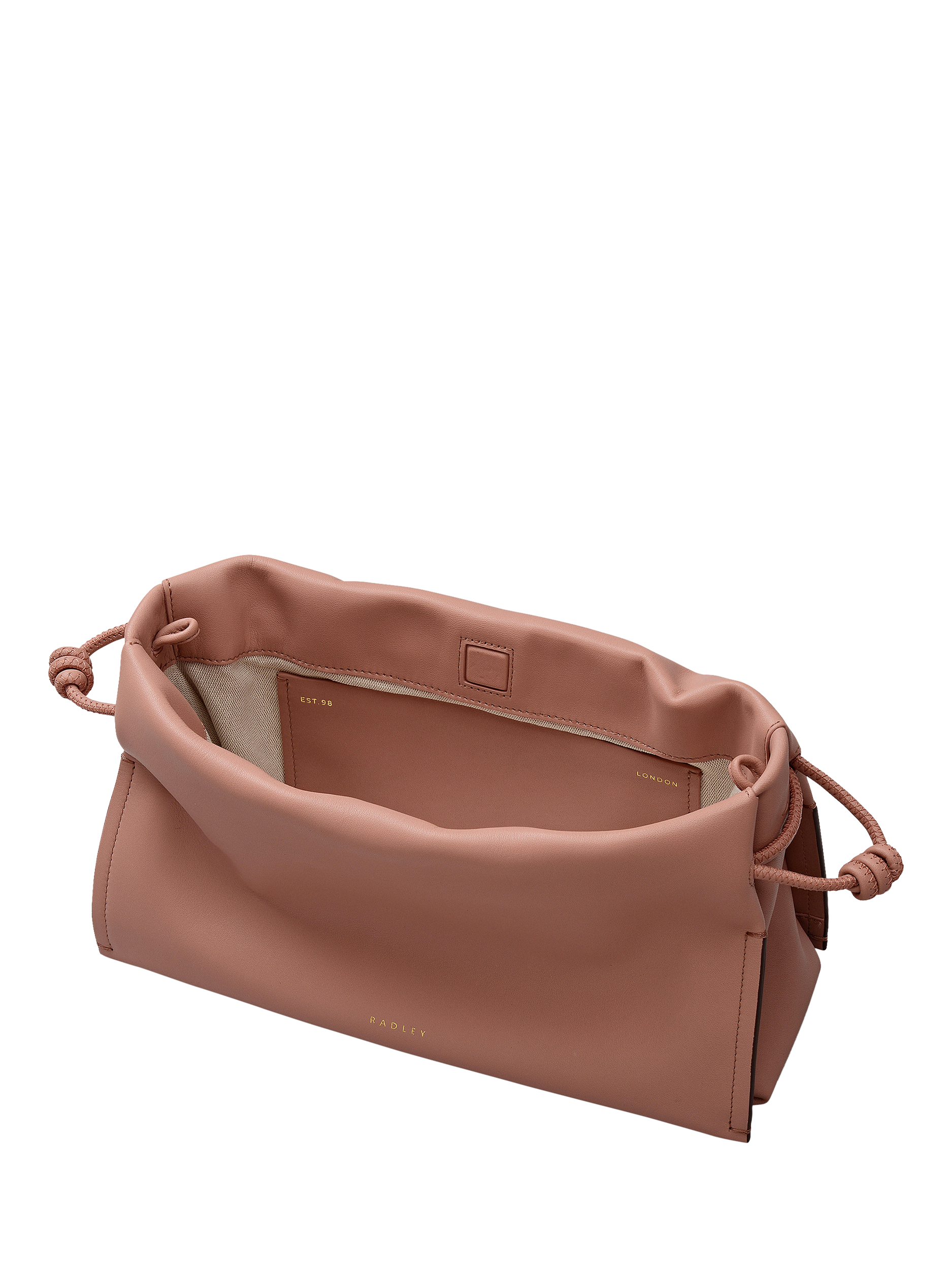 When creating a drawstring handbag, it must be super soft, supple and gather effortlessly when fastened. It’s why Radley have chosen a thick, smooth leather to craft this new clutch edition of The Roxburgh, a chunky silhouette with cut-edge sides and zigzag-stitched drawstrings.
