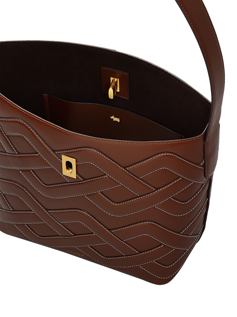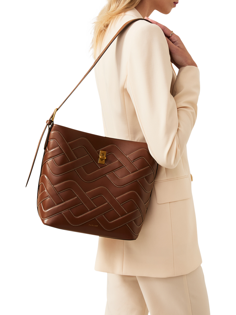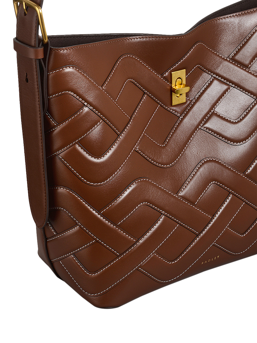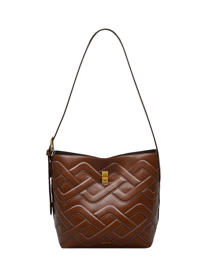 Radley's latest bucket bag is now wrapped in cable knit-inspired padded appliqué. Threadneedle Street is a smart, timeless style made with sleek vegetable-tanned leather and brushed gold-tone hardware. It has a padded, adjustable shoulder strap and bonded faux suede lining, luxurious final details complemented by the twist-lock fastening and useful interior slip pocket.