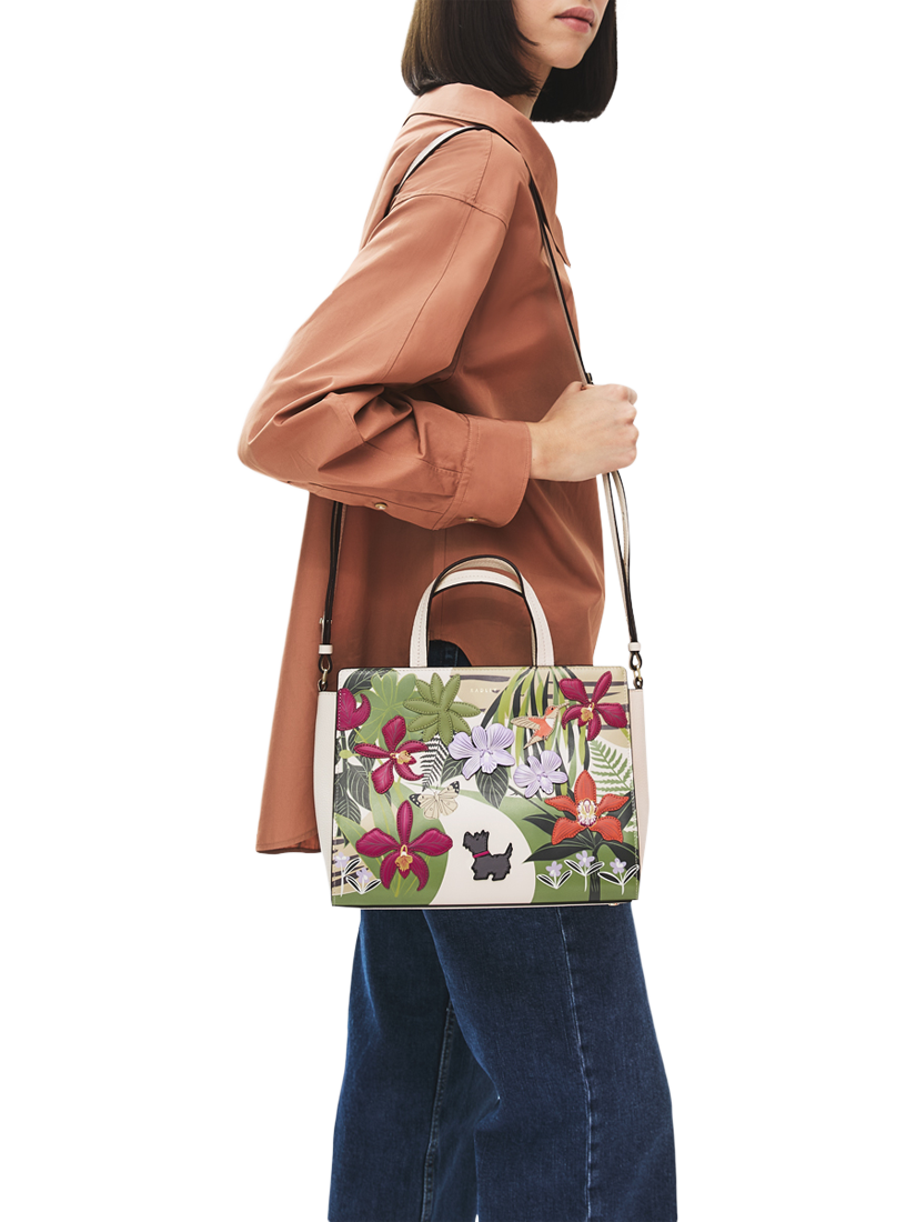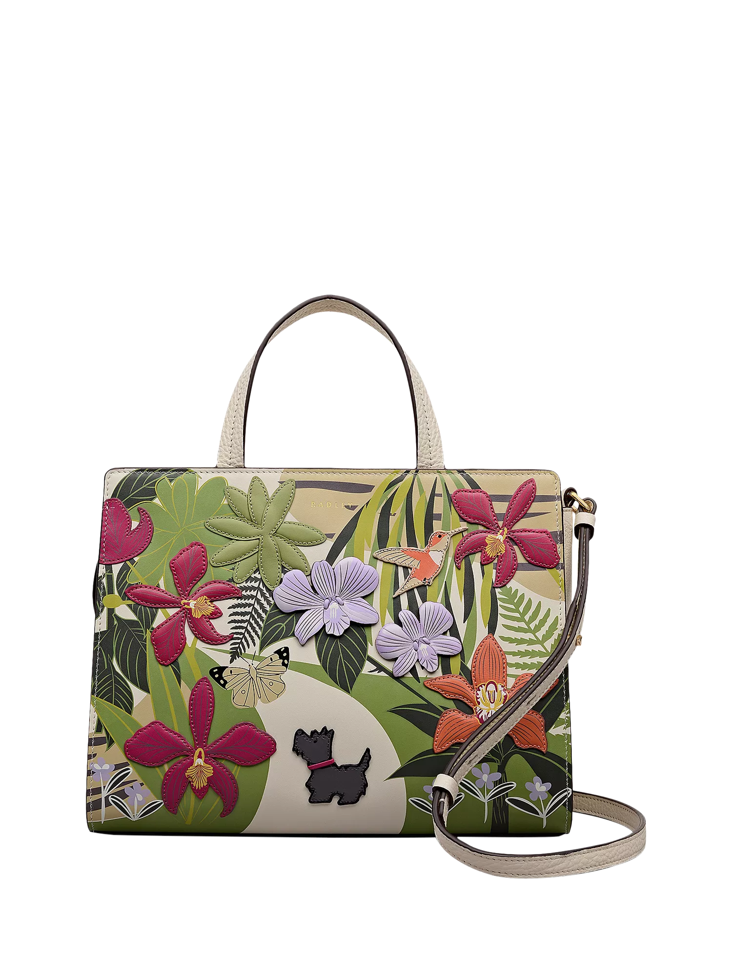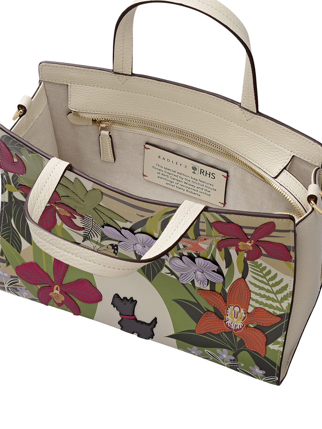 Scottie admires the blooms and butterflies in the crafted artwork on this handbag from Radley's new RHS Collection. Inspired by the Orchid House at RHS Garden Wisley, this scene is brought to life using leather appliqué with padded details, screen prints and 3D flowers. Finished with logos to mark the brand's latest Radley x Royal Horticultural Society collaboration.