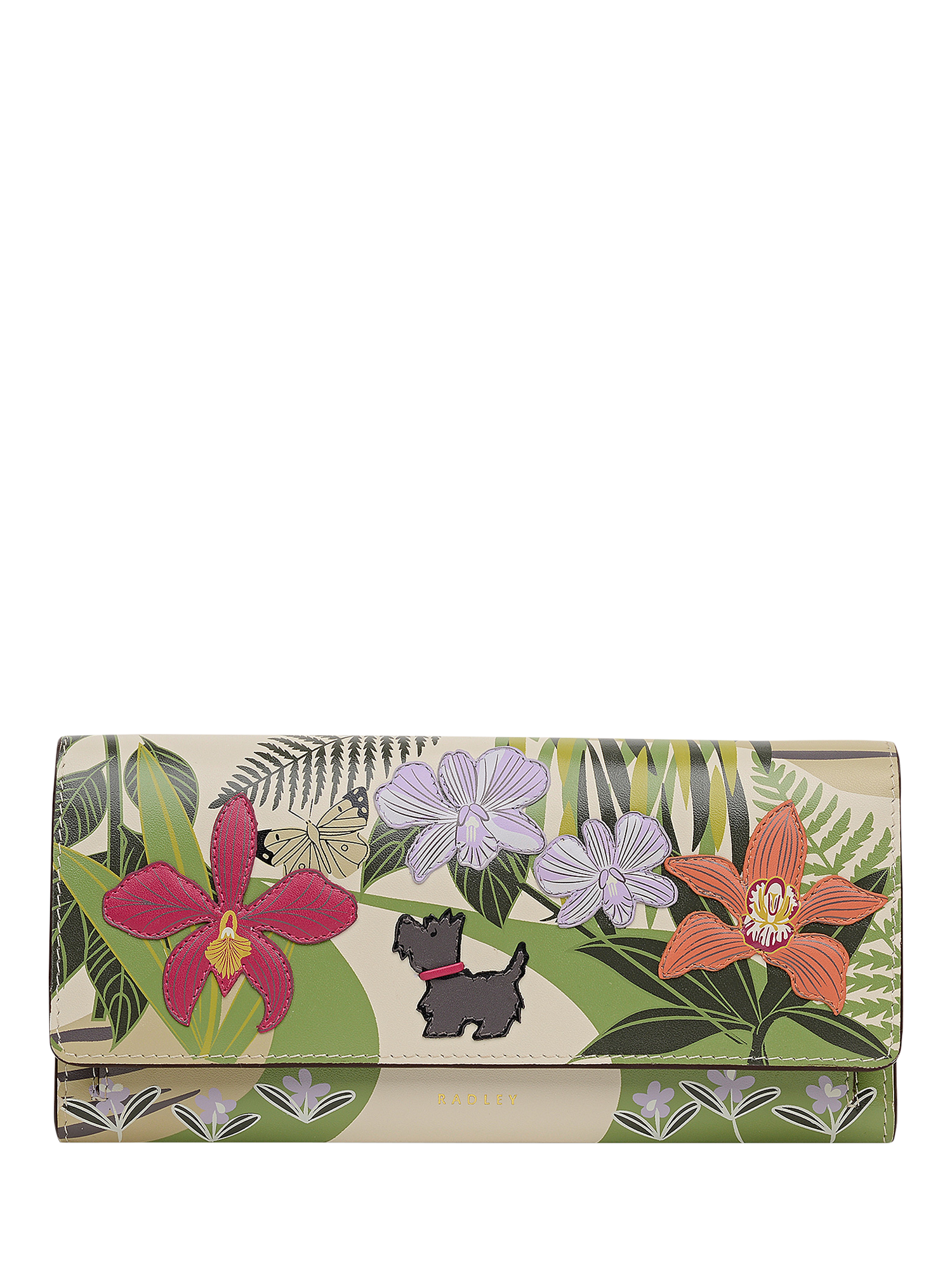 Scottie admires the blooms and butterflies in the crafted artwork on this large purse from Radley's new RHS Collection. Inspired by the Orchid House at RHS Garden Wisley, this scene is brought to life using leather appliqué and screen prints. Finished with logos to mark the brand's latest Radley x Royal Horticultural Society collaboration.