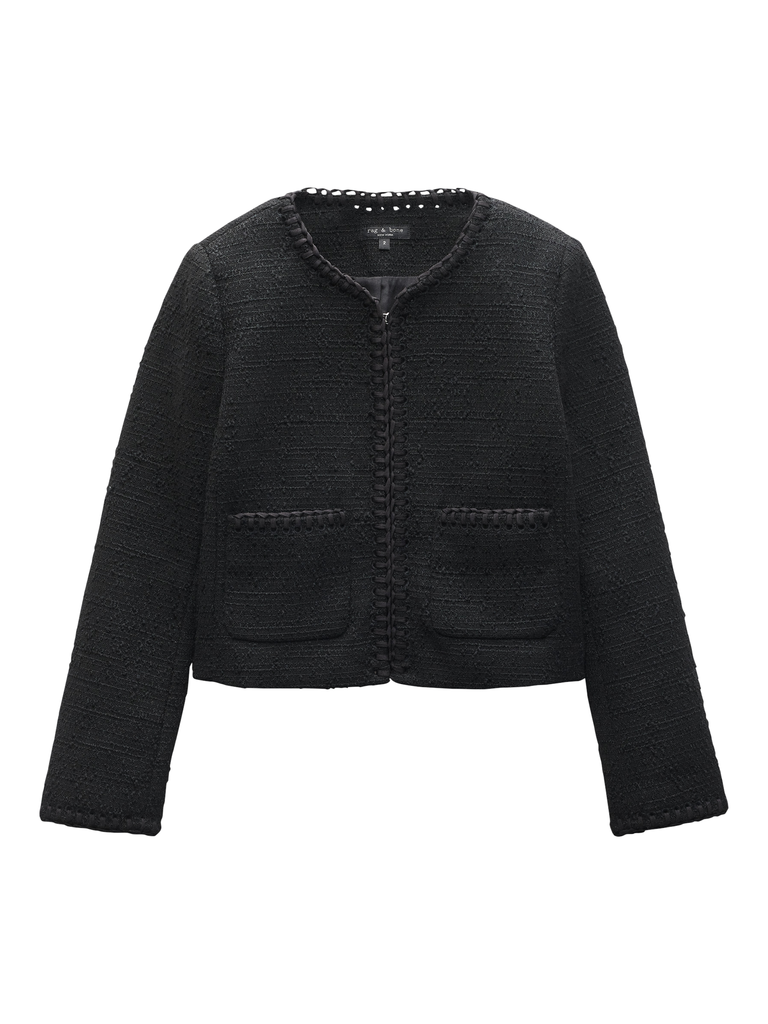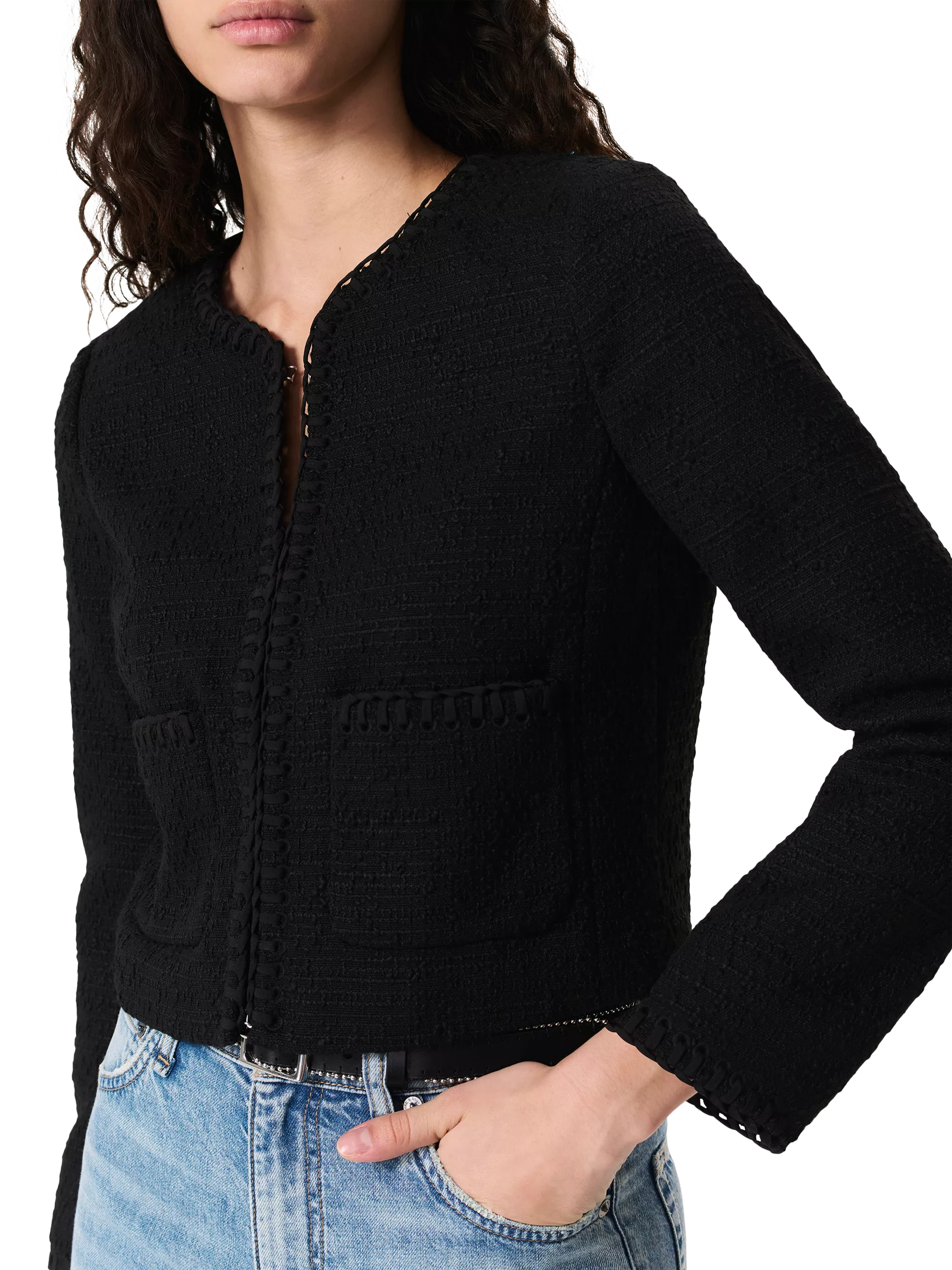 Framed with a classic round neckline, it will add texture to your look with its tweed fabrication.