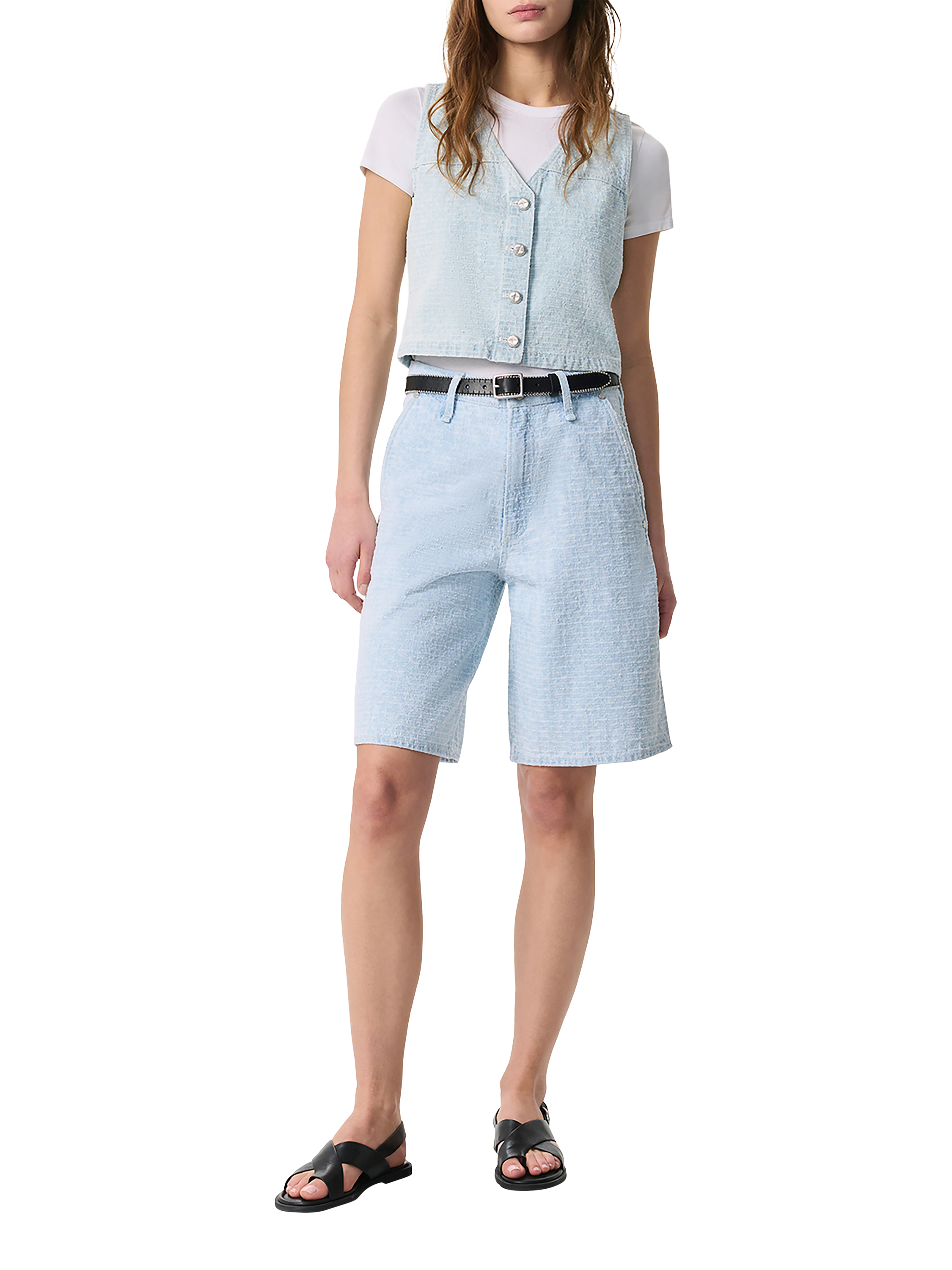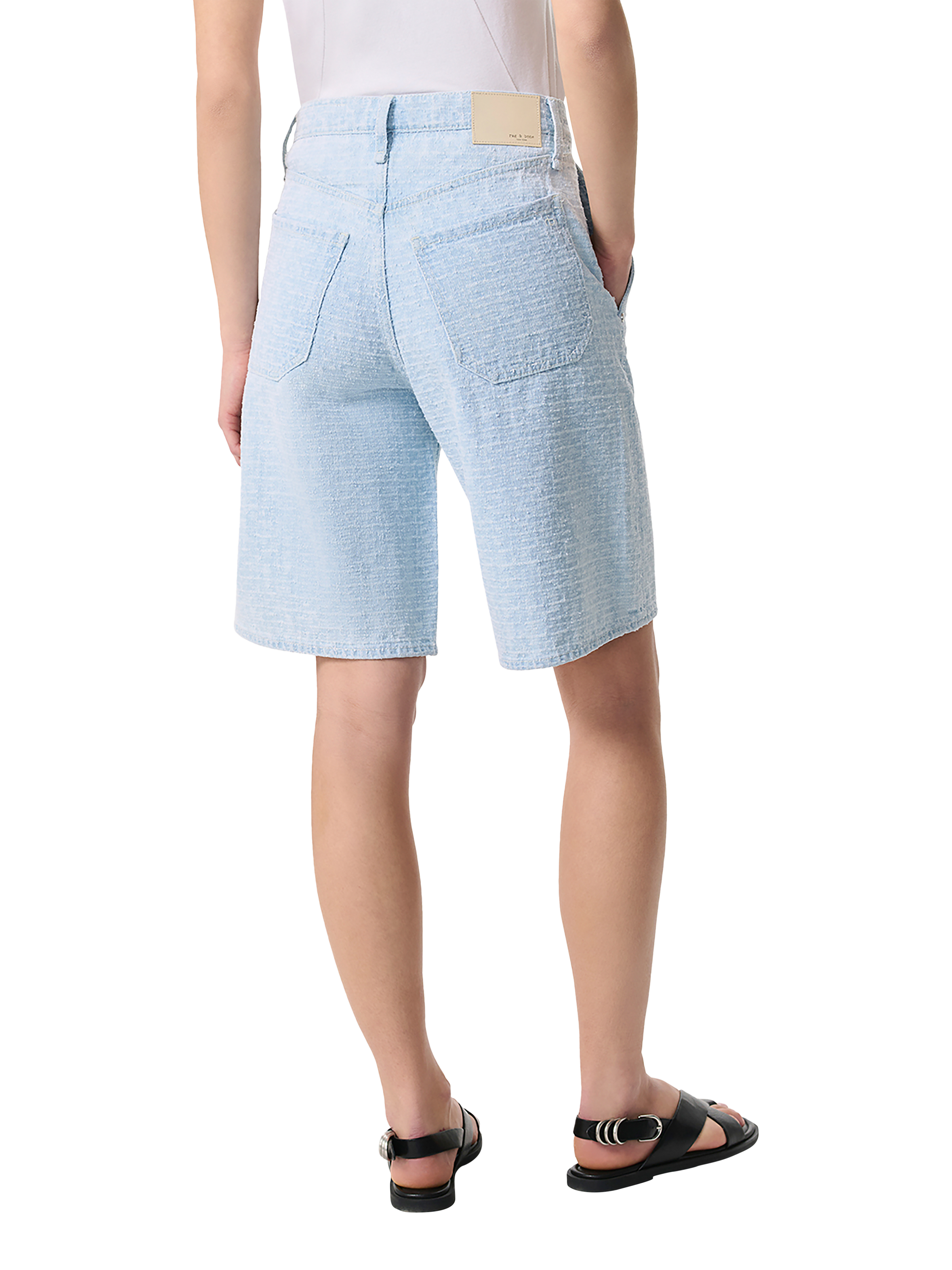 The Tailored McKenna Short. A dressier take on high-rise Bermuda shorts with a relaxed fit, 10.5" inseam, and front slant pockets. Crafted from Lightweight Rigid non-stretch denim that provides structure, but breaks in over time for a soft and comfortable feel. In Sky Blue Tweed, a pale blue with an allover tweed-inspired texture.
