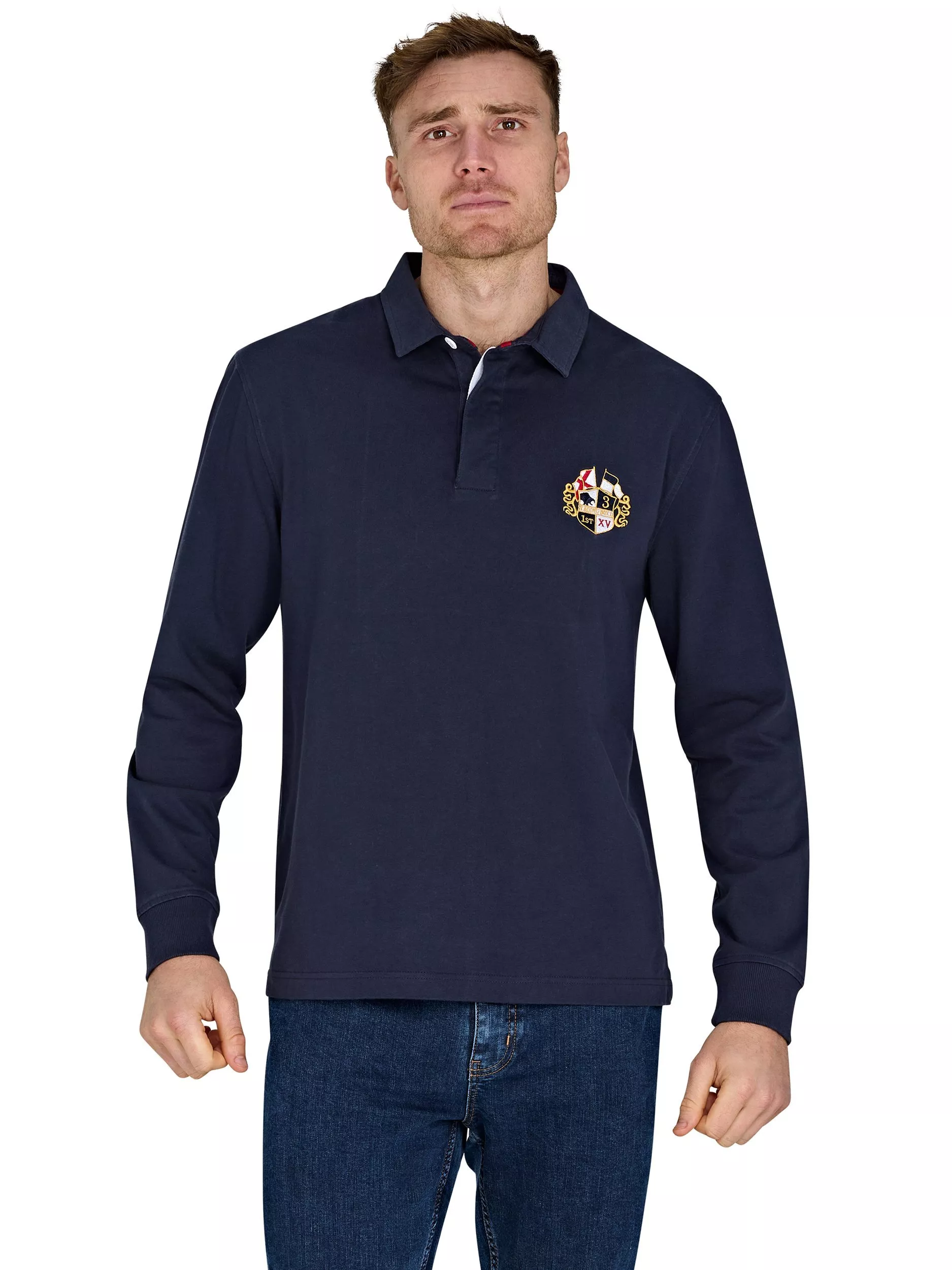 This Classic Long Sleeve Rugby is made from high quality, hardwearing cotton that's built to last. With ultimate comfort and flattering style, it's perfect for everything from smart to casual occasions. Features include cuffed sleeves, a button up polo style collar and our iconic Union Flag and Raging Bull crest embroidery. Navy rugby shirt in sizes small to big and tall - up to 6XL.