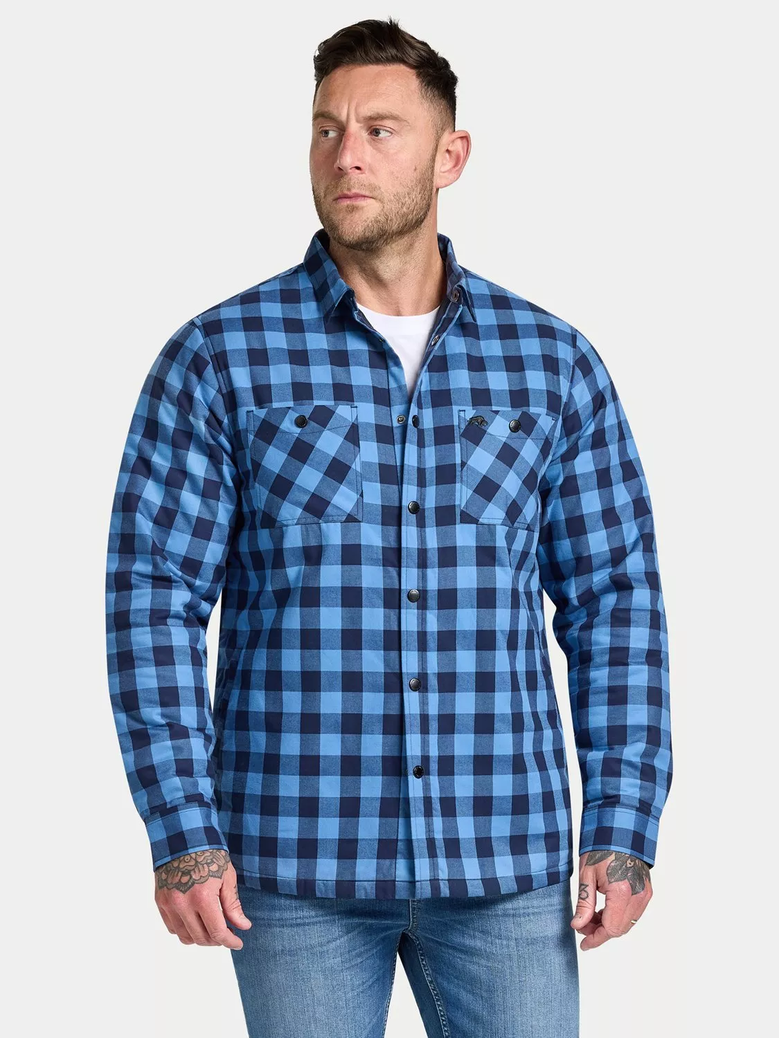 Crafted from 100% cotton twill with a polyester lining, this Quilted Shacket in Navy combines the comfort of a padded shirt with the style of a jacket. Soft to the touch, the smart collar and navy and blue large check pattern adds a touch of sophistication, while the button close chest pockets offer practicality. With a popper button up front and waist pockets, this shacket is the perfect blend of fashion and function.