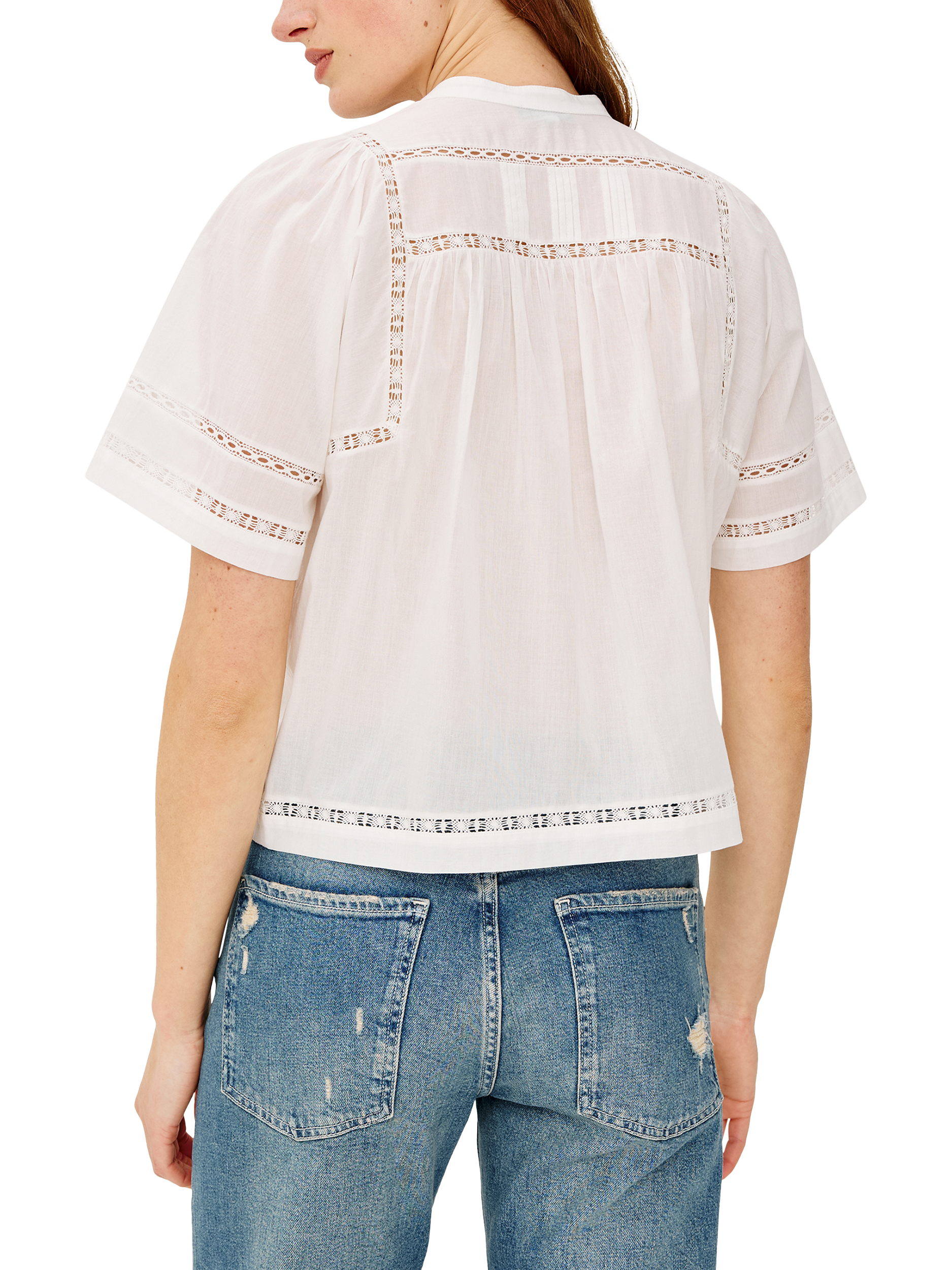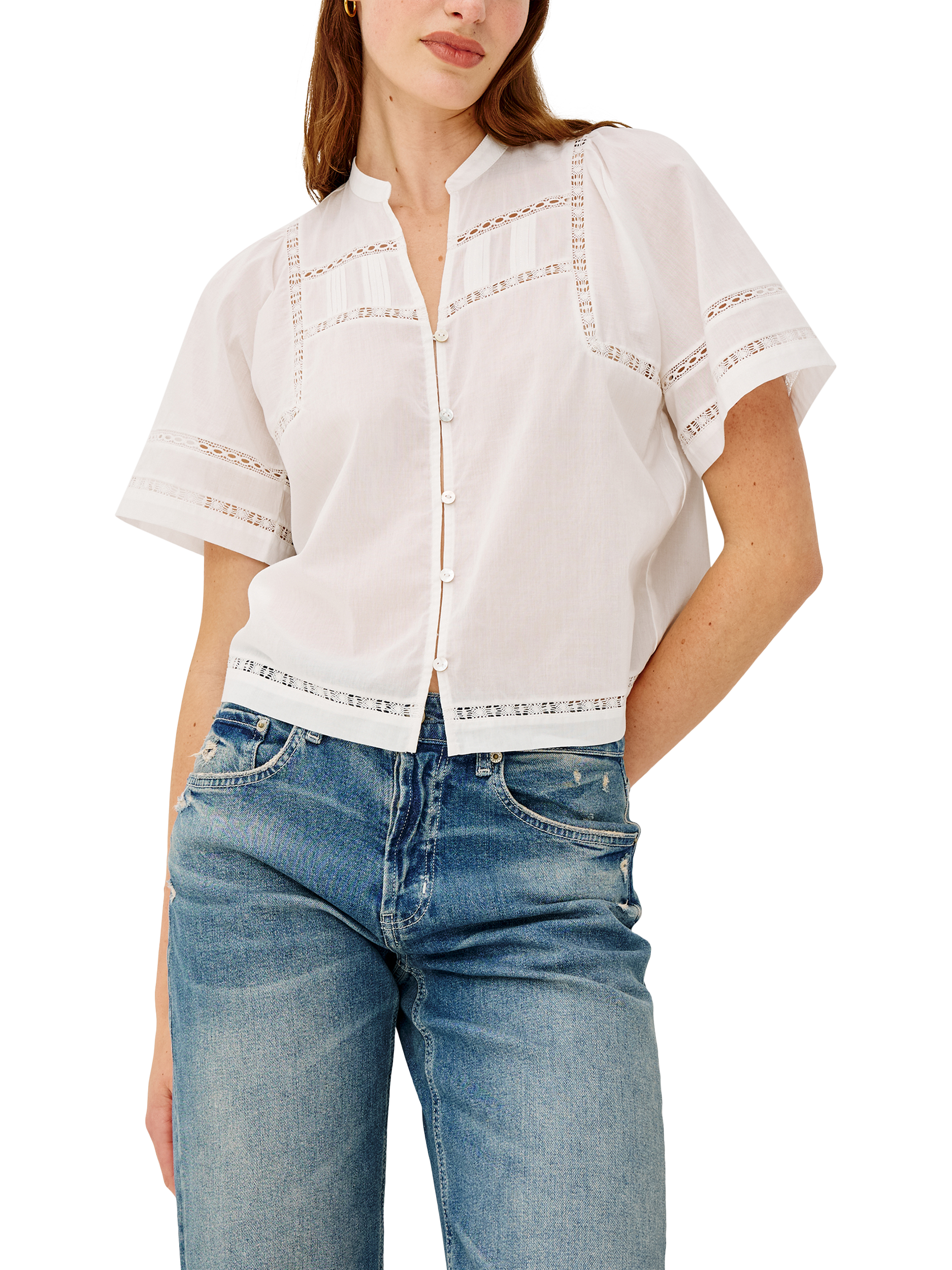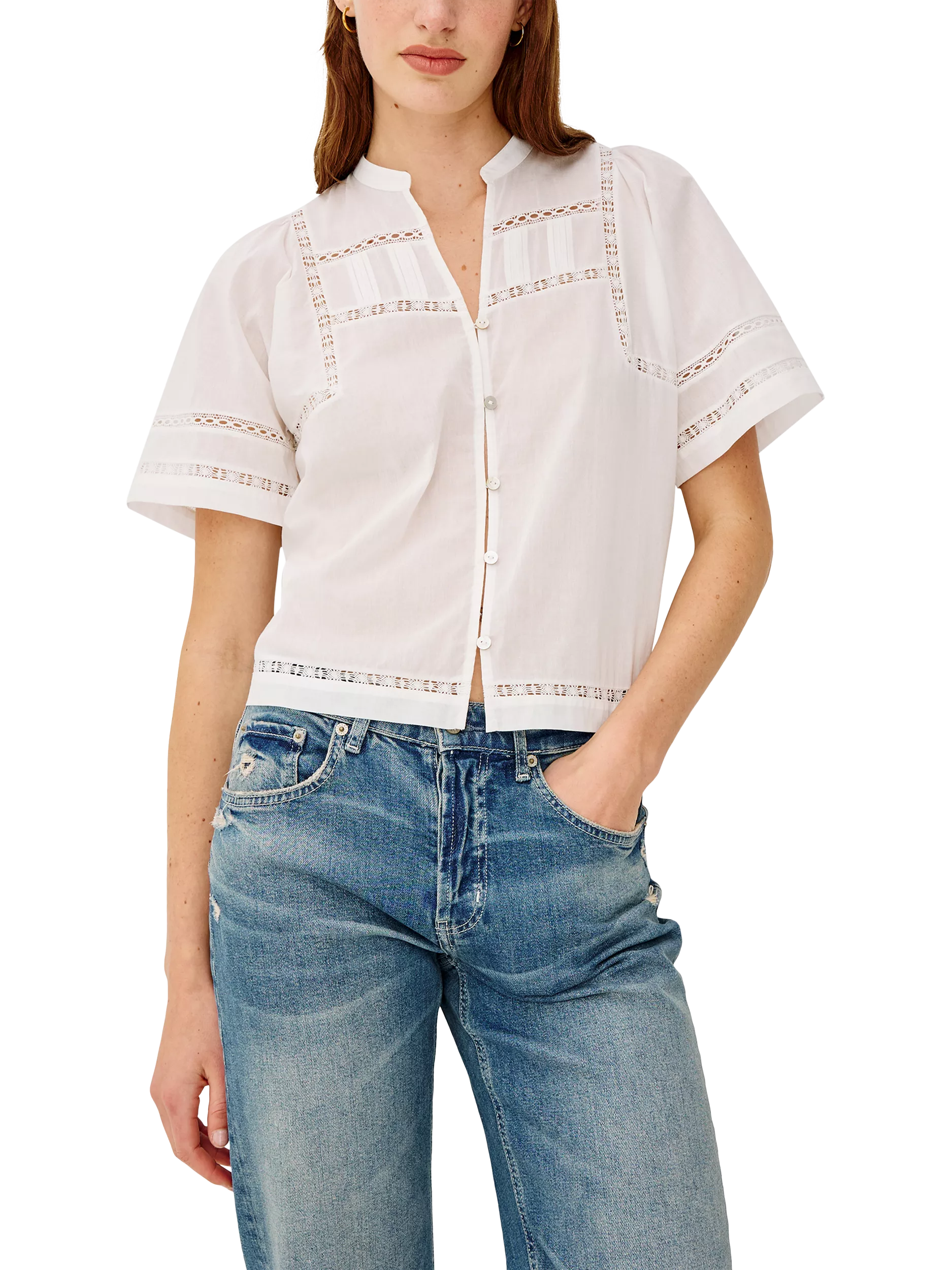 The Alanis Shirt is crafted from lightweight cotton, featuring a split band V-neckline, front button-and-loop closures, intricate lattice embroidery, and short, slightly puffed sleeves.