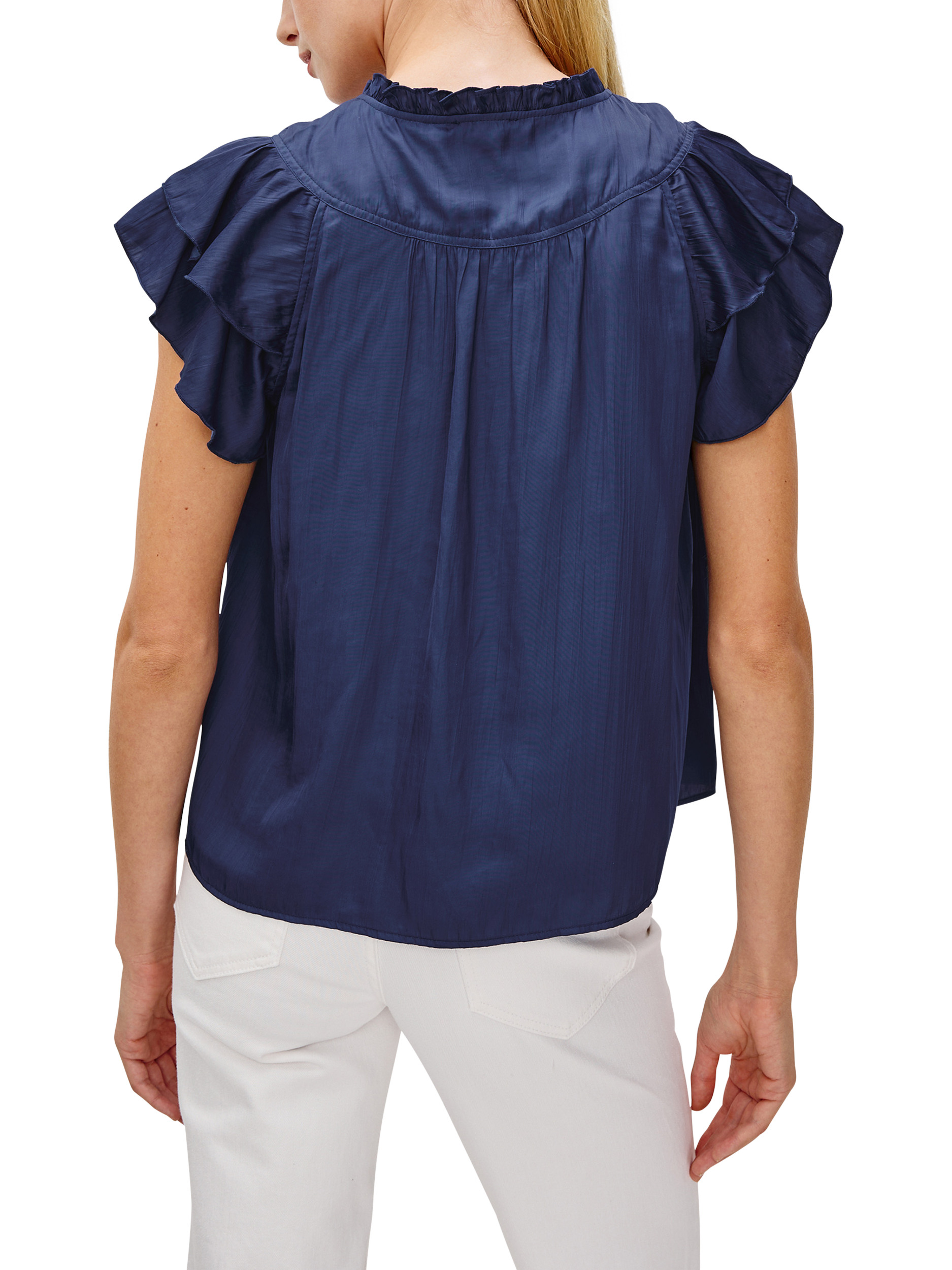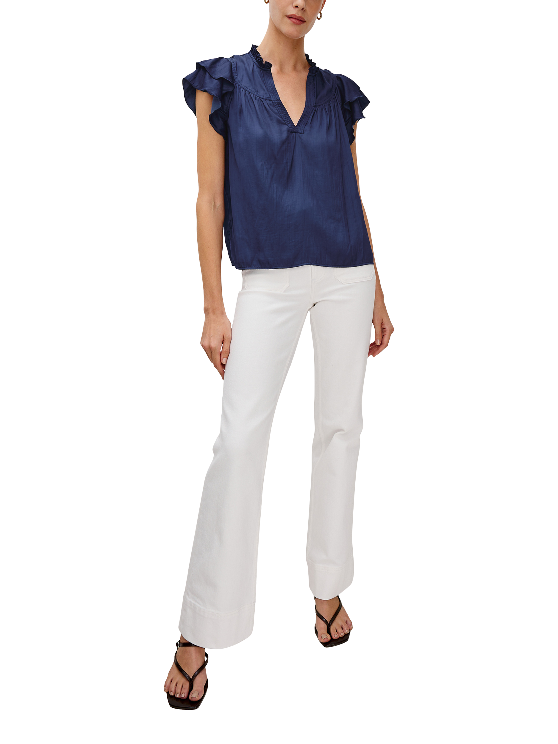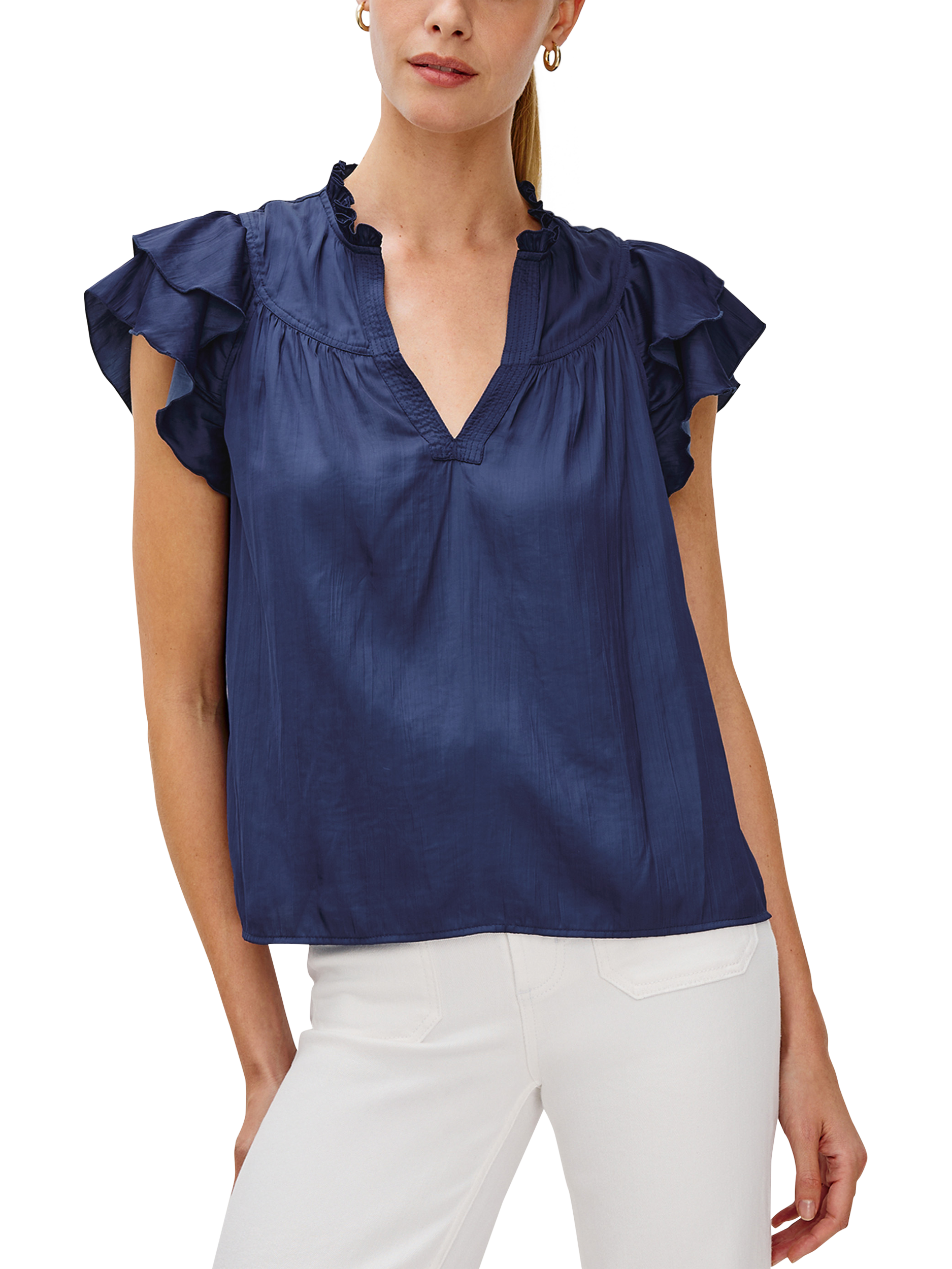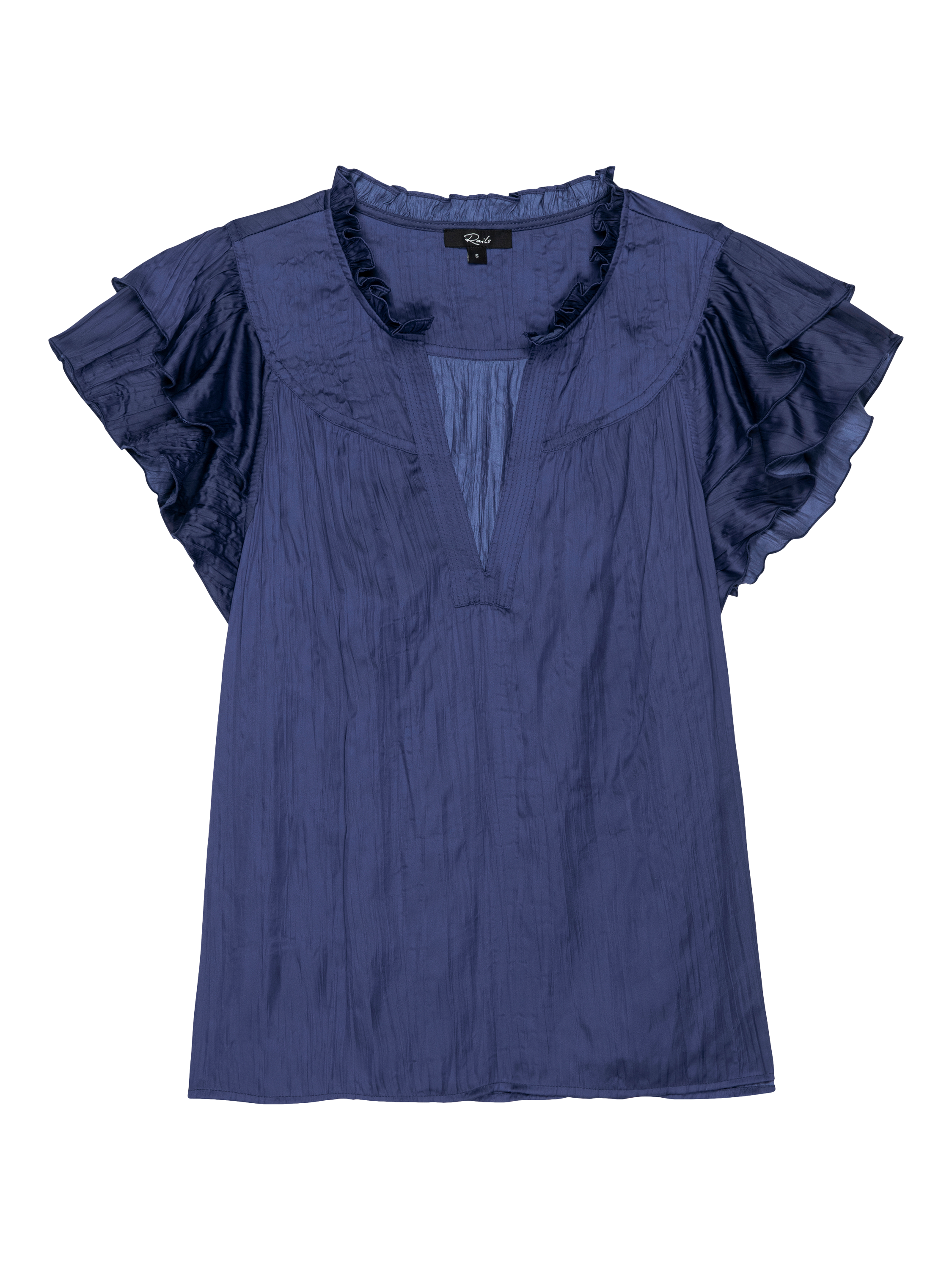 Crafted in sumptuous crinkle satin with ruffled sleeves and a plunging neckline, the Calista is a classic look that easily pairs with your favorite denim.