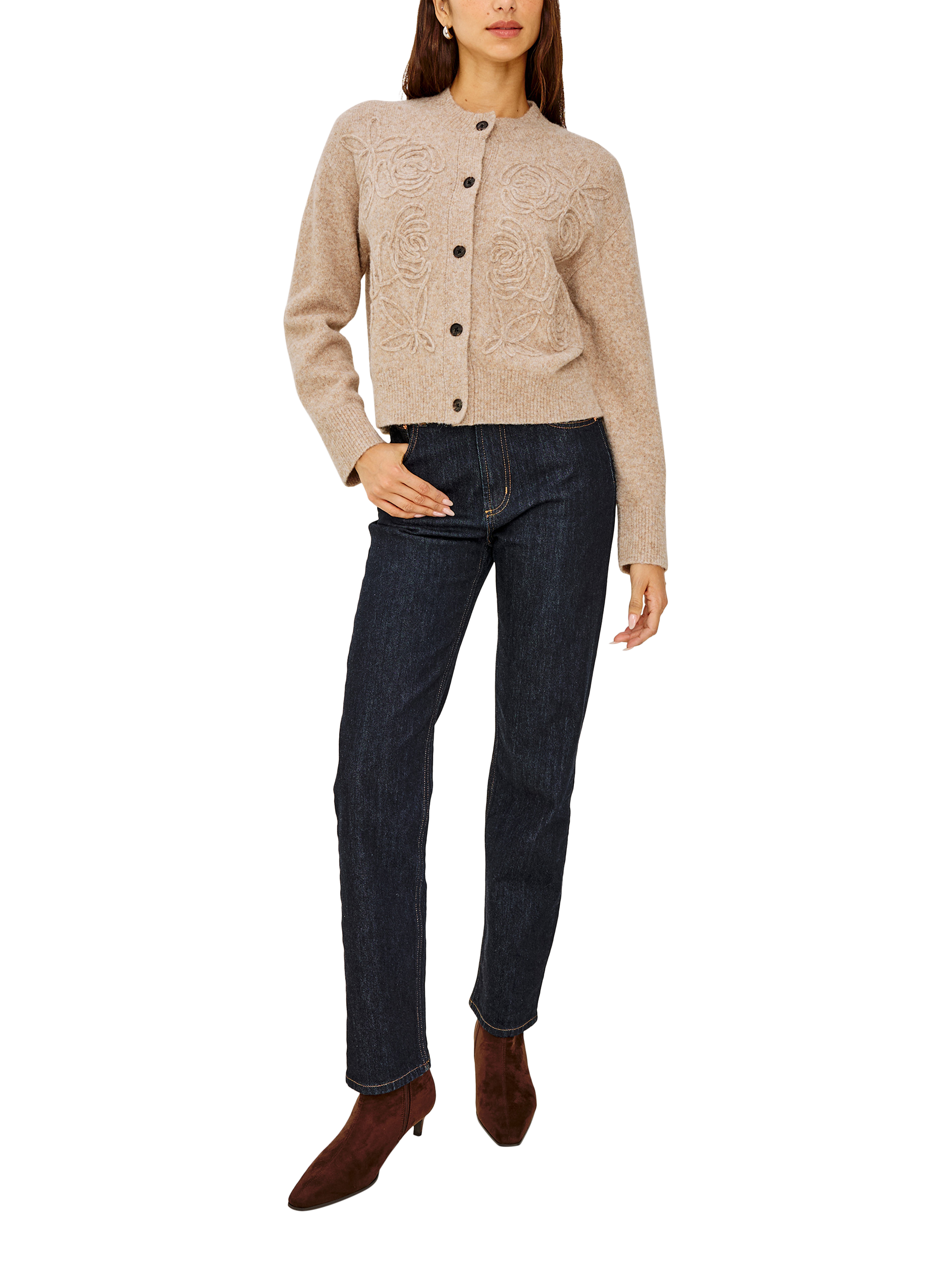 Comfort elevated to an art form, the Coralee is a sumptuously soft knit cardigan with romantic soutache rosette detailing. It features front button closures, a relaxed fit, and long sleeves.