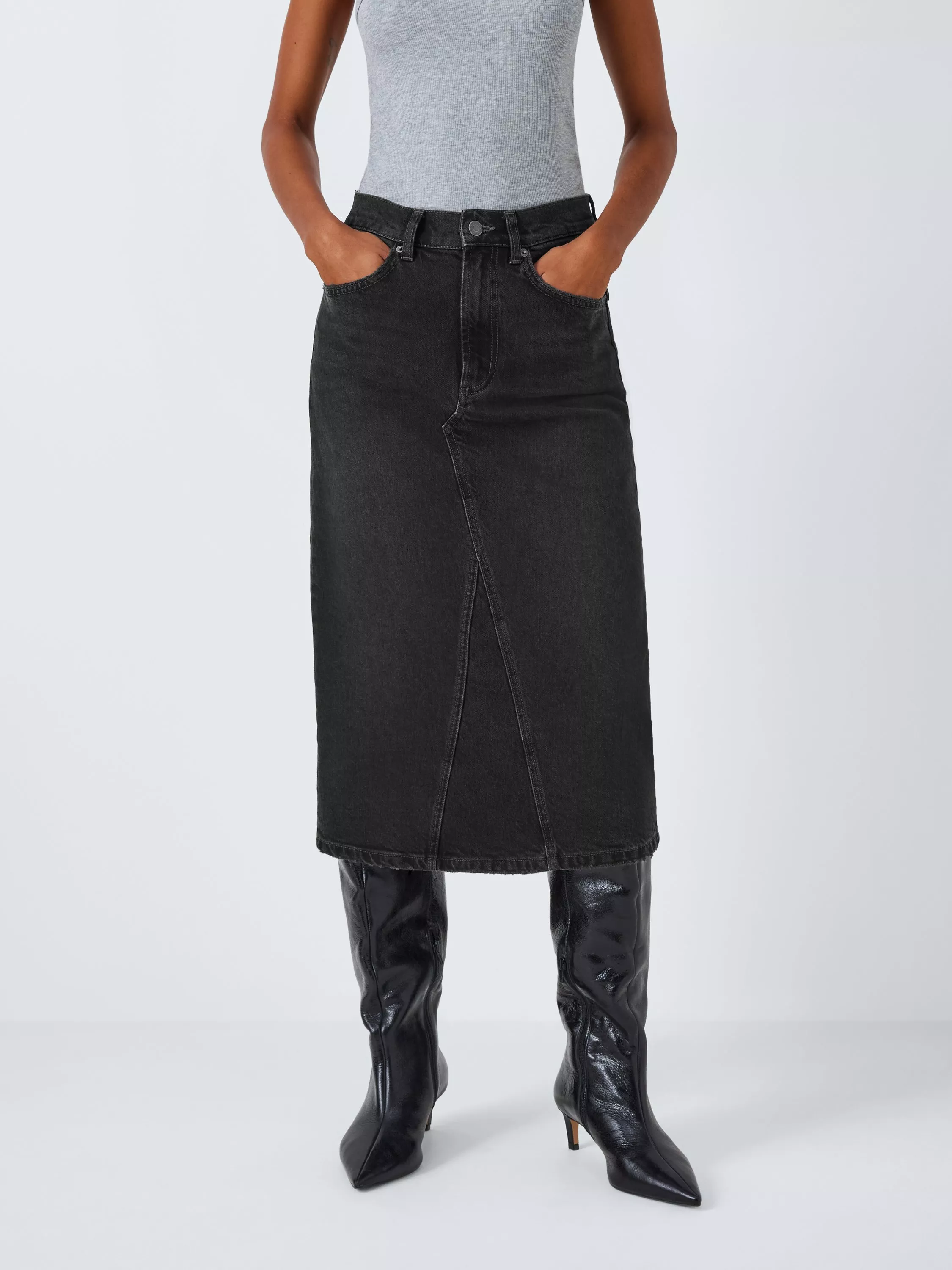 Move over mini skirt. The Highland is a high waisted midi skirt with a zipper fly and a back vent.