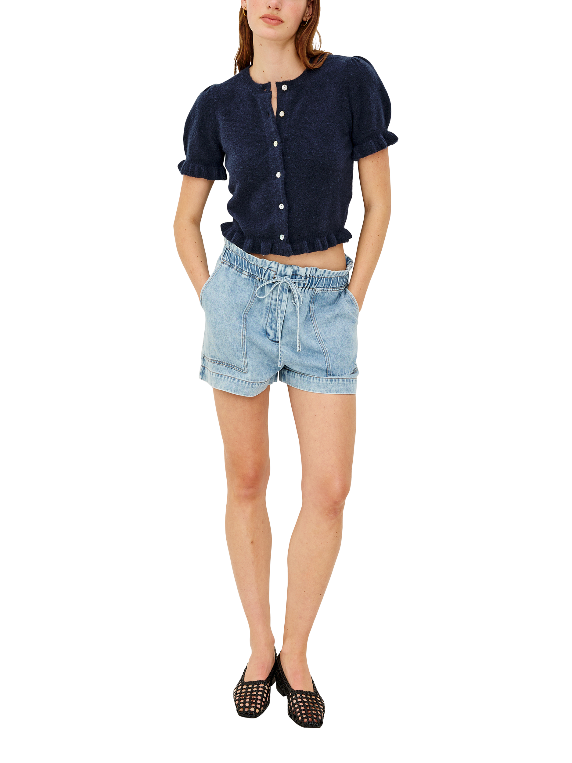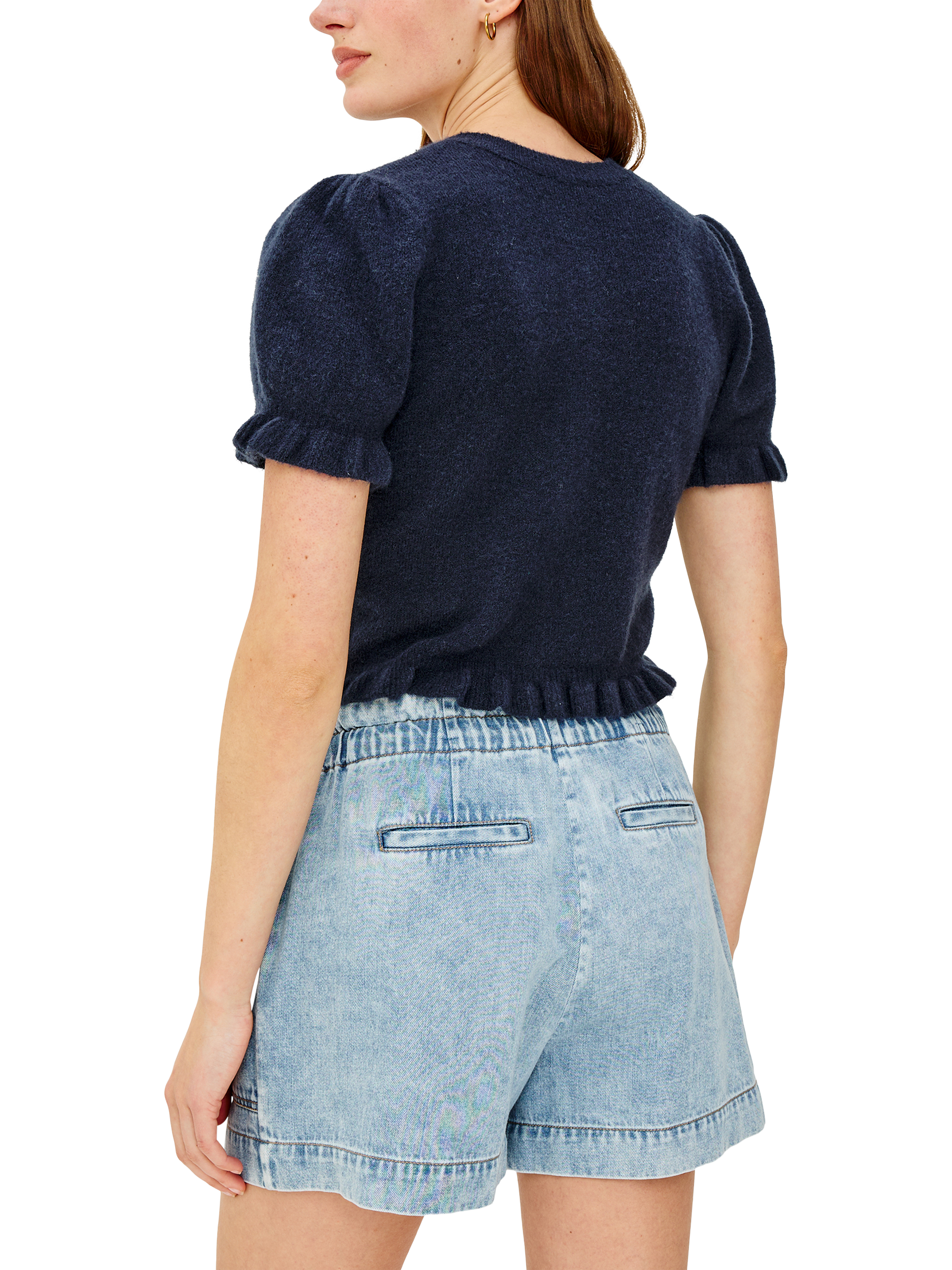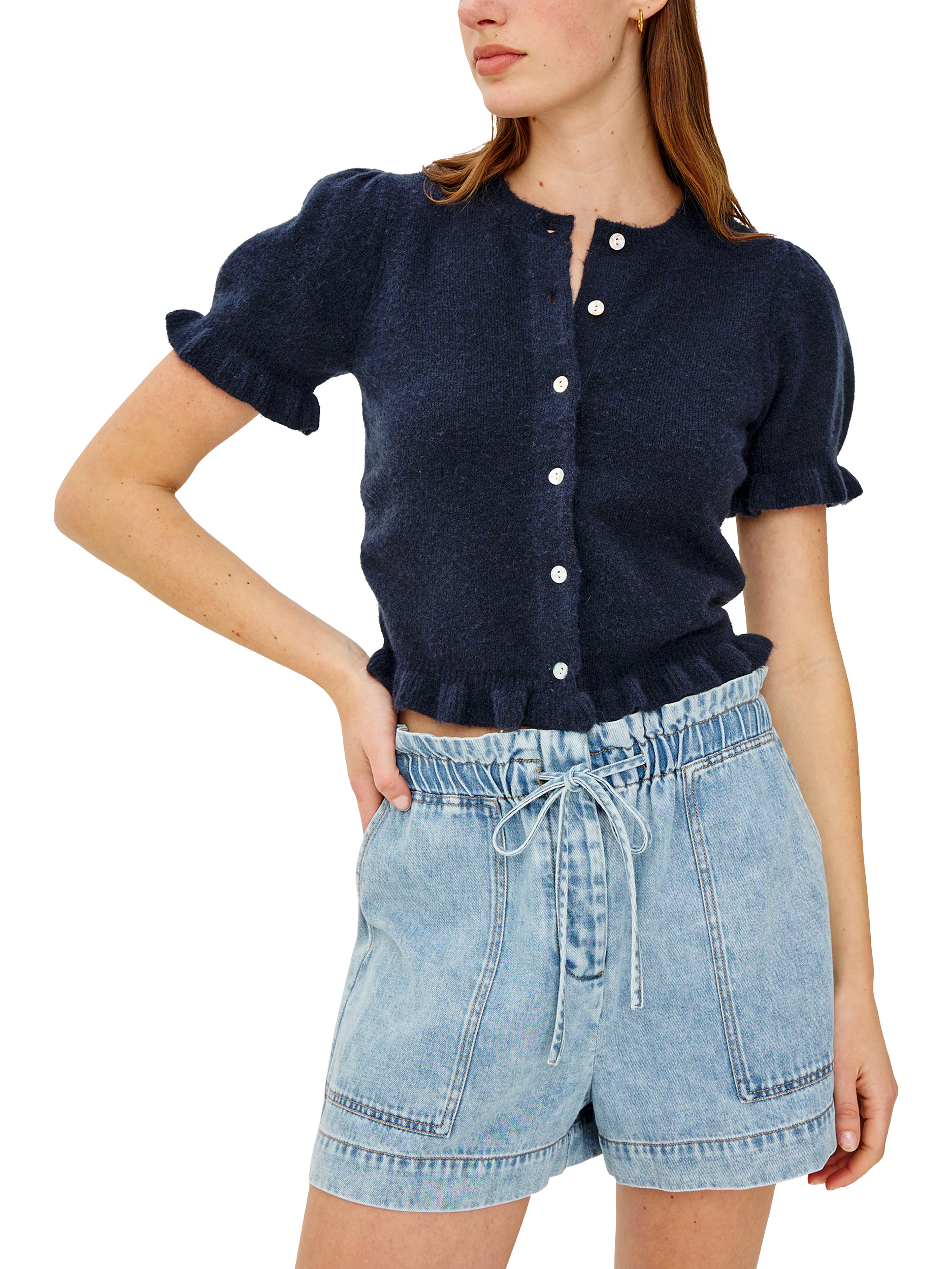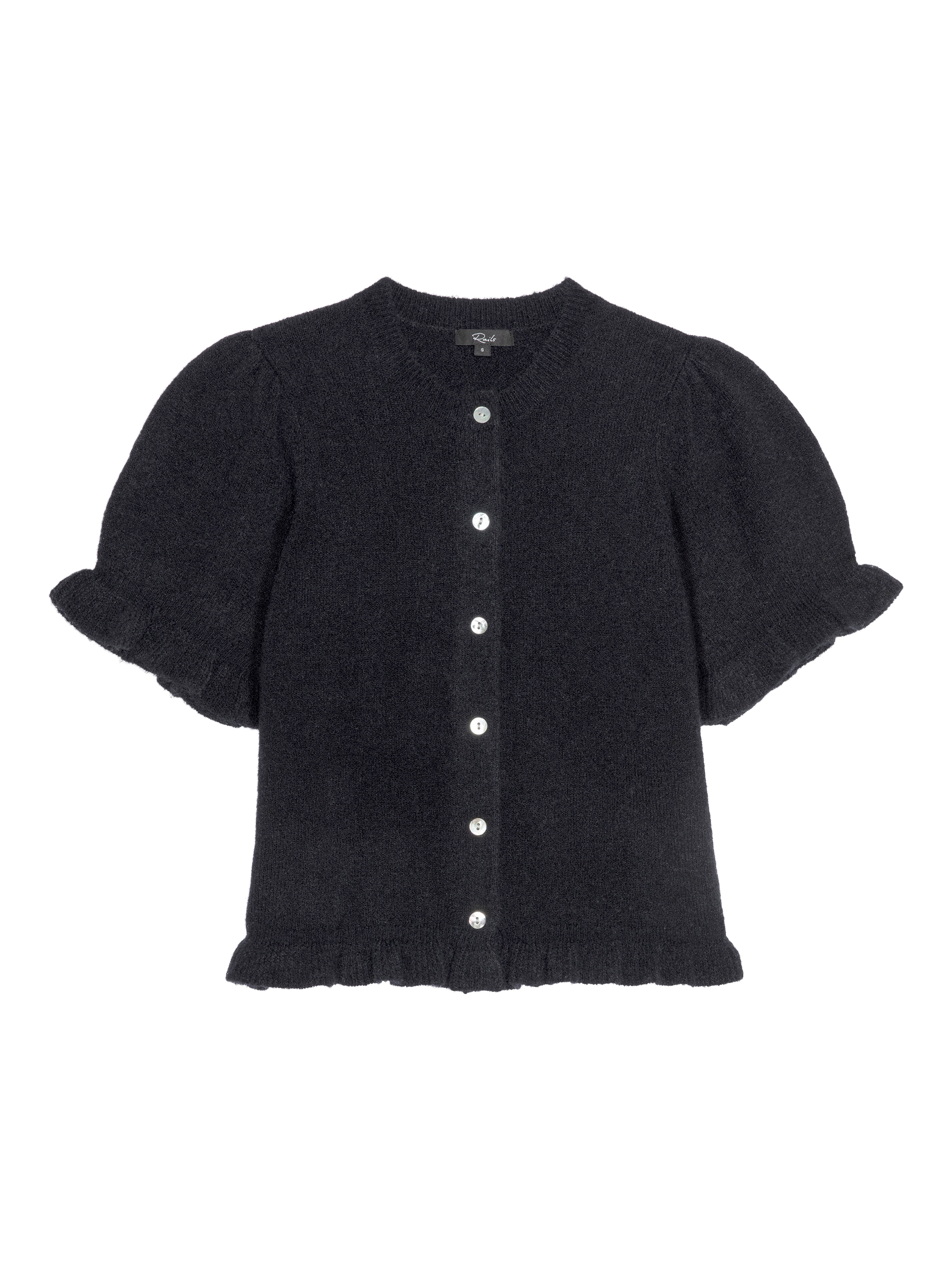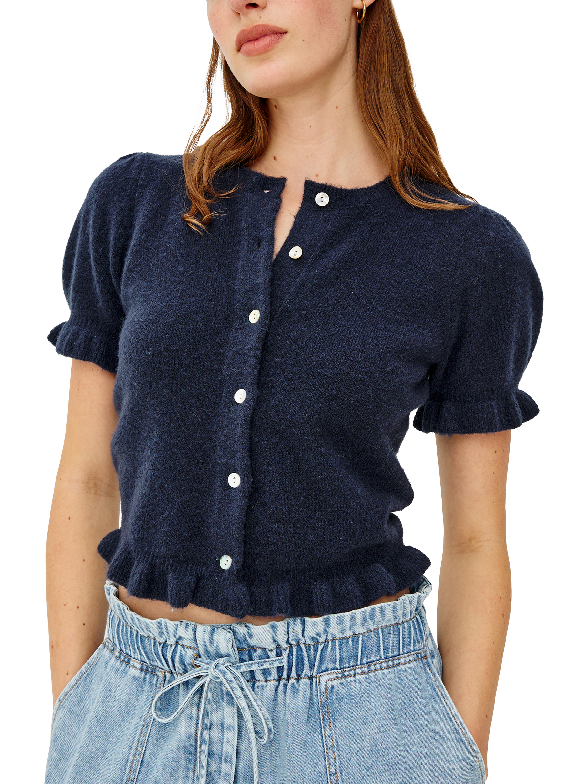 Crafted from a cosy knit blend, the Lora crewneck cardigan charms with front buttons and ruffle-trimmed short puff sleeves and hem.