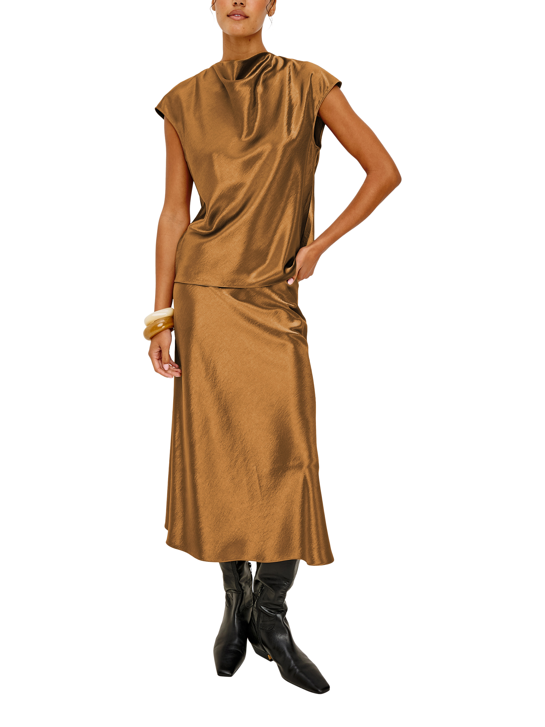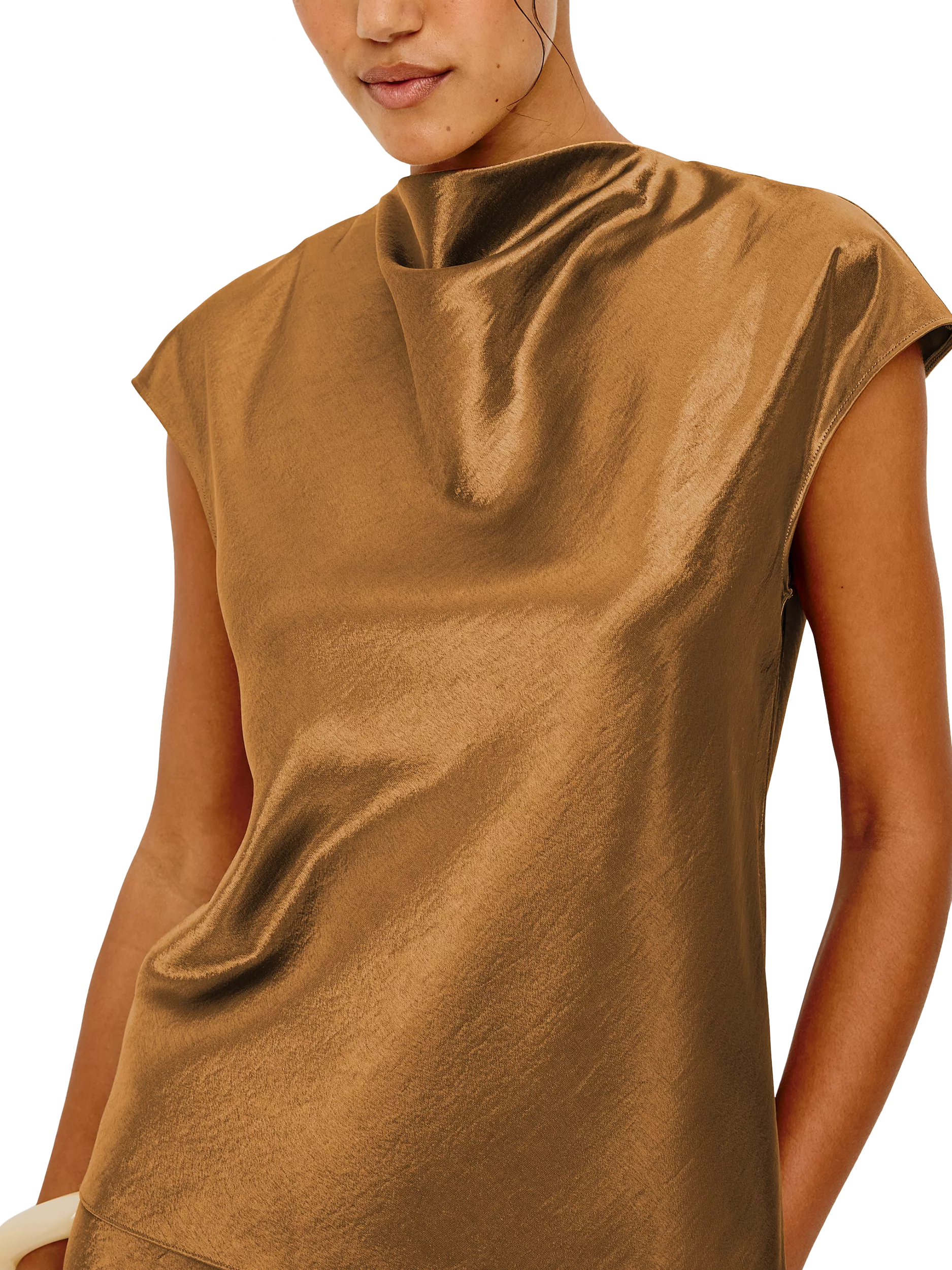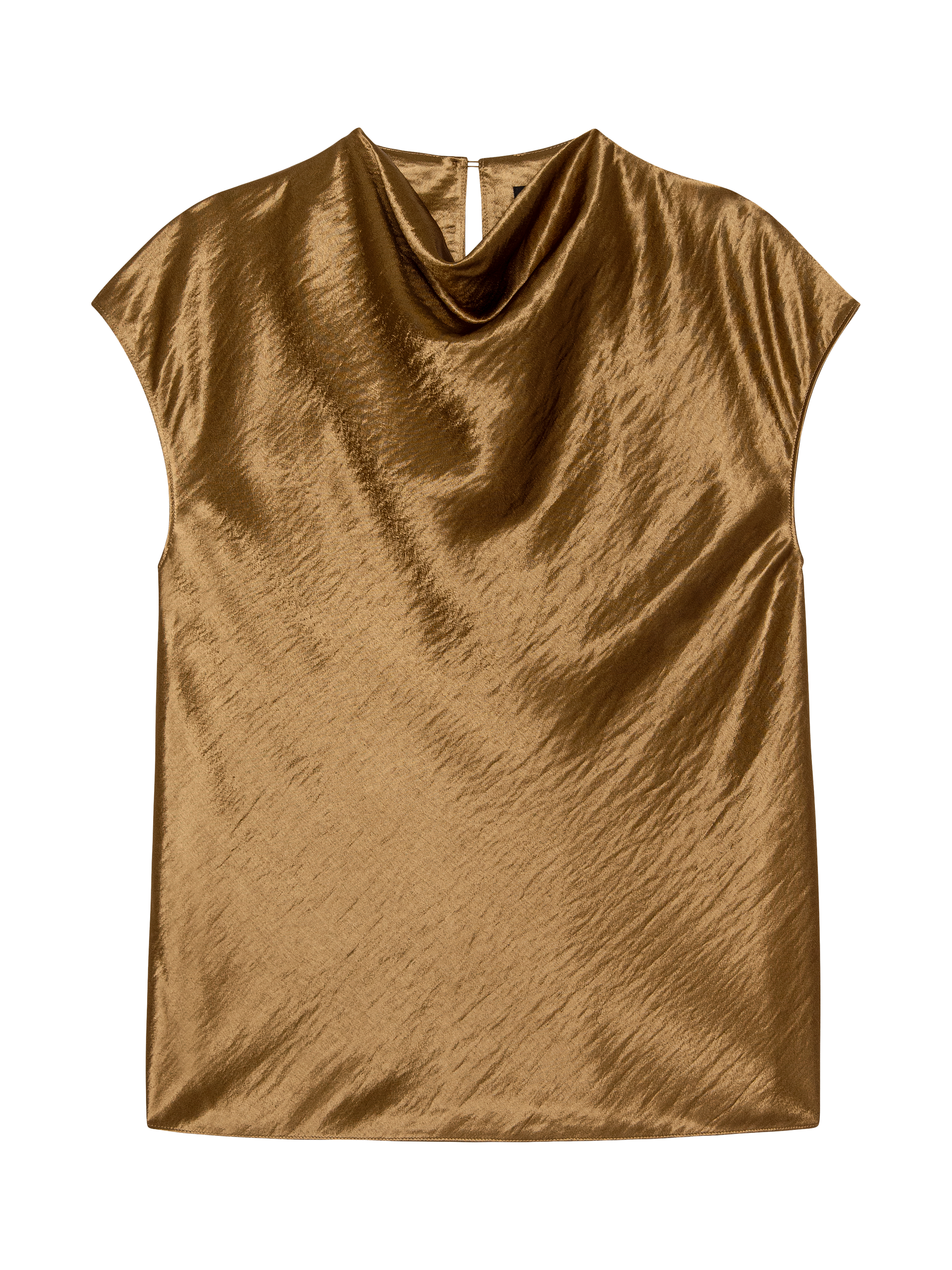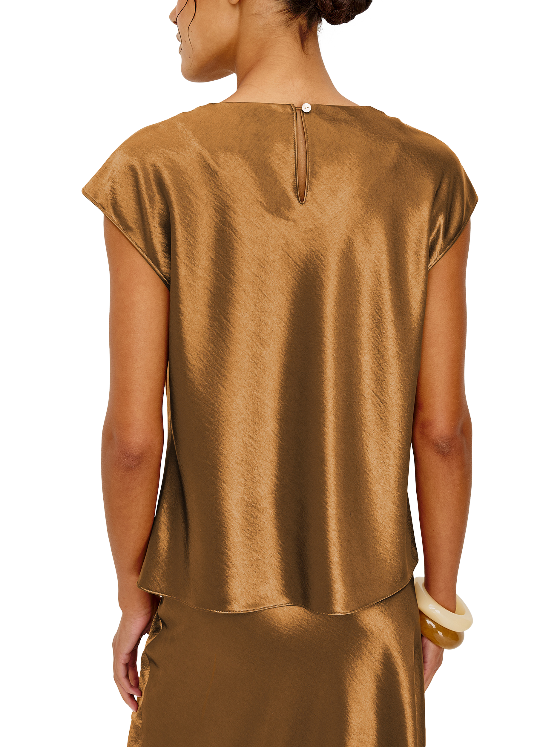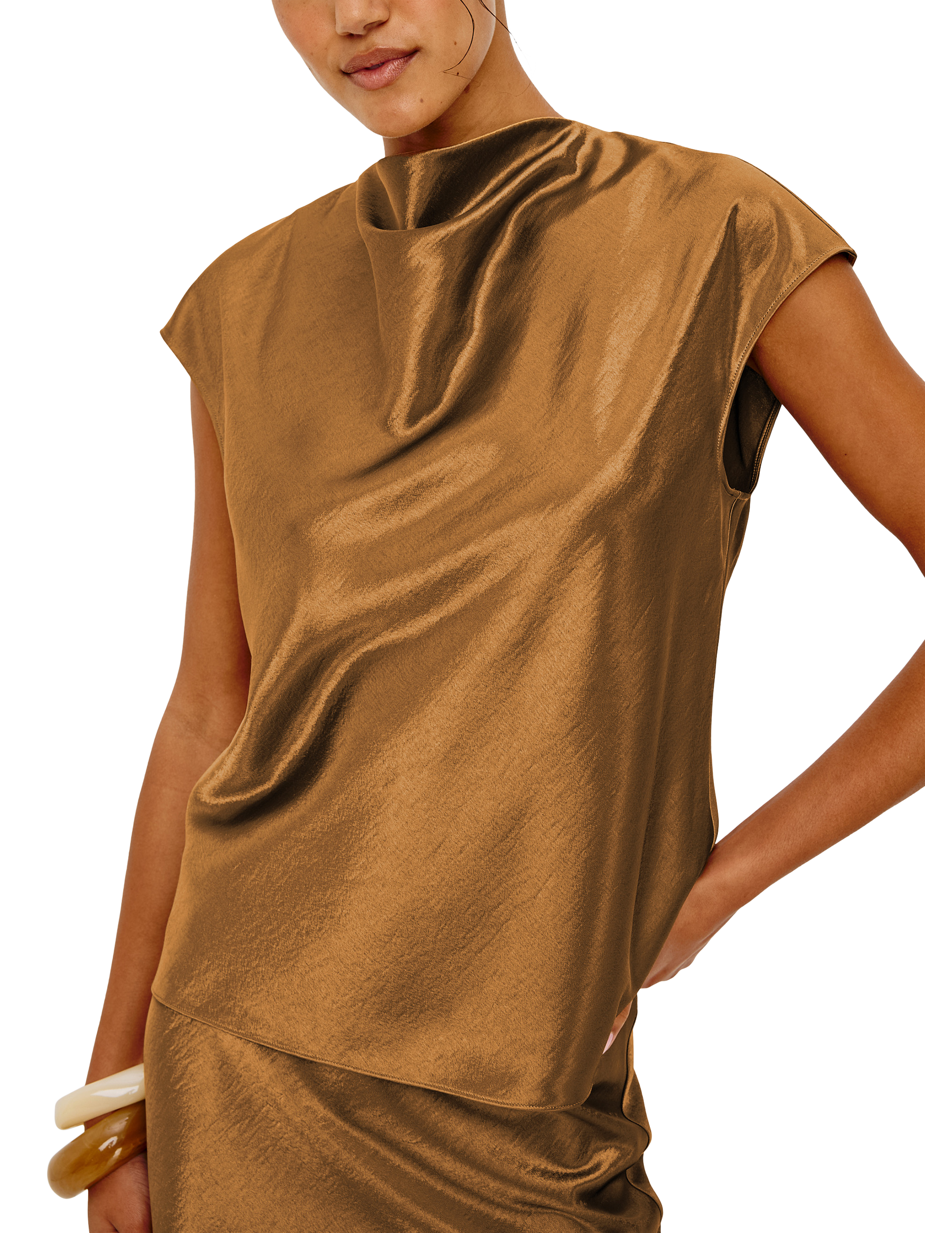 A dance of drape and detail, the Loretta glides with a luxuriously silky hand-feel and lustrous sheen. This versatile top features a cowl neckline, cap sleeves, and a buttoned keyhole back cutout.