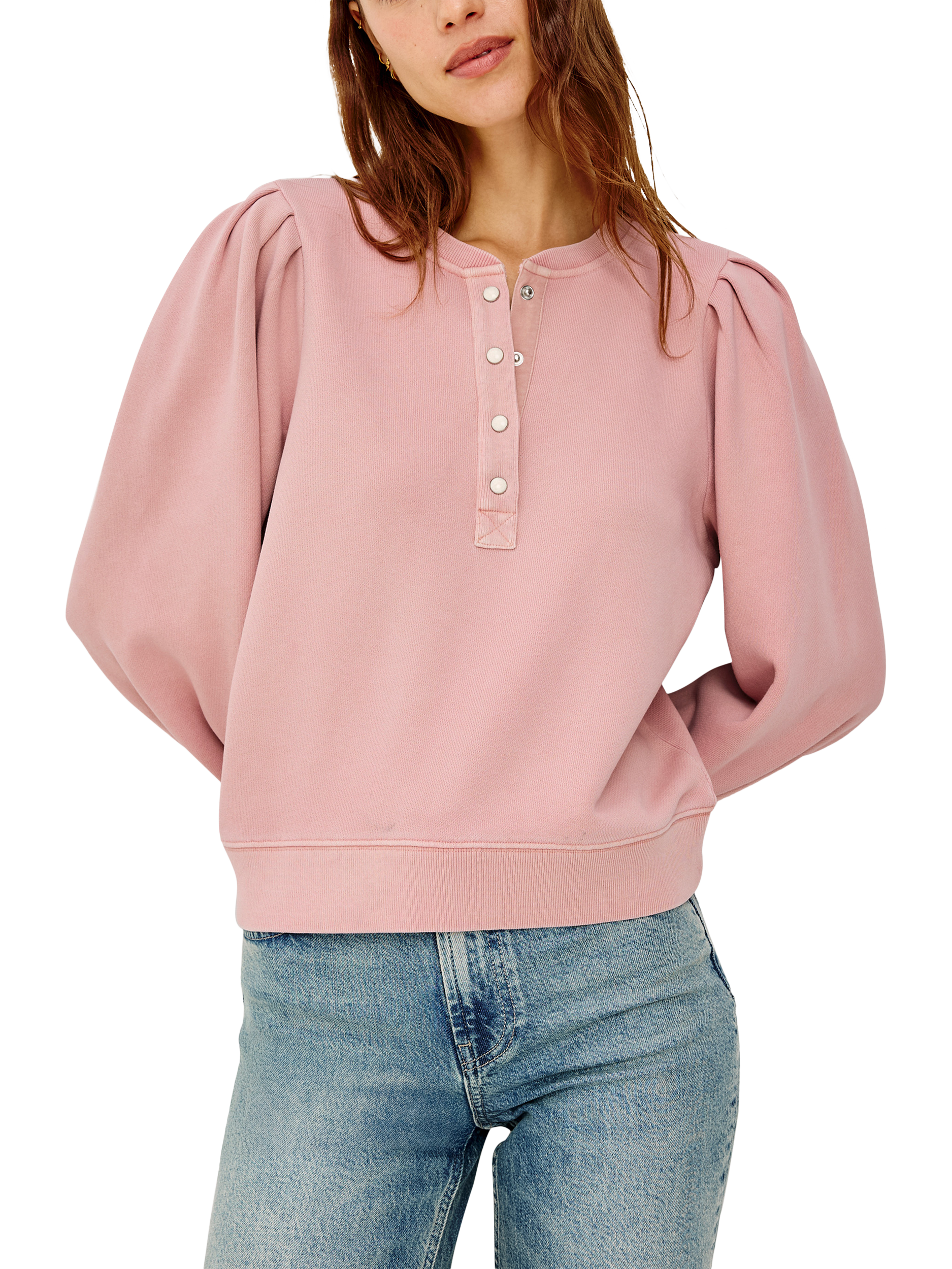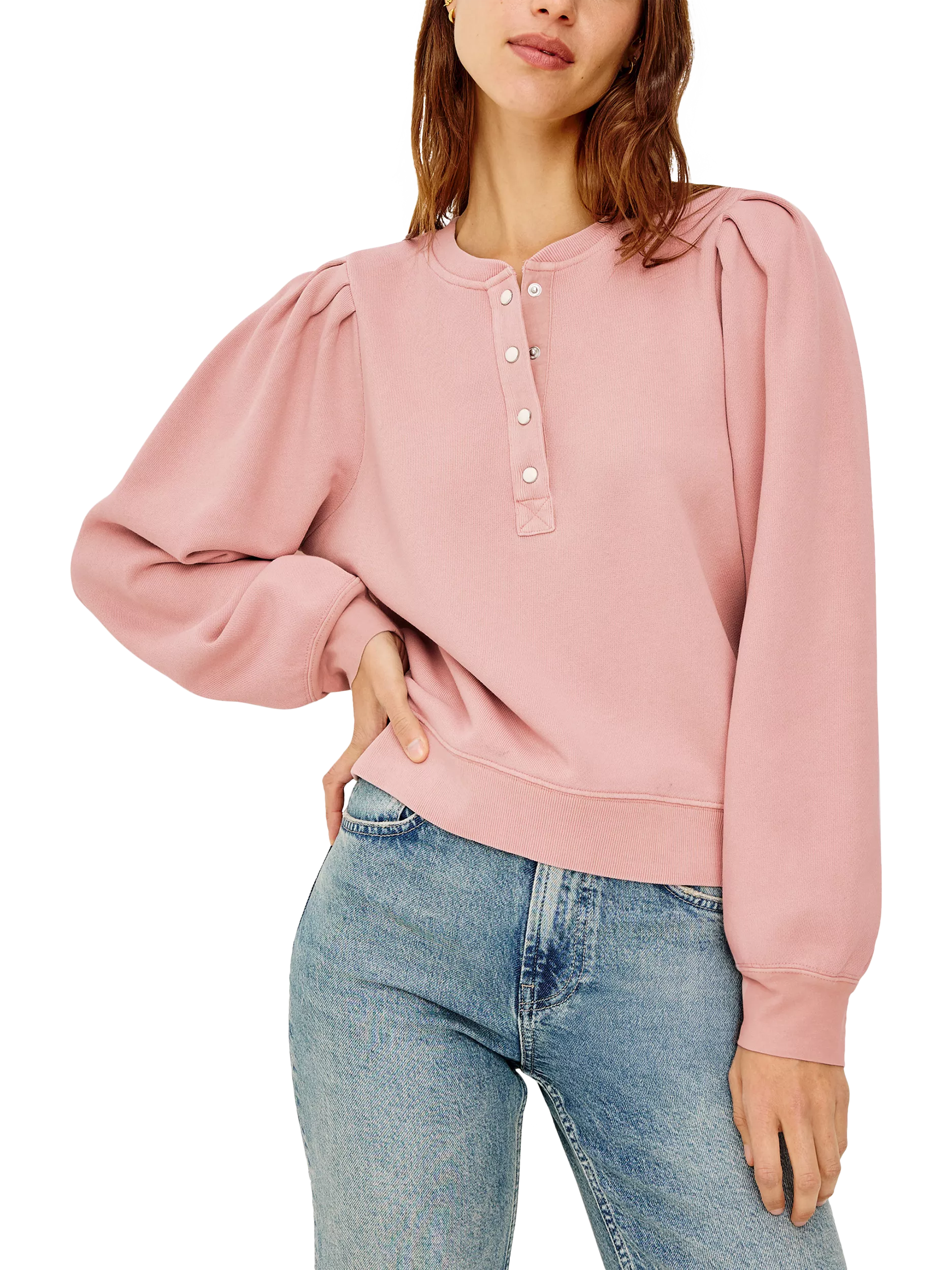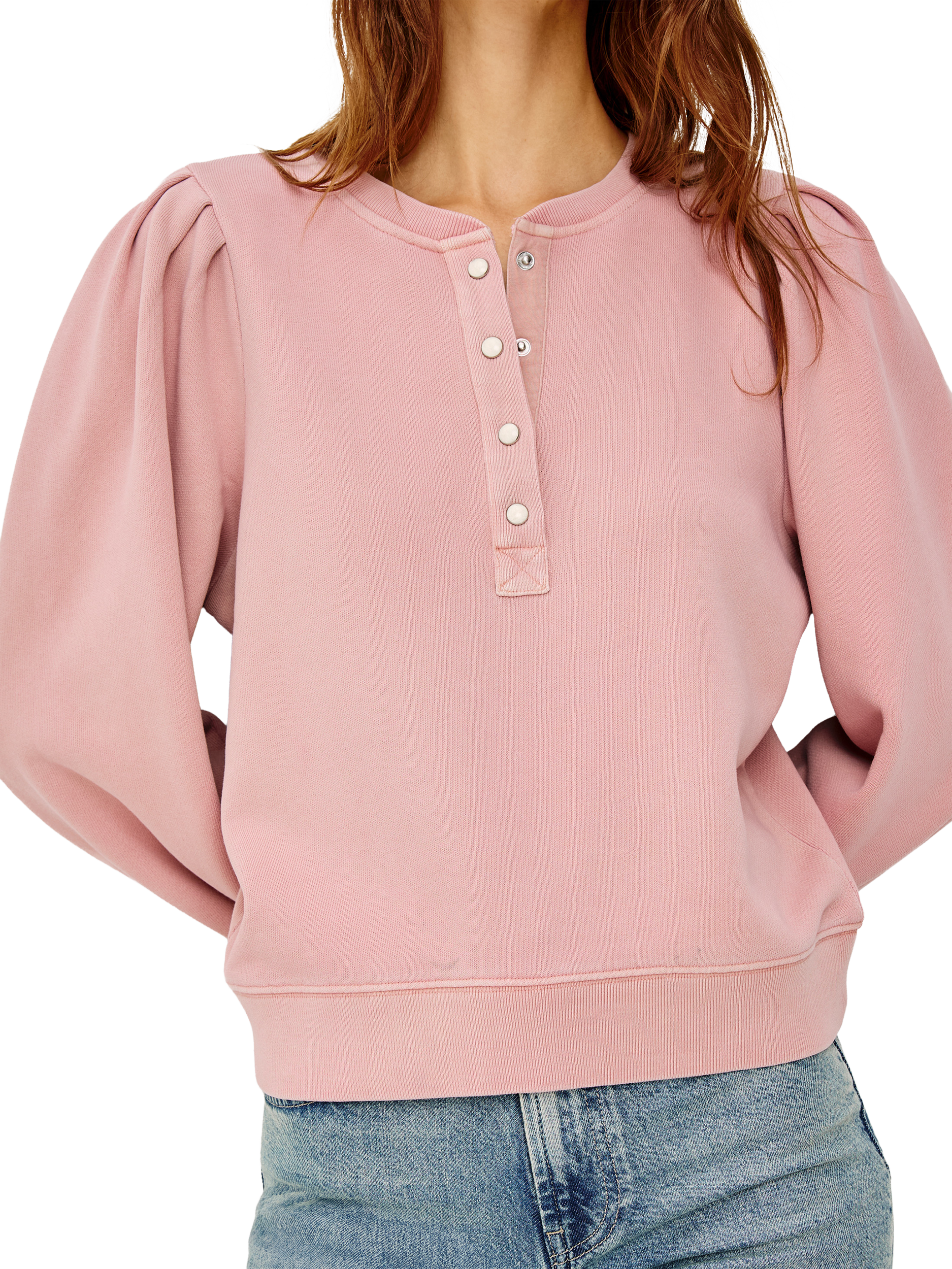 The Mariana is a warm, heavy terry sweater with a relaxed fit. It features billowing sleeves, a henley-style placket, and a classic crewneck for versatile, effortless style