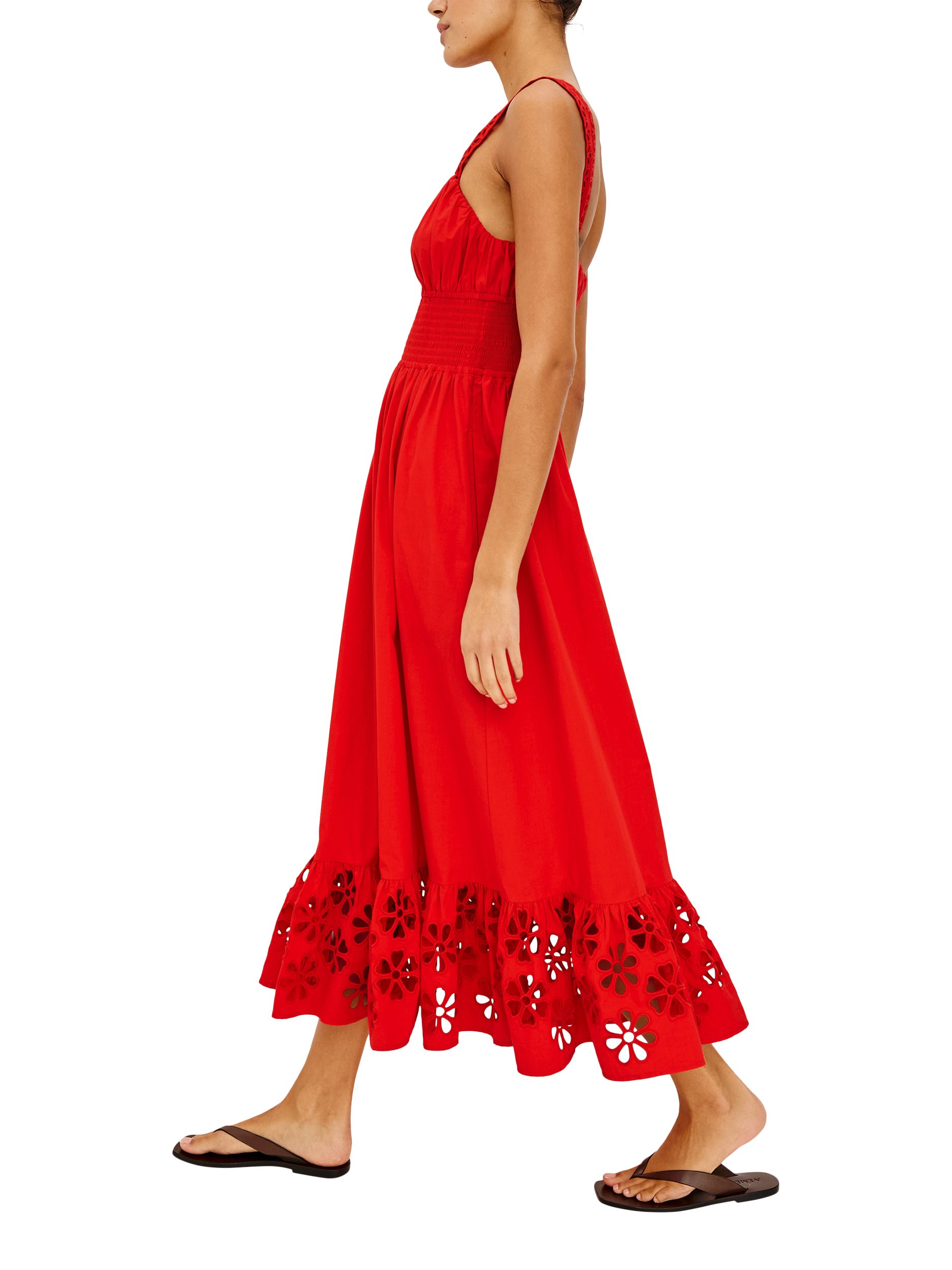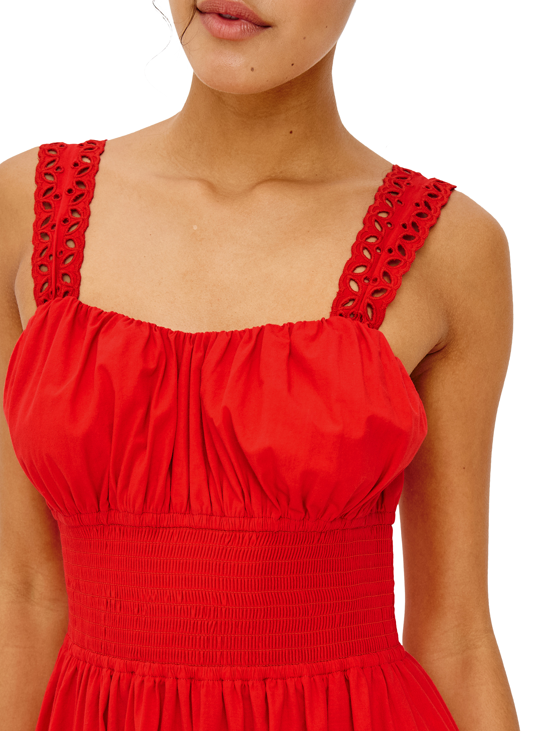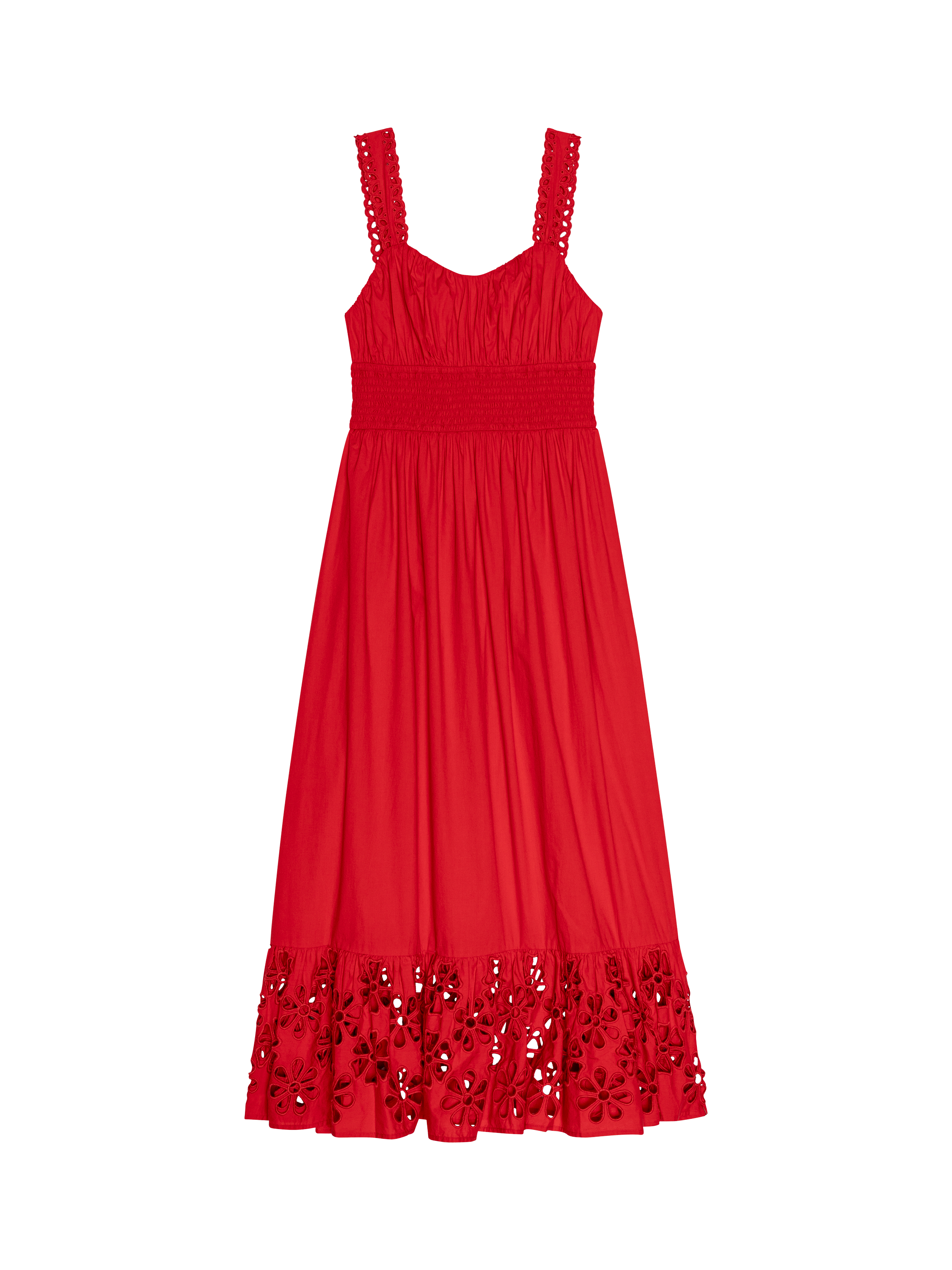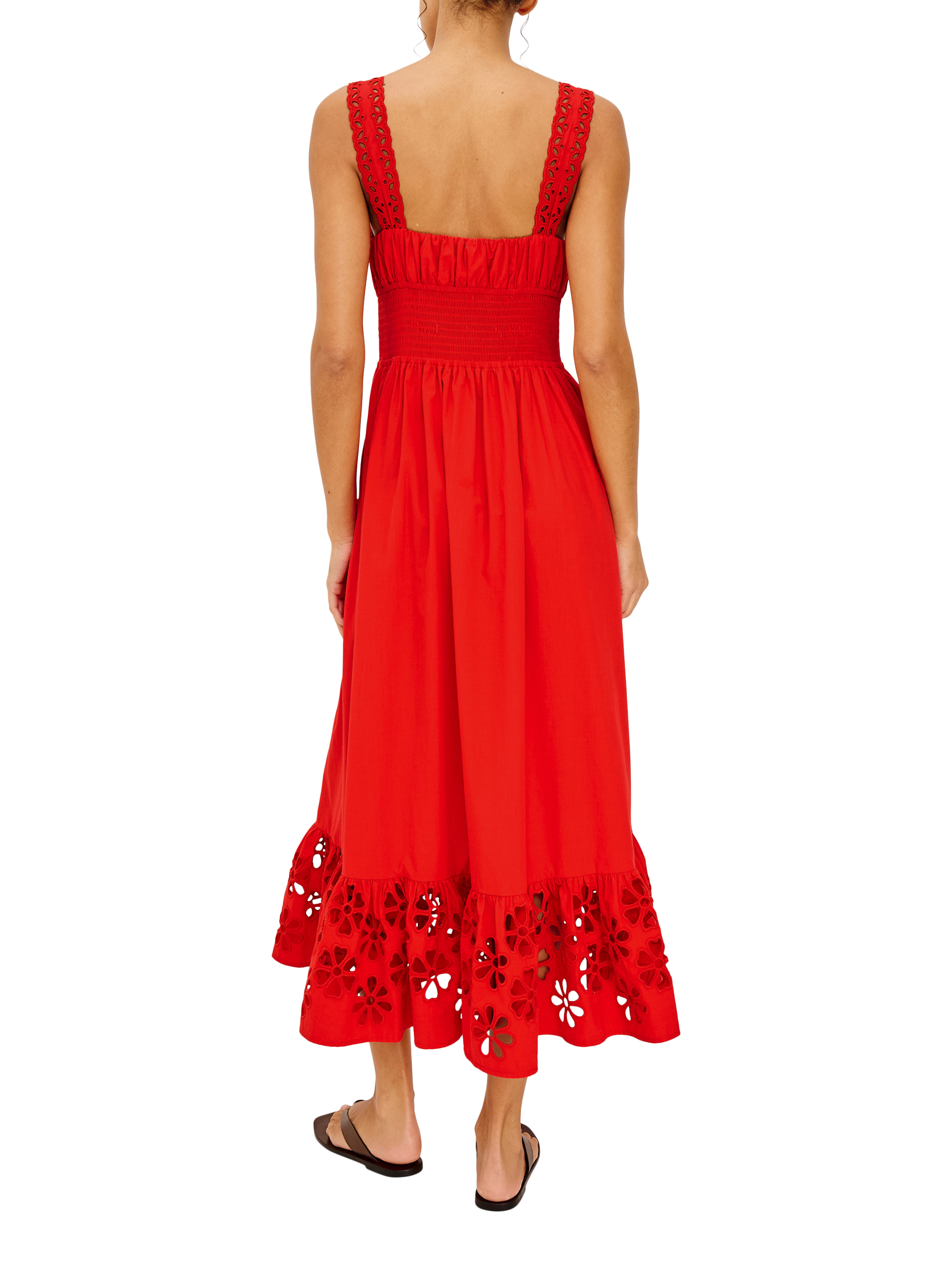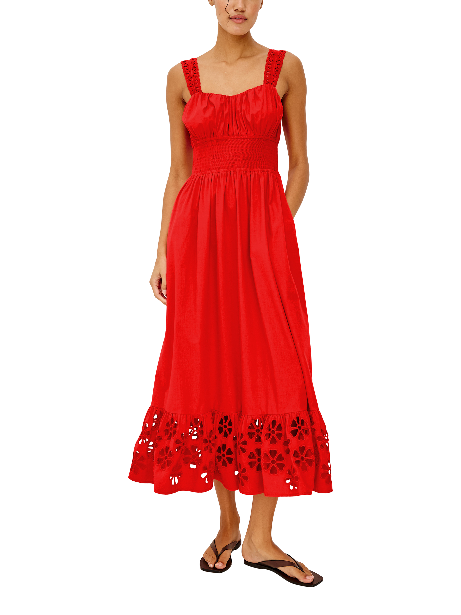 The Moira is a midi-length dress in crisp cotton poplin, featuring wide embroidered shoulder straps, a soft sweetheart neckline, a shirred bust, a smocked empire waist, and a fully lined skirt with intricate floral cutwork at the hem.