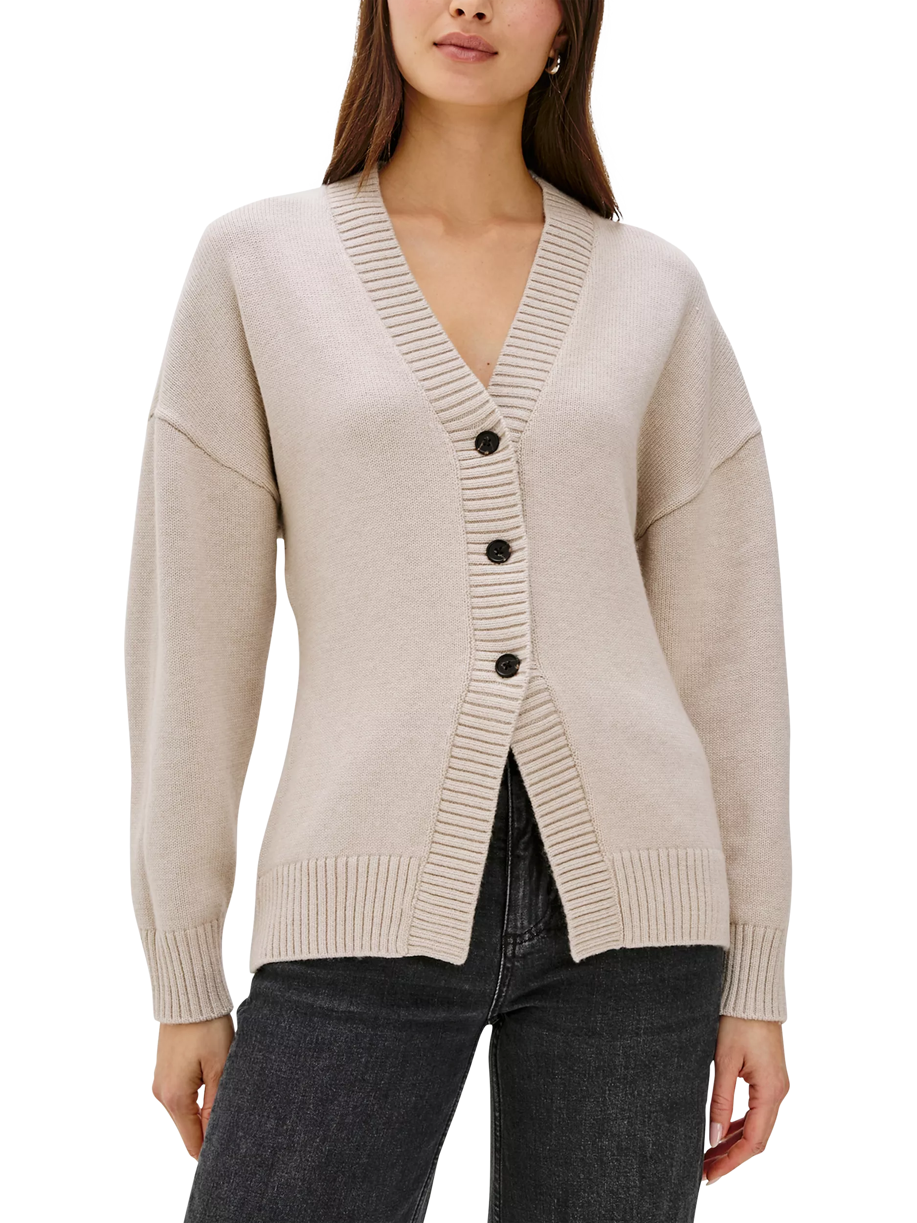 The Philippa is a longline cardigan in a soft-yet-substantial cotton-blend. A drop shoulder and cutaway detail at the front give it an especially flattering fit.
