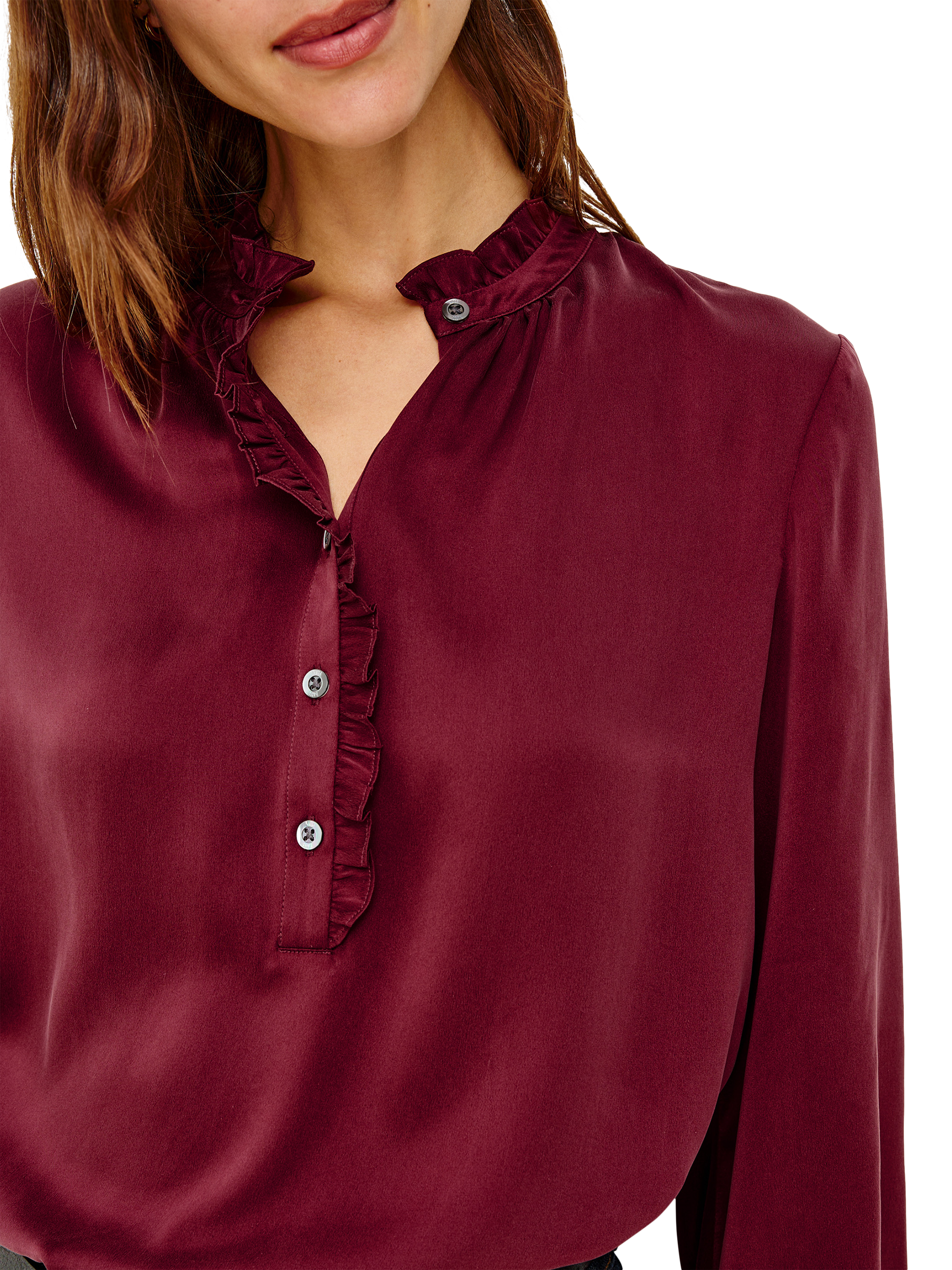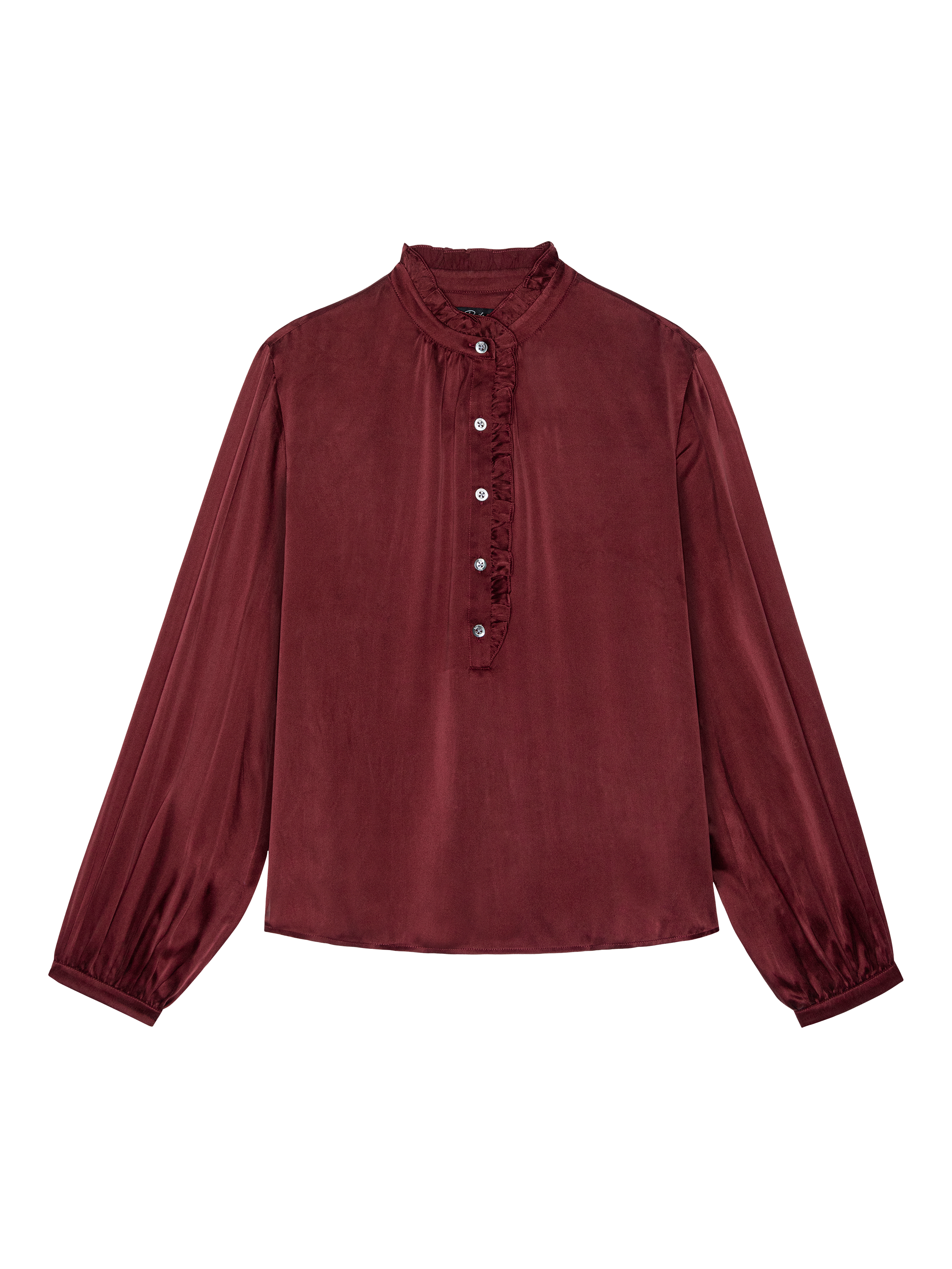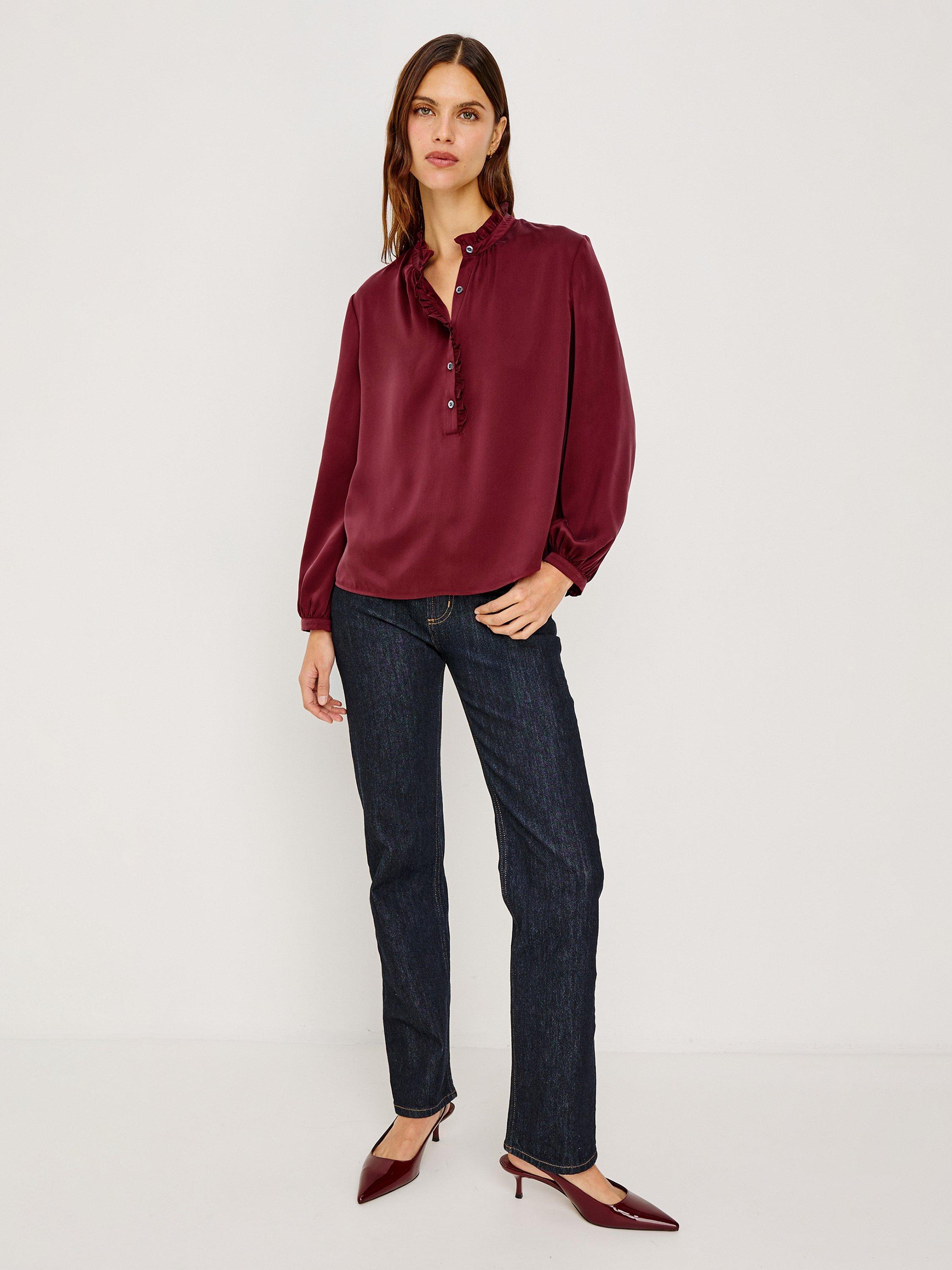 The Sien transforms every moment with a flowing silhouette in luxurious silk charmeuse. It features a ruffled high neckline, classic button placket, and billowing sleeves gathered at fitted cuffs for a polished finish.