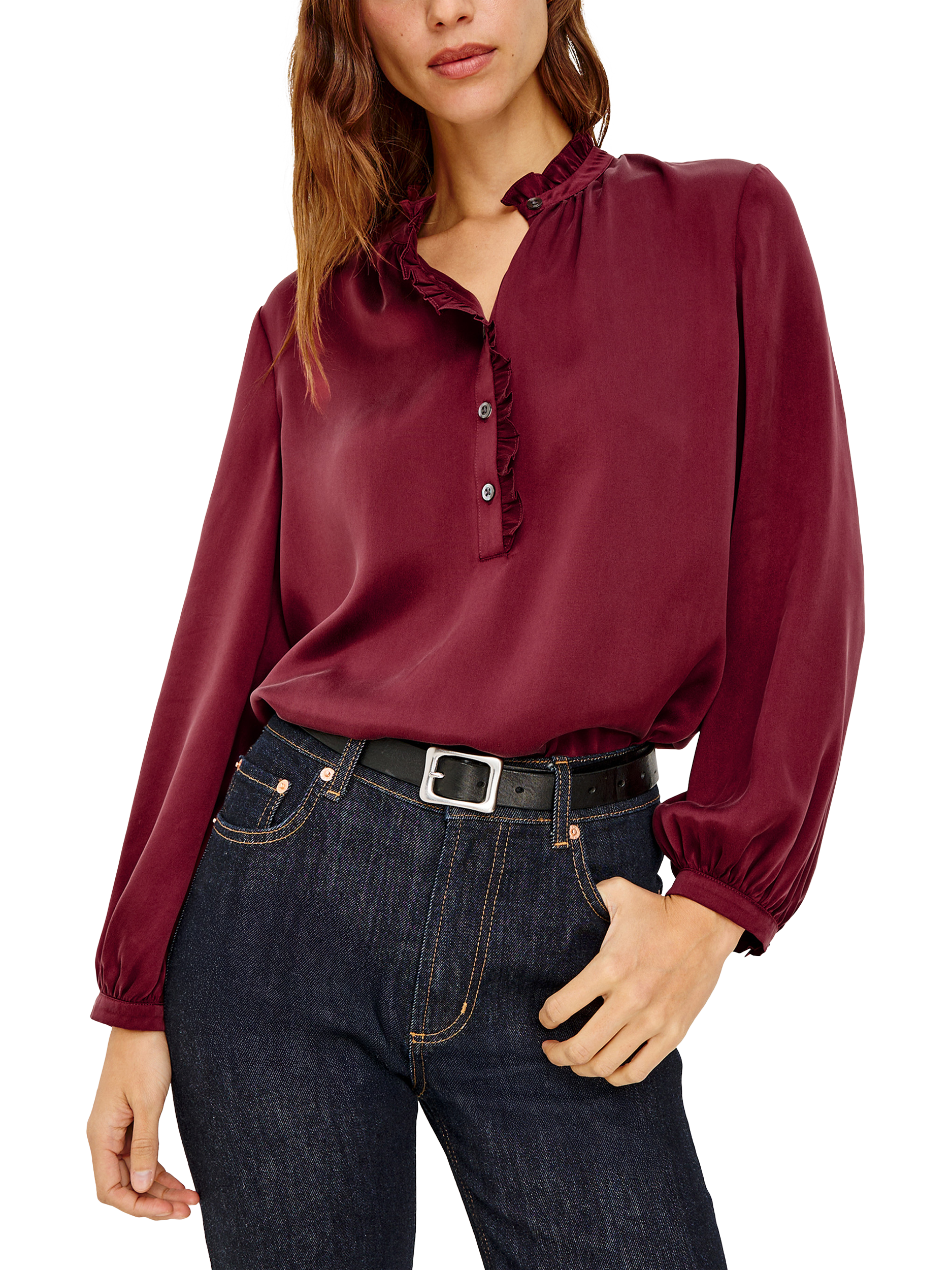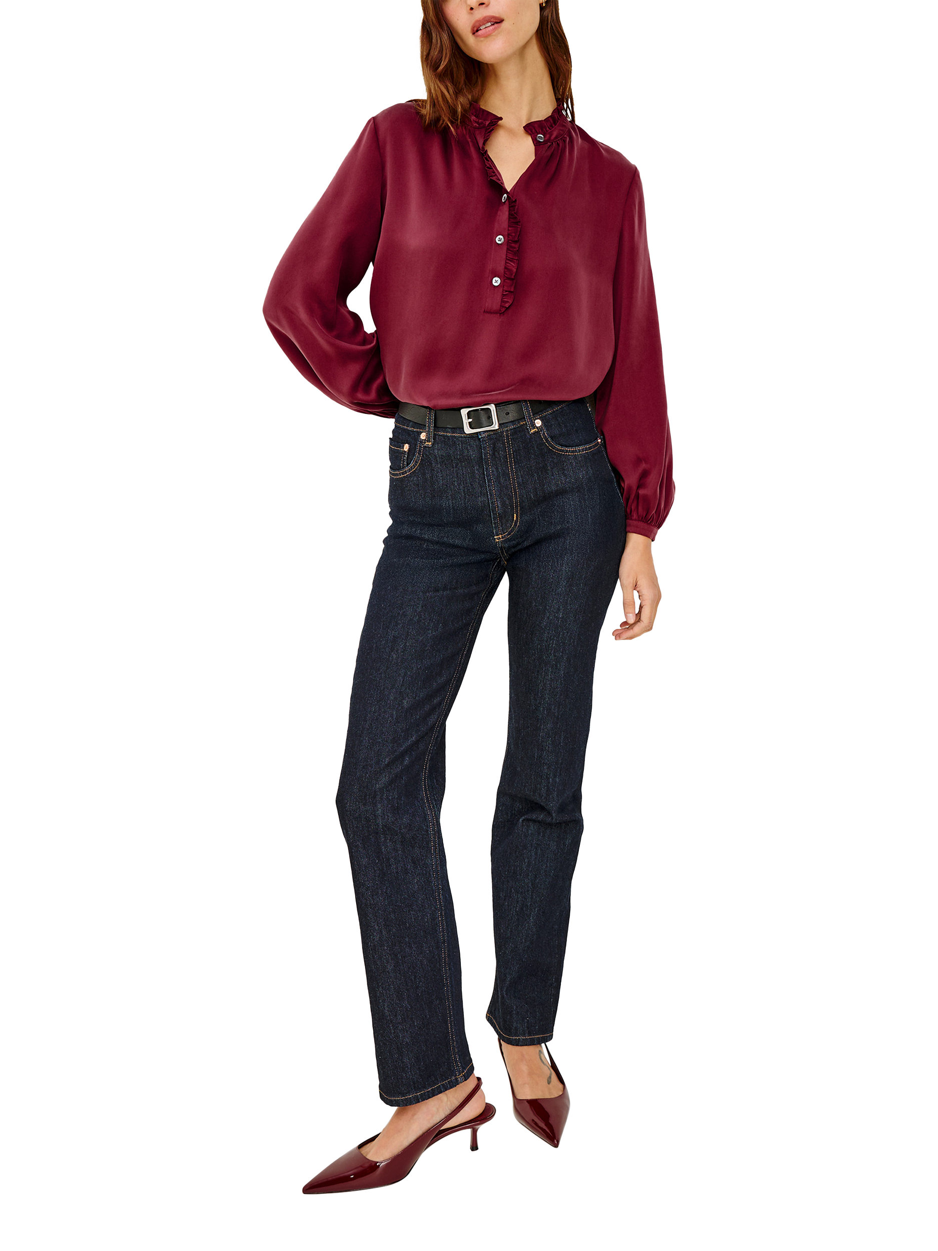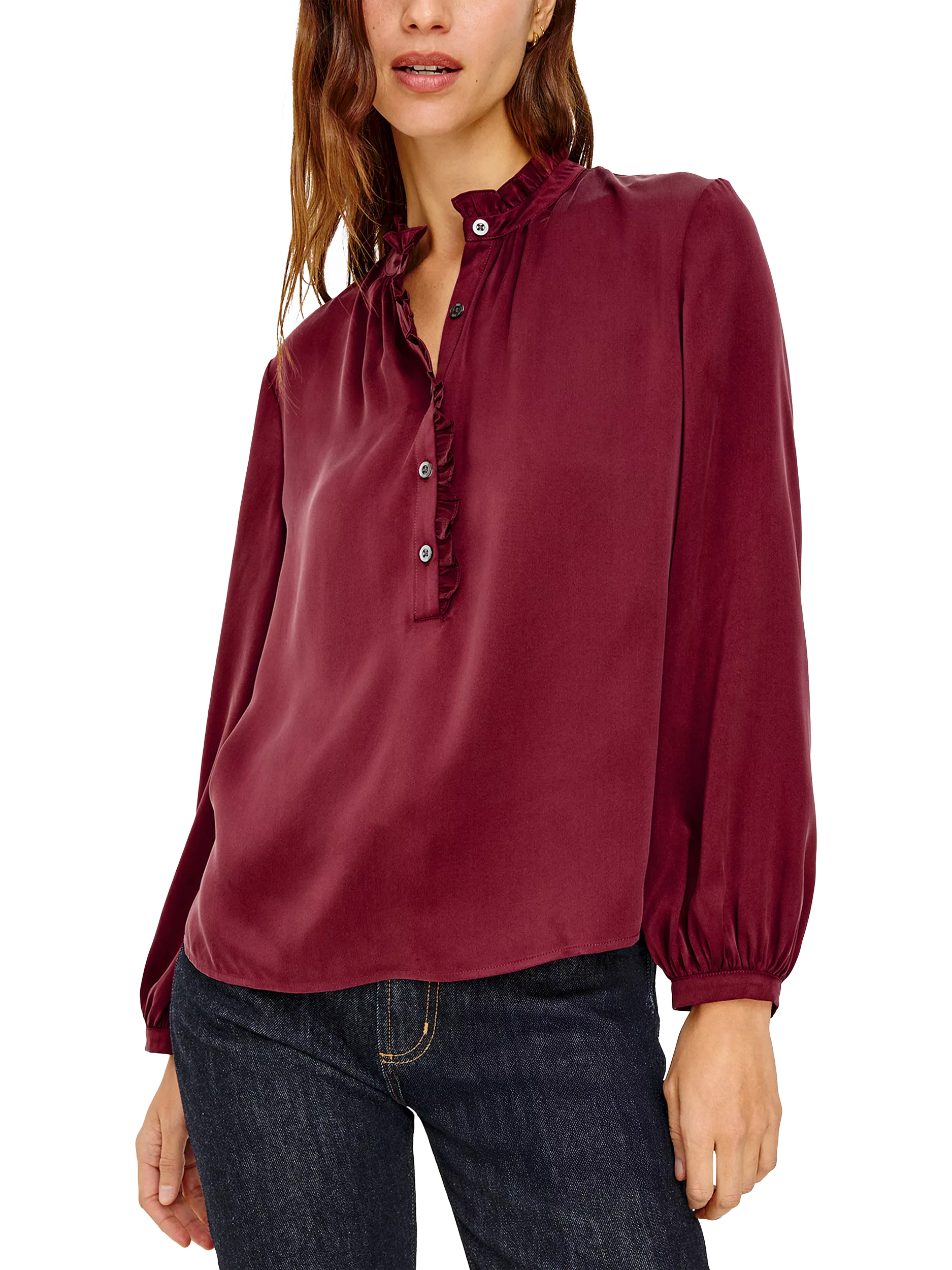 The Sien transforms every moment with a flowing silhouette in luxurious silk charmeuse. It features a ruffled high neckline, classic button placket, and billowing sleeves gathered at fitted cuffs for a polished finish.