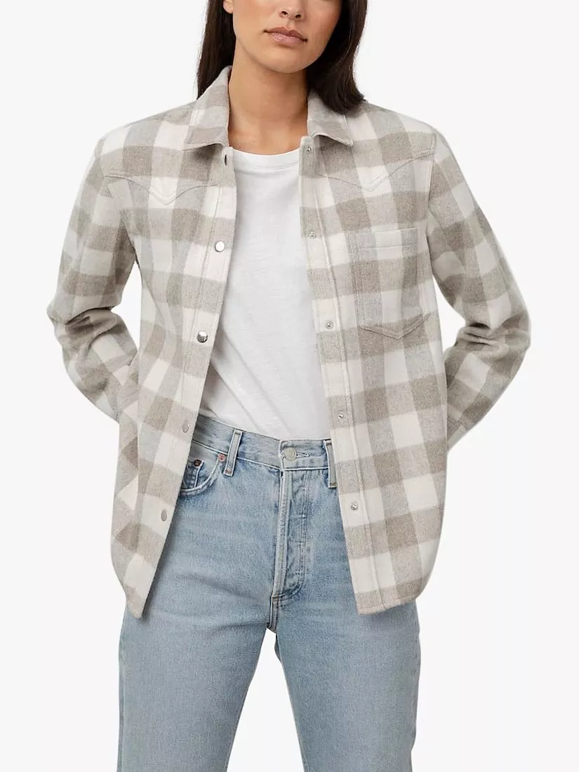 Heavyweight, brushed flannel, long sleeve, soft ivory collared buttondown shirt jacket featuring wheat beige plaid design, oversized fit, western yoke details, patch pocket at chest, and metal snap buttons. This classic throw-on-and-go style is perfect for transitional temps.
