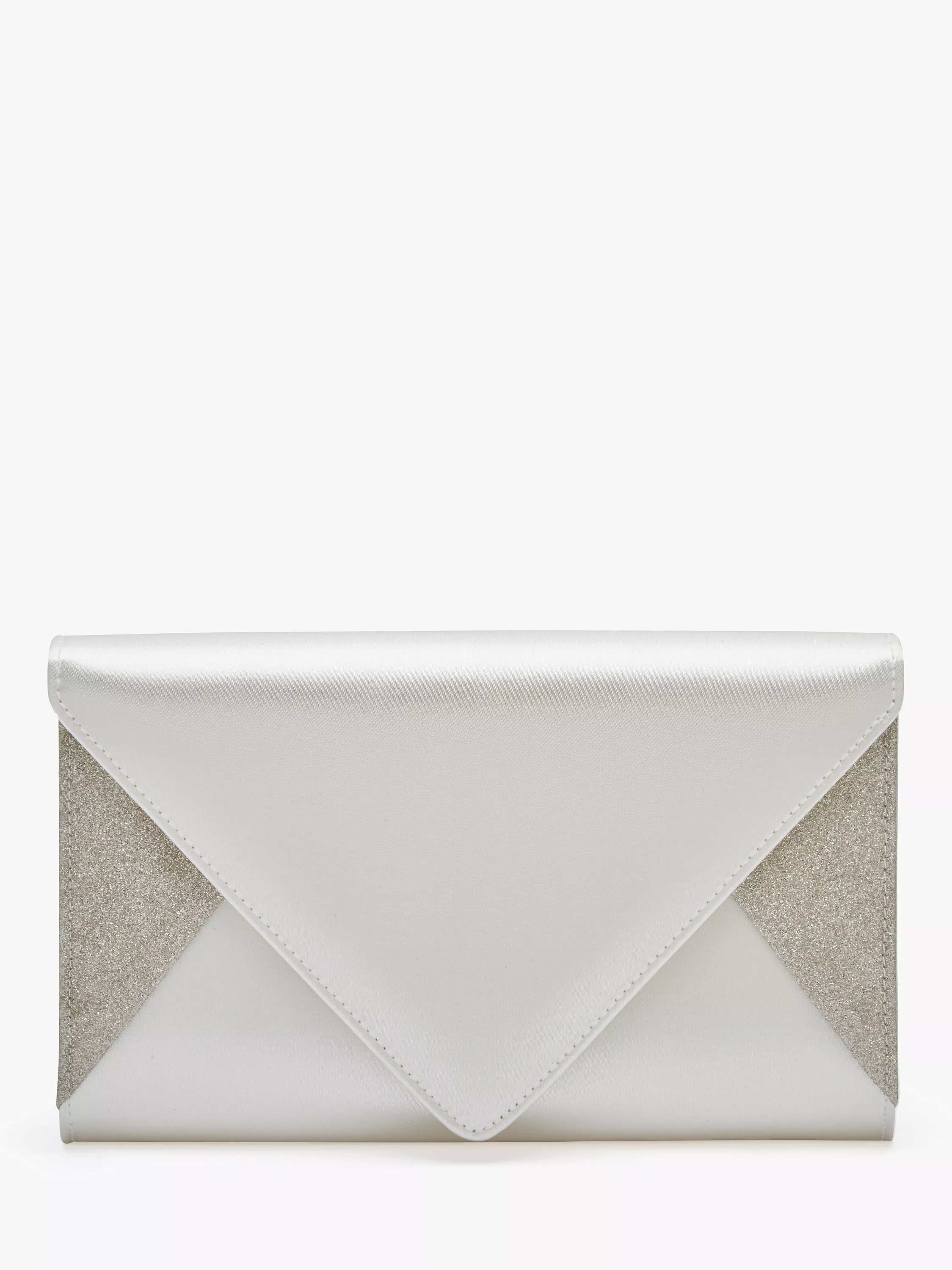 A shimmering clutch handbag from Rainbow Club with satin overlays and a contemporary envelope design.