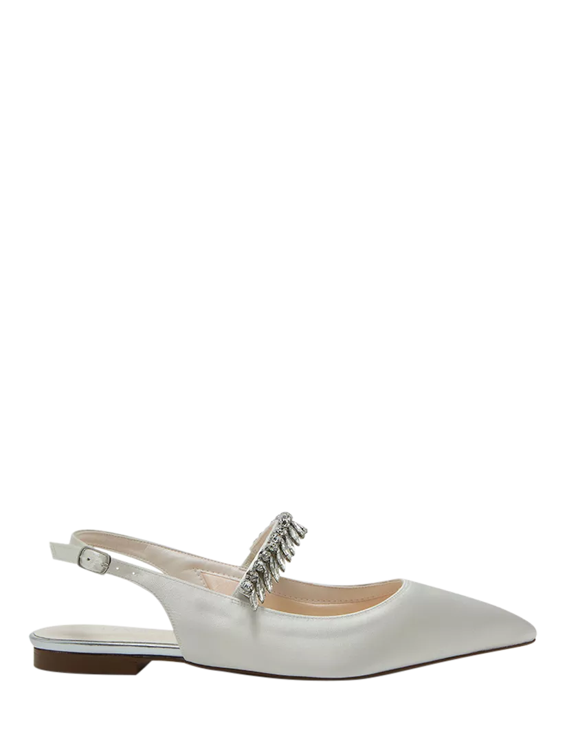 Freya is a true Rainbow Club icon. This pointed pair has a crystal-encrusted strap across the top of the foot. Buckled flat slingbacks, beautifully crafted from lustrous ivory satin.