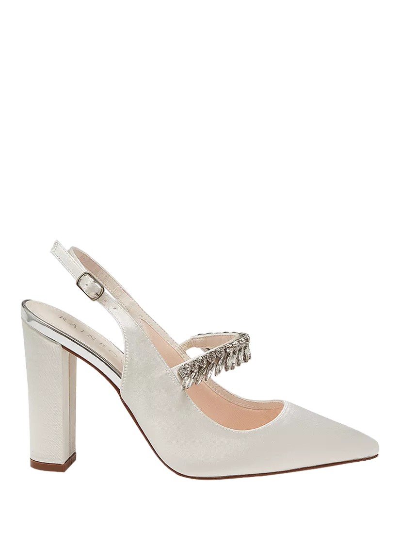 Freya is a true Rainbow Club icon. This pointed pair has a crystal-encrusted strap across the top of the foot. Buckled slingbacks, set on a 10cm block heel, beautifully crafted from lustrous ivory satin. They can be paired up with our matching Nova Clutch. The Freya is also available in a Standard Fitting.