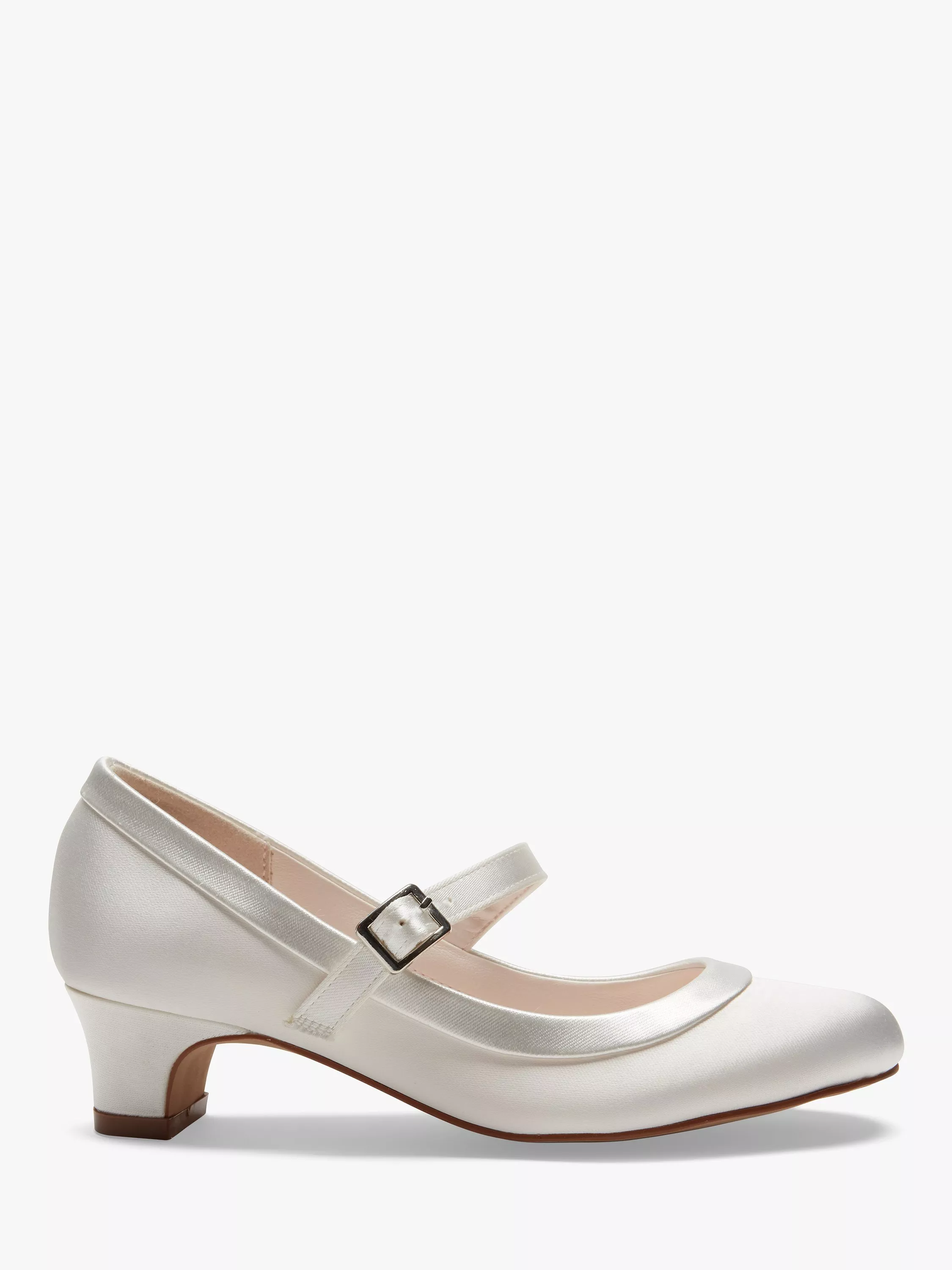 Cute and classic, Maisie is the perfect shoe for little bridesmaids who want to wear a small heel. Crafted from beautiful ivory satin, these low-heeled shoes feature a pretty floral print lining and are finished with a strap across the foot and a wide overlay trim in matching ivory satin.