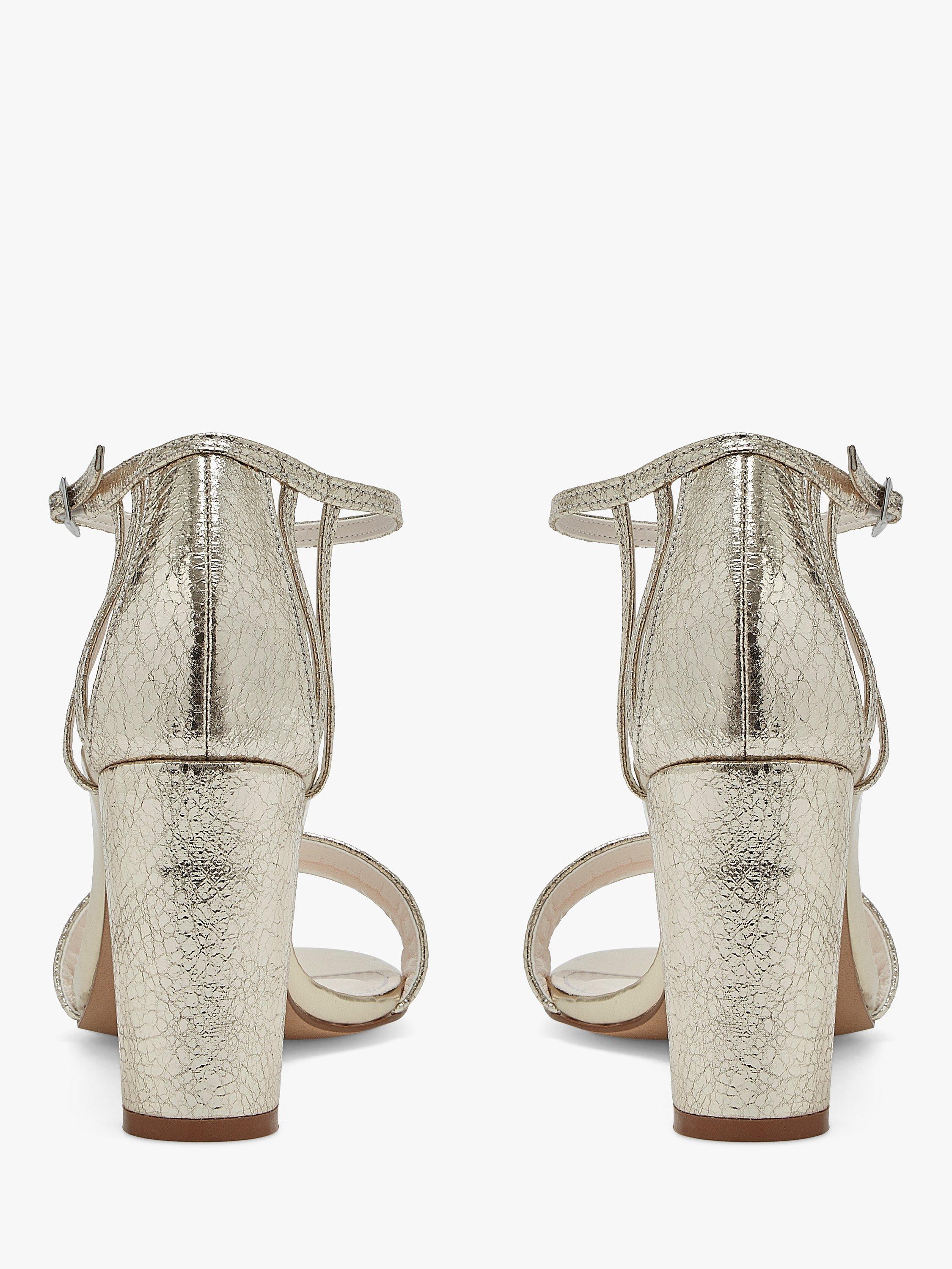 The perfect shade of sparkling champagne, these beautiful occasion shoes have a single strap over the toes, a vintage-inspired caged back of the heel, a silver buckle ankle strap and a dance-all-night block heel.