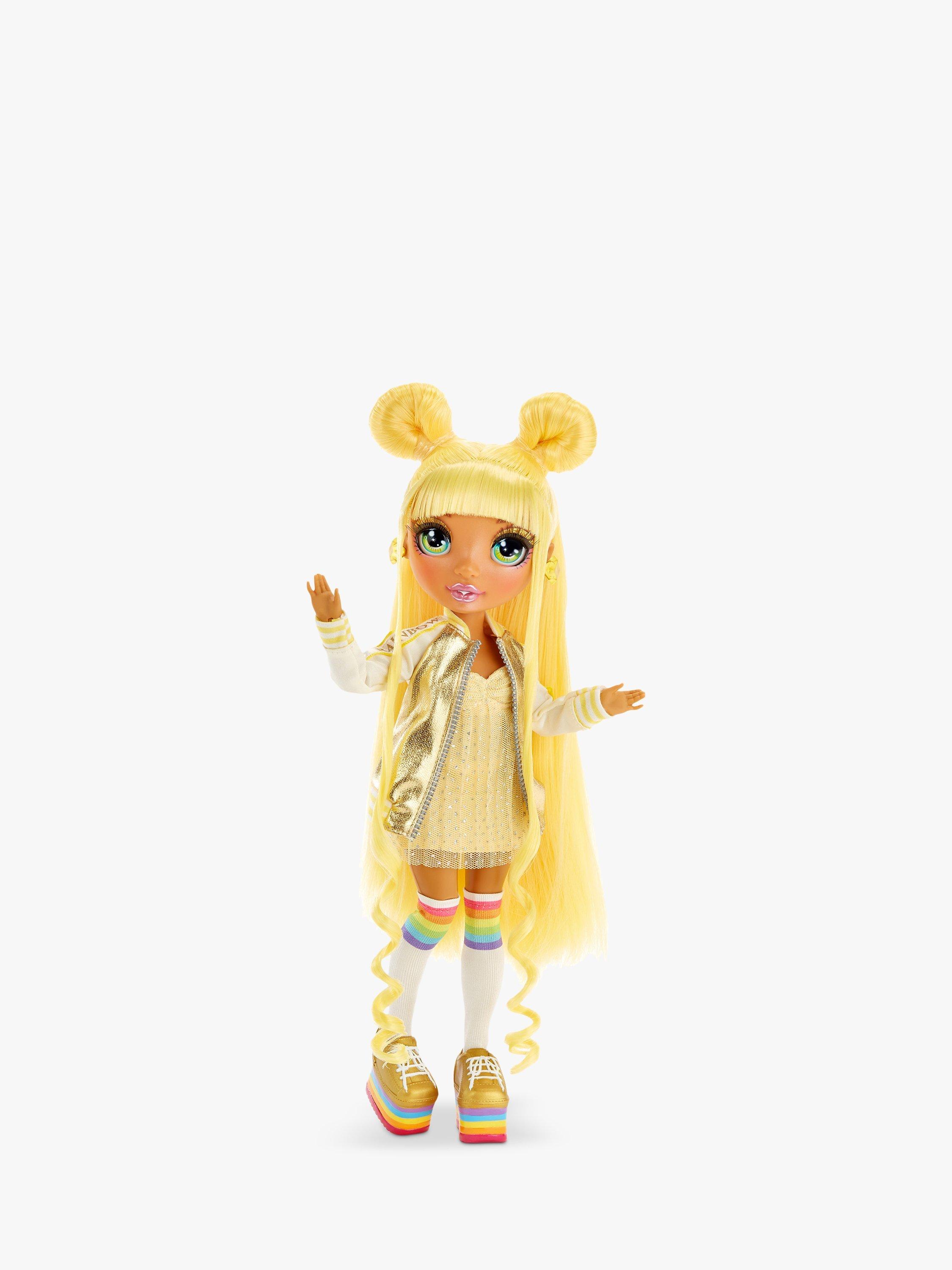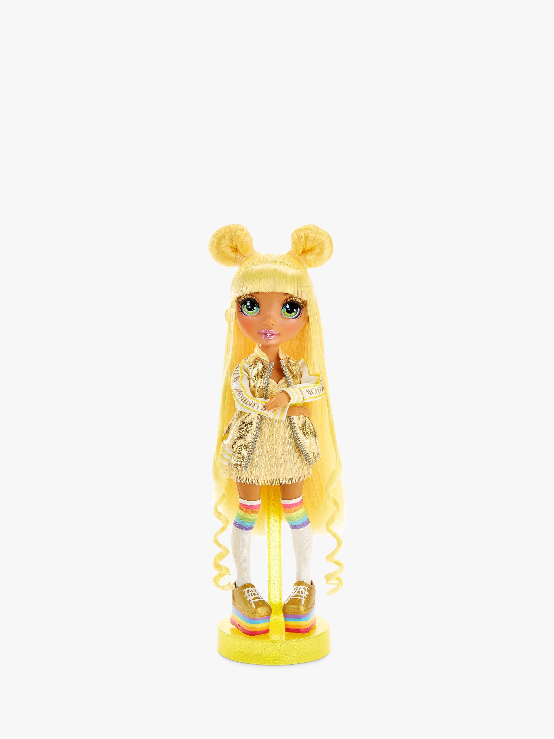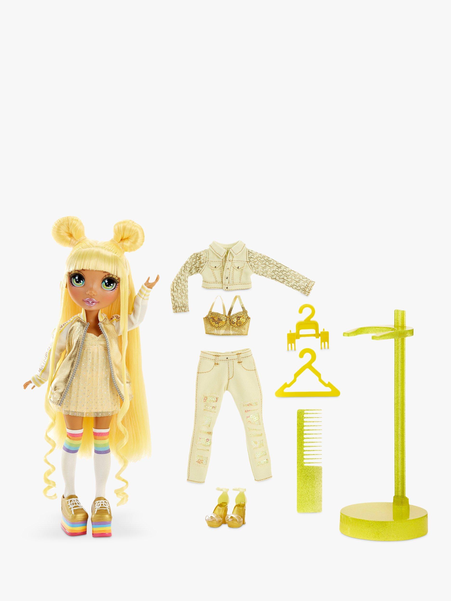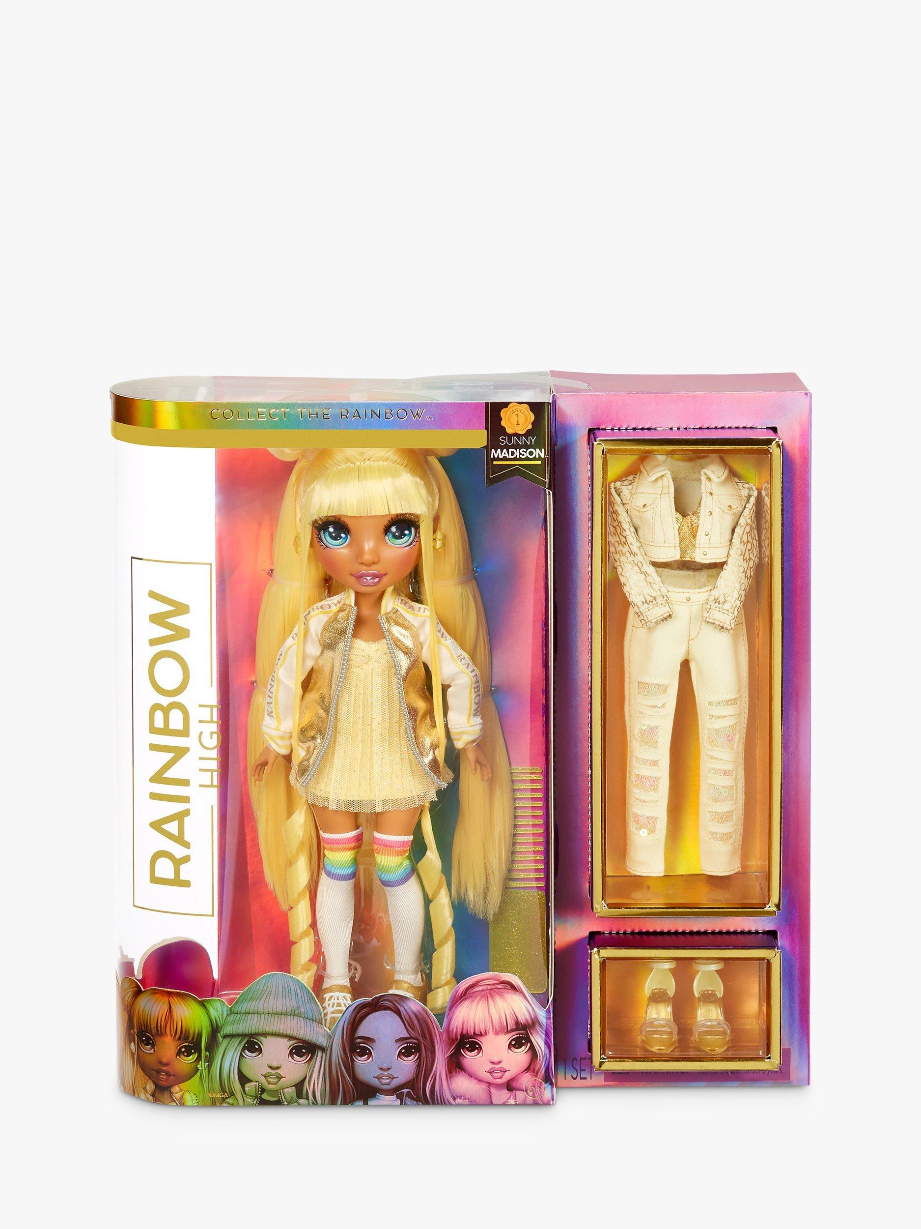Collect the Rainbow of beautiful fashion dolls with Rainbow High. Introducing Sunny Madison. She's dressed in yellow from head to toe, and she has gorgeous features, long eyelashes and beautiful, brushable hair. She's fully articulated and posable. Her arms and legs bend, so she can strike tons of glamorous poses. Sunny comes with 2 complete outfits to mix and match for bold, showstopping looks. She has quirky-cute style makes all her BFFs smile. She comes with a sparkly dress, two jackets, rainbow socks, sparkly jeans and more! And her golden rainbow platform shoes are next level. Also includes hair comb, two hangers and a doll stand.