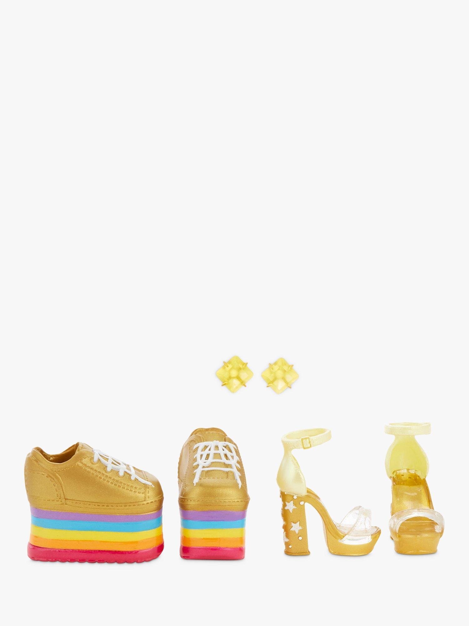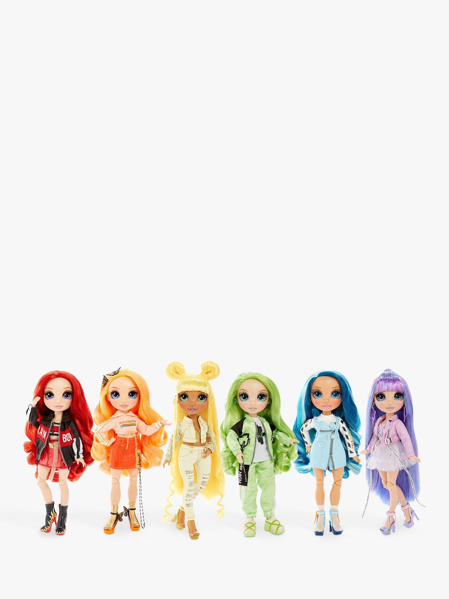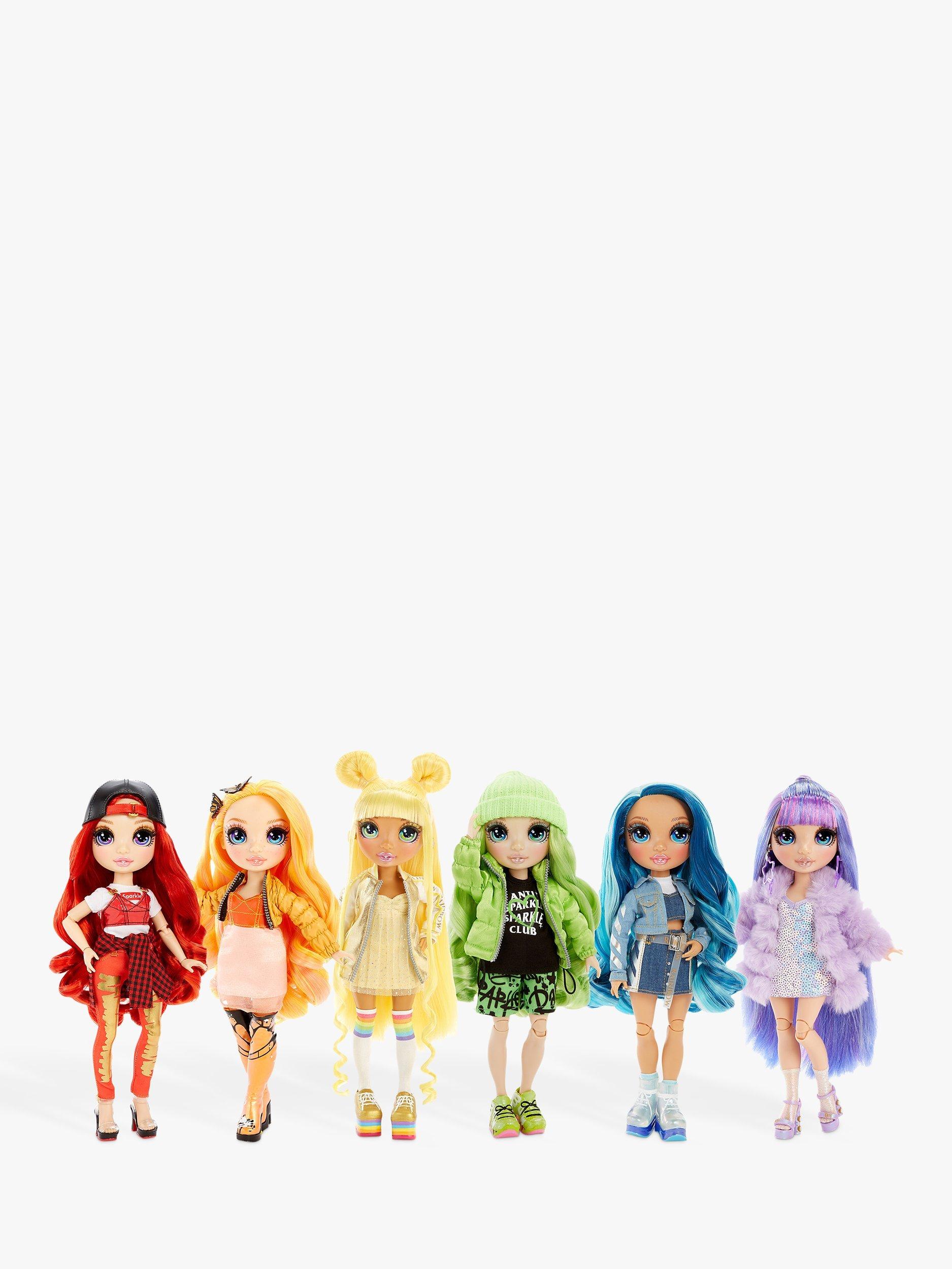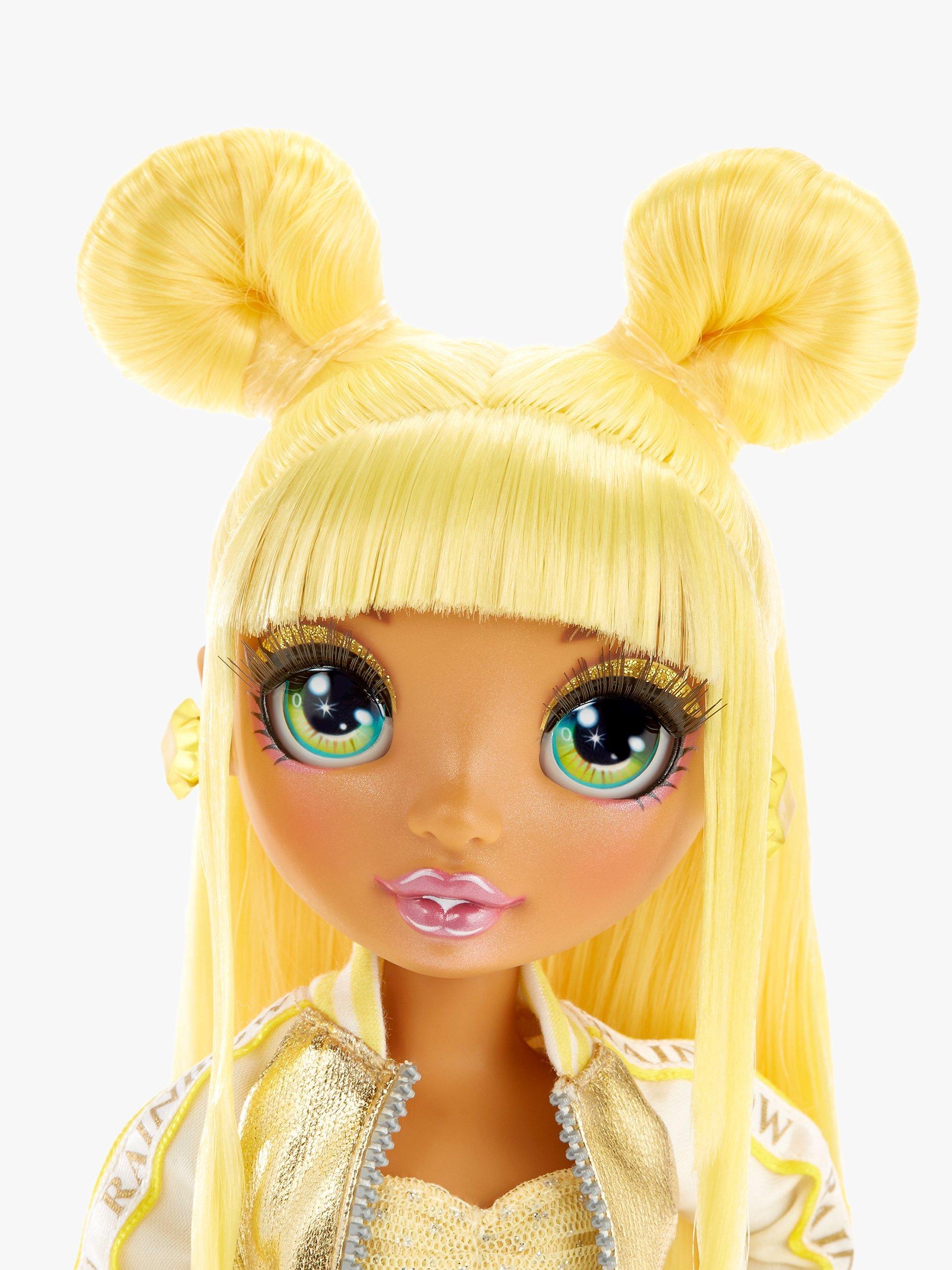 Collect the Rainbow of beautiful fashion dolls with Rainbow High. Introducing Sunny Madison. She's dressed in yellow from head to toe, and she has gorgeous features, long eyelashes and beautiful, brushable hair. She's fully articulated and posable. Her arms and legs bend, so she can strike tons of glamorous poses. Sunny comes with 2 complete outfits to mix and match for bold, showstopping looks. She has quirky-cute style makes all her BFFs smile. She comes with a sparkly dress, two jackets, rainbow socks, sparkly jeans and more! And her golden rainbow platform shoes are next level. Also includes hair comb, two hangers and a doll stand.