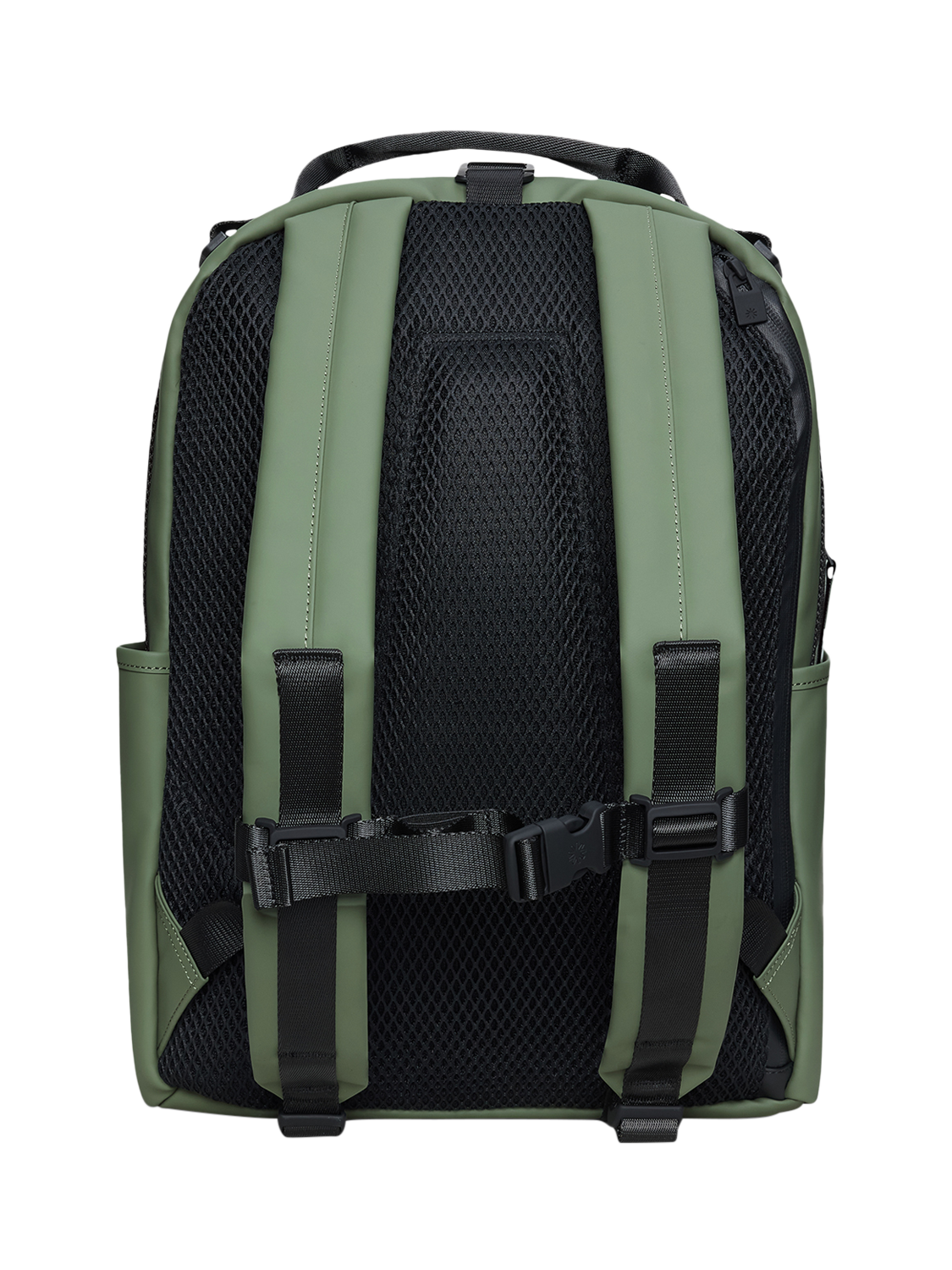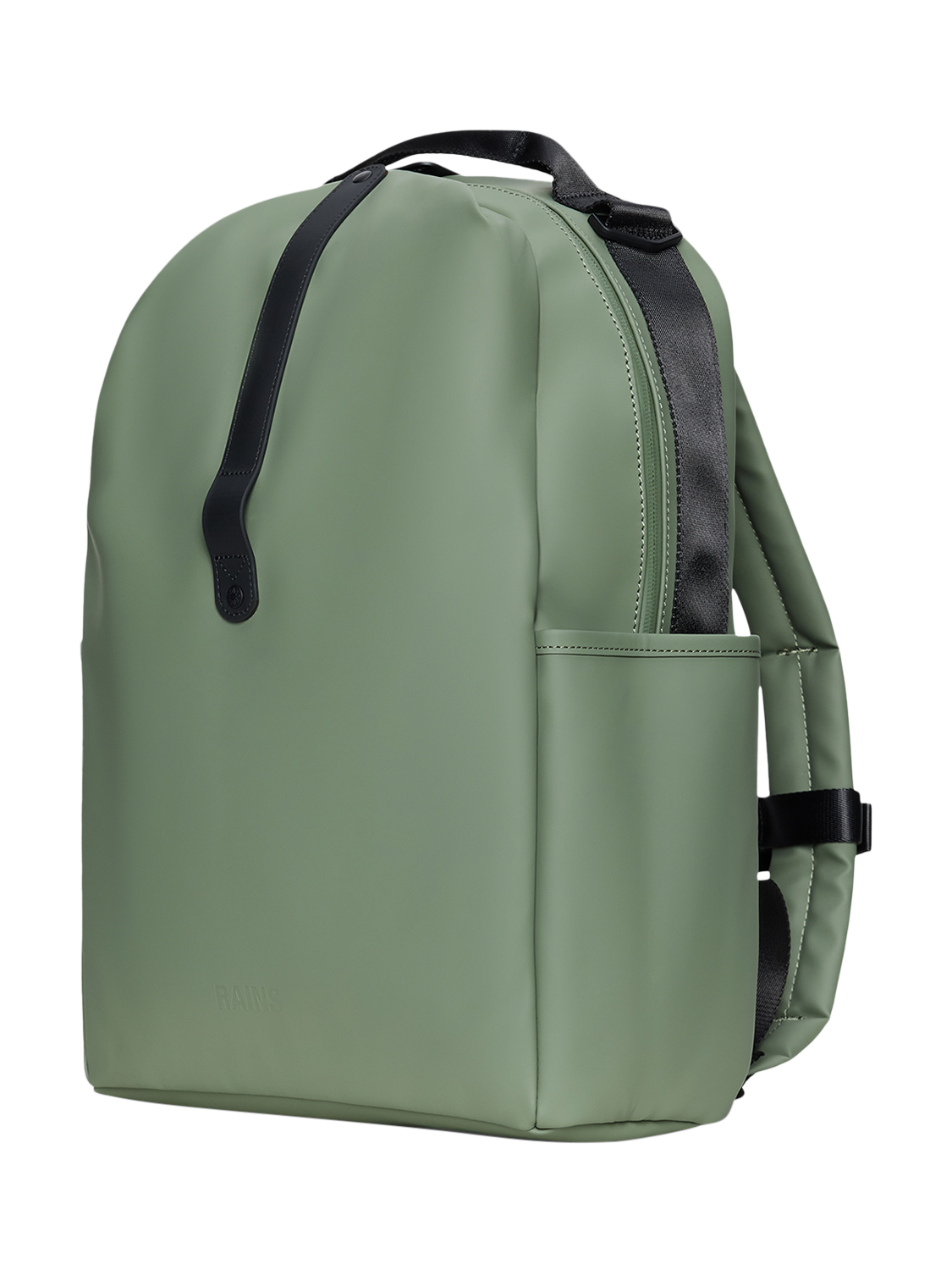 The exterior has side pockets for water bottle, umbrella etc. and a D-ring for keys. The padded back panel, adjustable padded back straps and chest strap assures great comfort when on the move. Clip Front Backpack is cut from Rains' signature PU fabric, engineered for carrying strength, durability and a smooth feel.