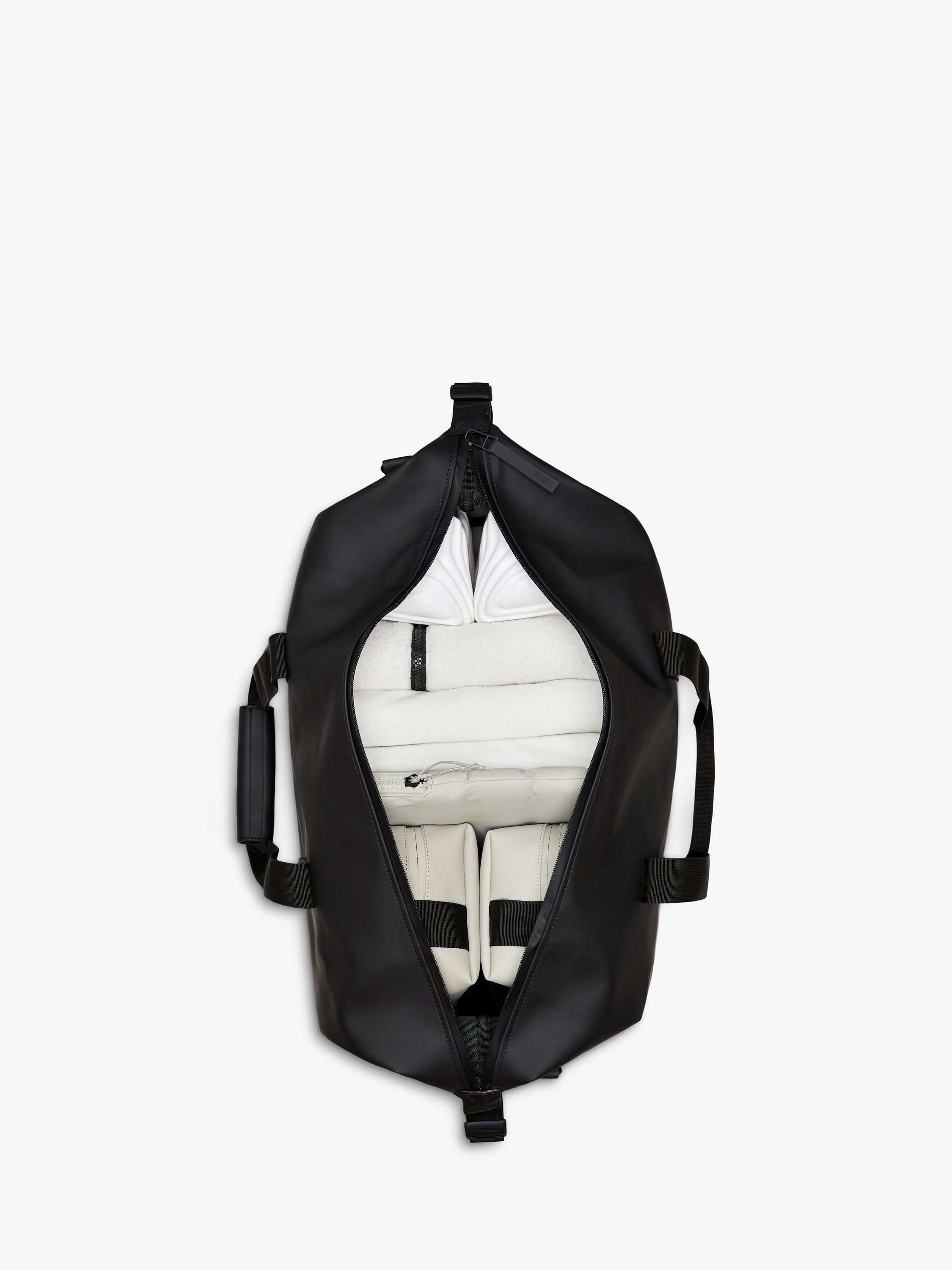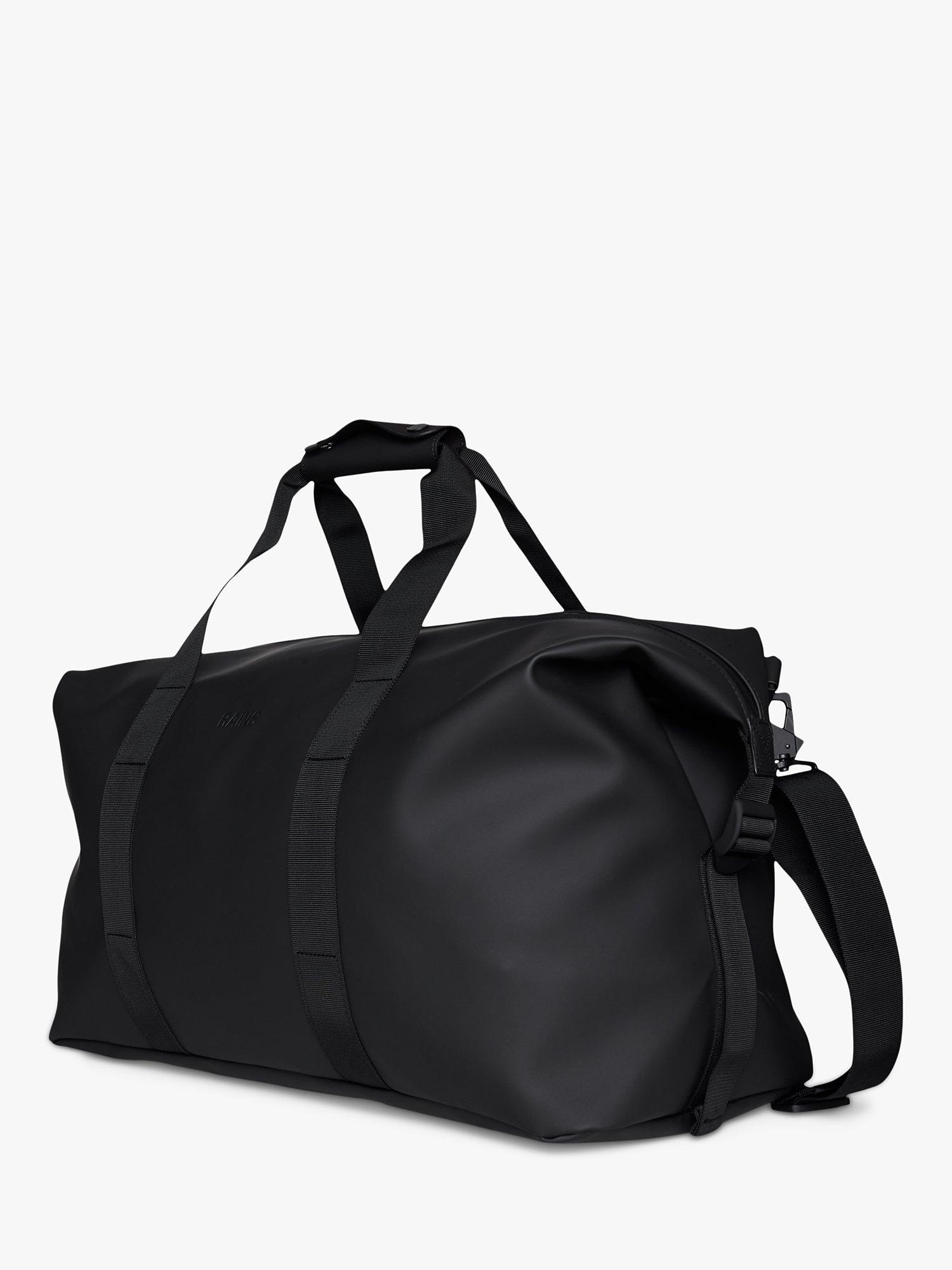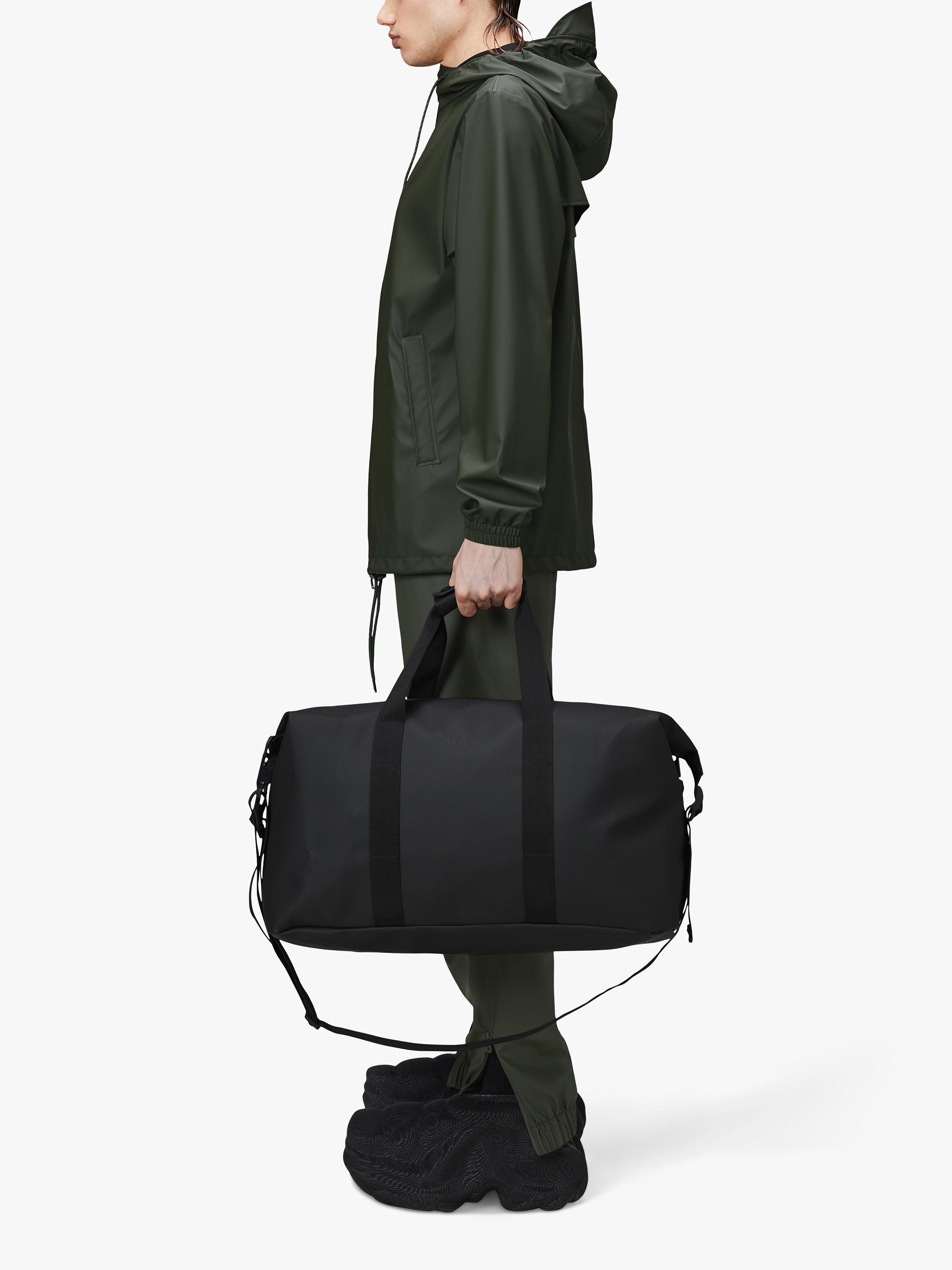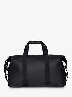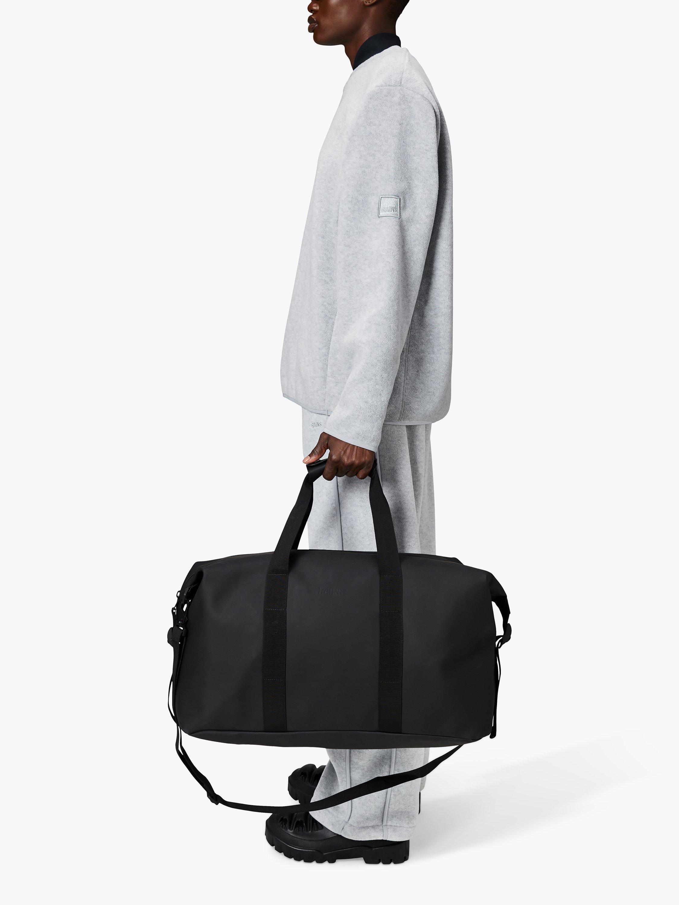 Hilo Weekend Bag is Rains take on the essential overnight bag one of three available sizes. The travel-favorite is clean and contemporary, balancing Rains waterproof fabric with signature strap and hardware details. Open the coated full-length zip to find a spacious single compartment room for clothing, tech and more. Once packed, secure belongings via the silhouette s side-mounted compression straps. The design is finished with webbing carry handles, with comfort sleeve, and attachment rings for an included detachable shoulder strap.