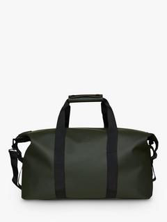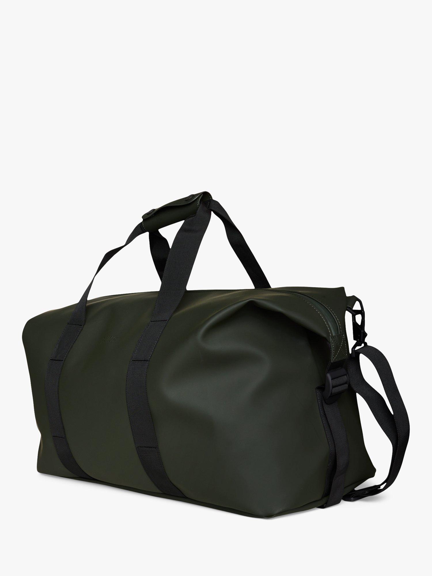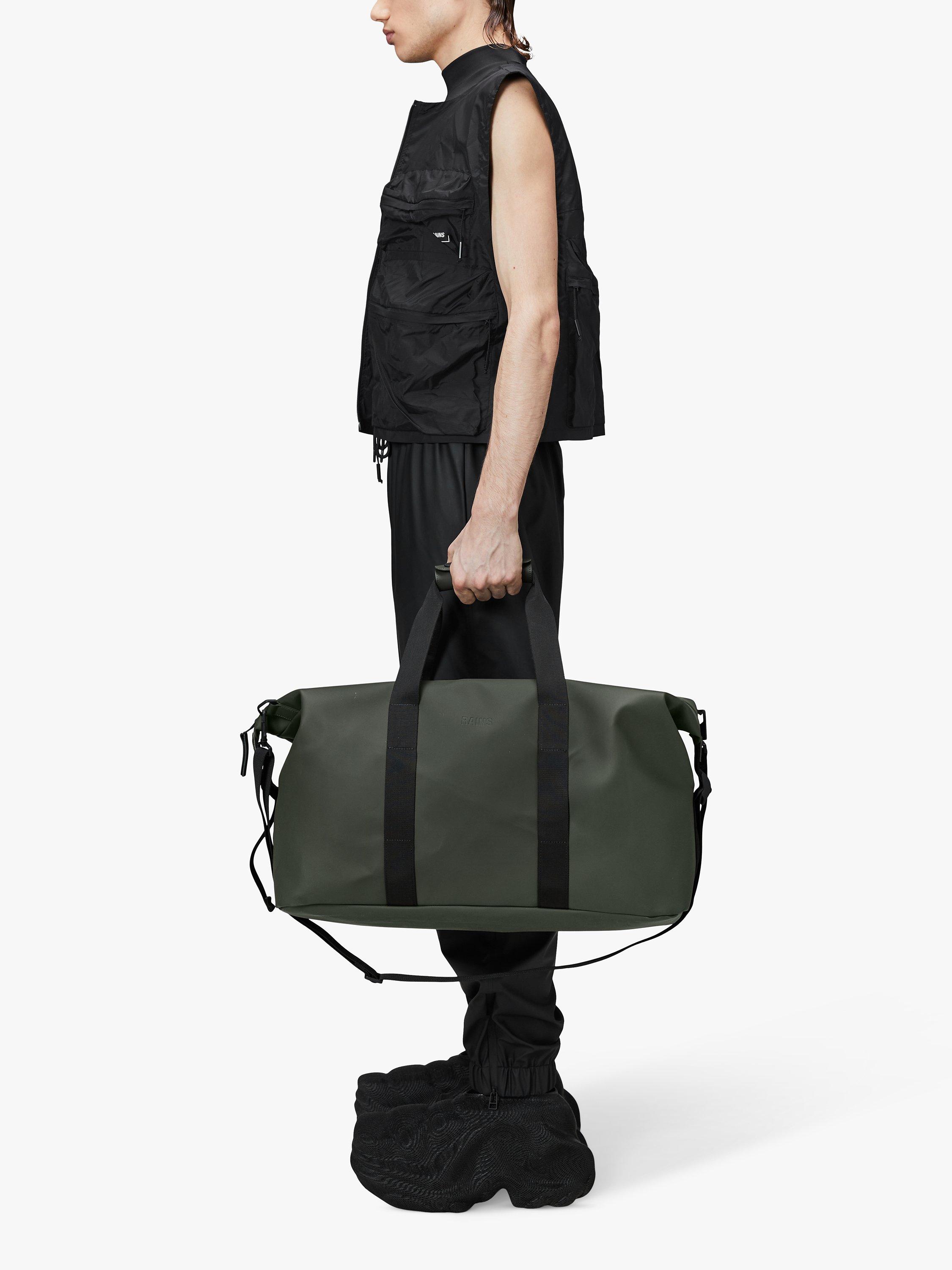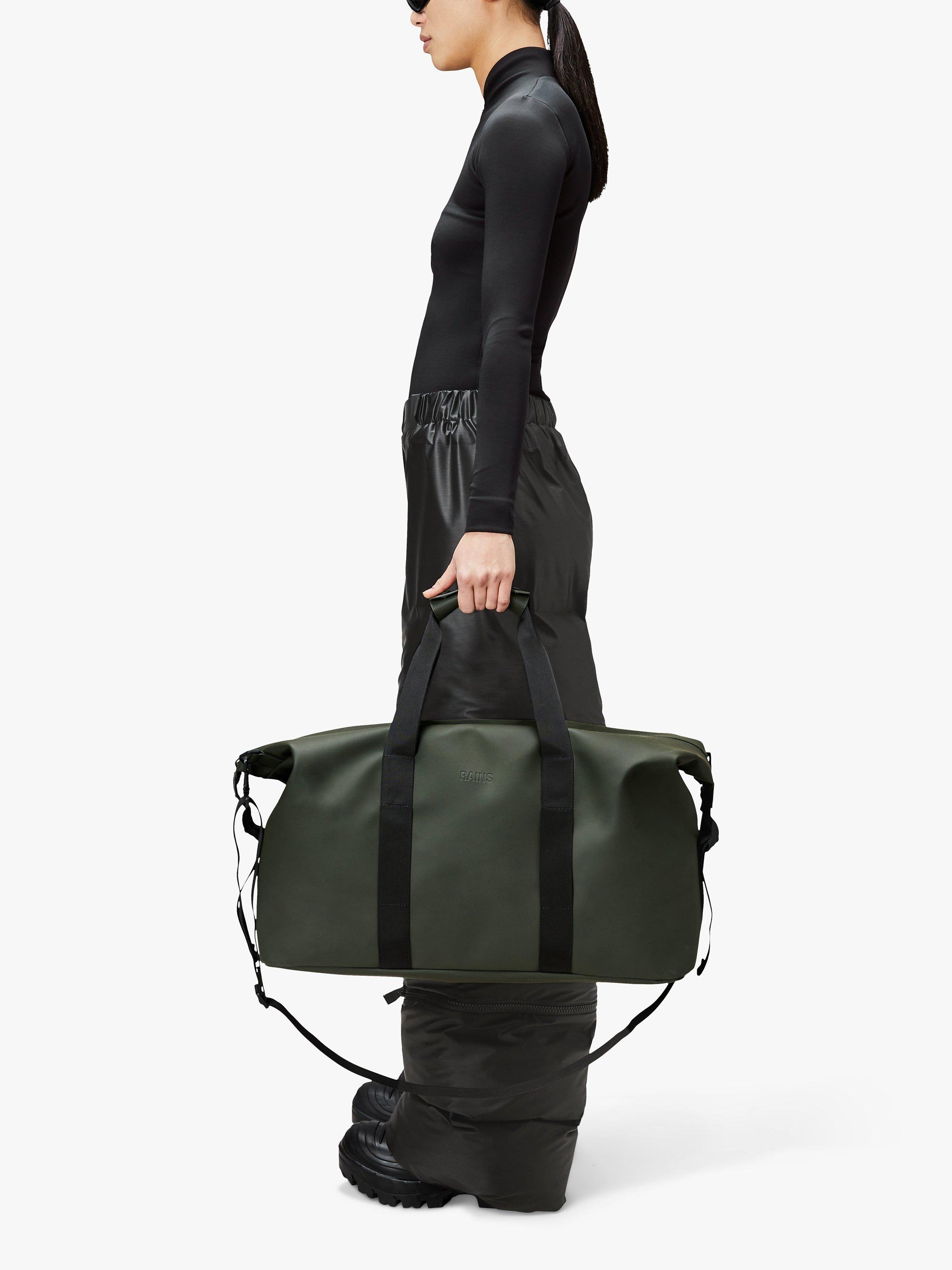Hilo Weekend Bag is Rains take on the essential overnight bag one of three available sizes. The travel-favorite is clean and contemporary, balancing Rains waterproof fabric with signature strap and hardware details. Open the coated full-length zip to find a spacious single compartment room for clothing, tech and more. Once packed, secure belongings via the silhouette s side-mounted compression straps. The design is finished with webbing carry handles, with comfort sleeve, and attachment rings for an included detachable shoulder strap.