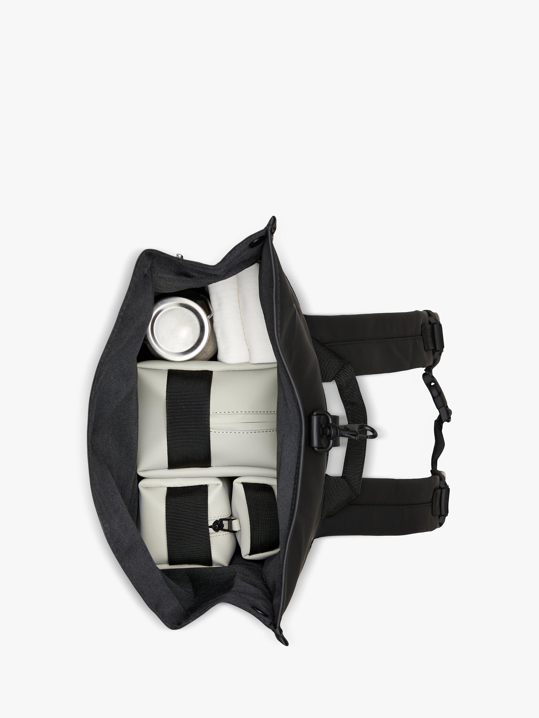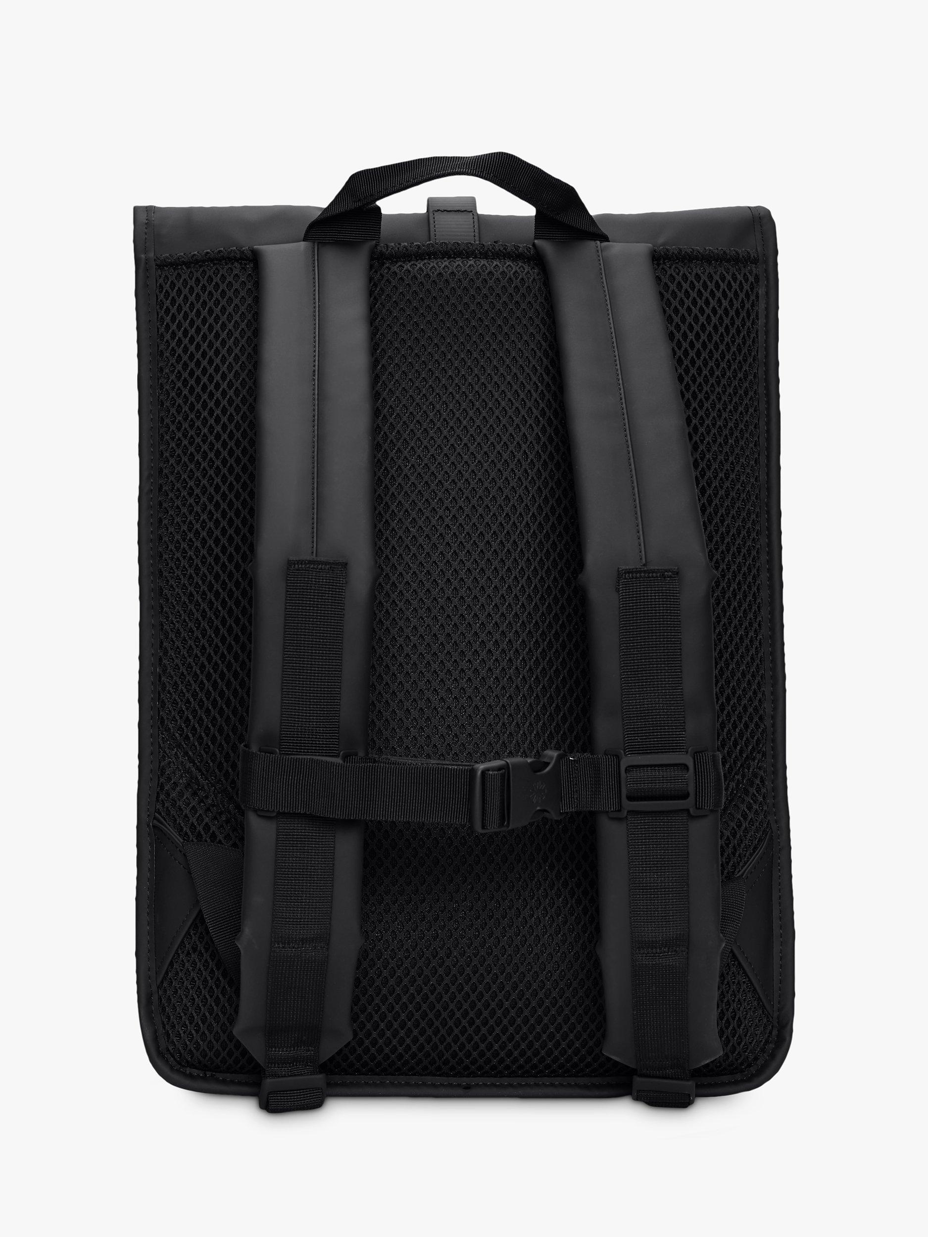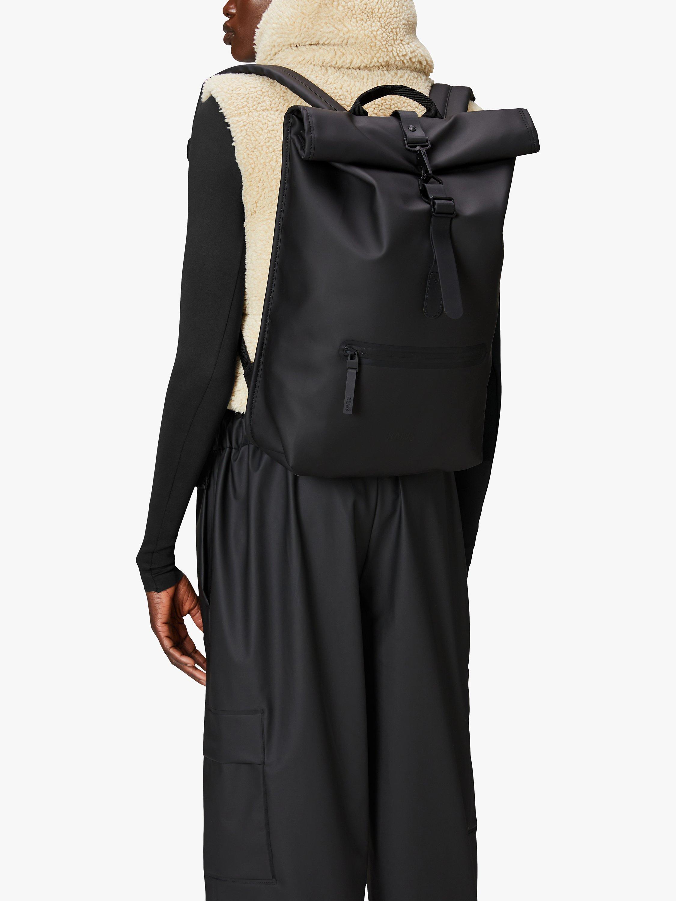 Cycle-ready features include a front D-ring ideal for holding bike locks and a buckle-fastened chest strap for a secure ride-proof fit. Roll-top Rucksack is cut in the Rains signature waterproof PU fabric, engineered for carrying strength, durability, and a smooth feel.