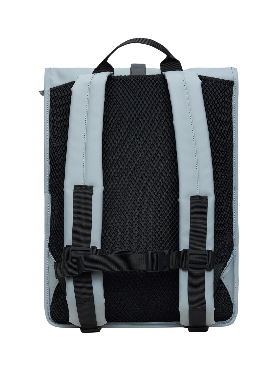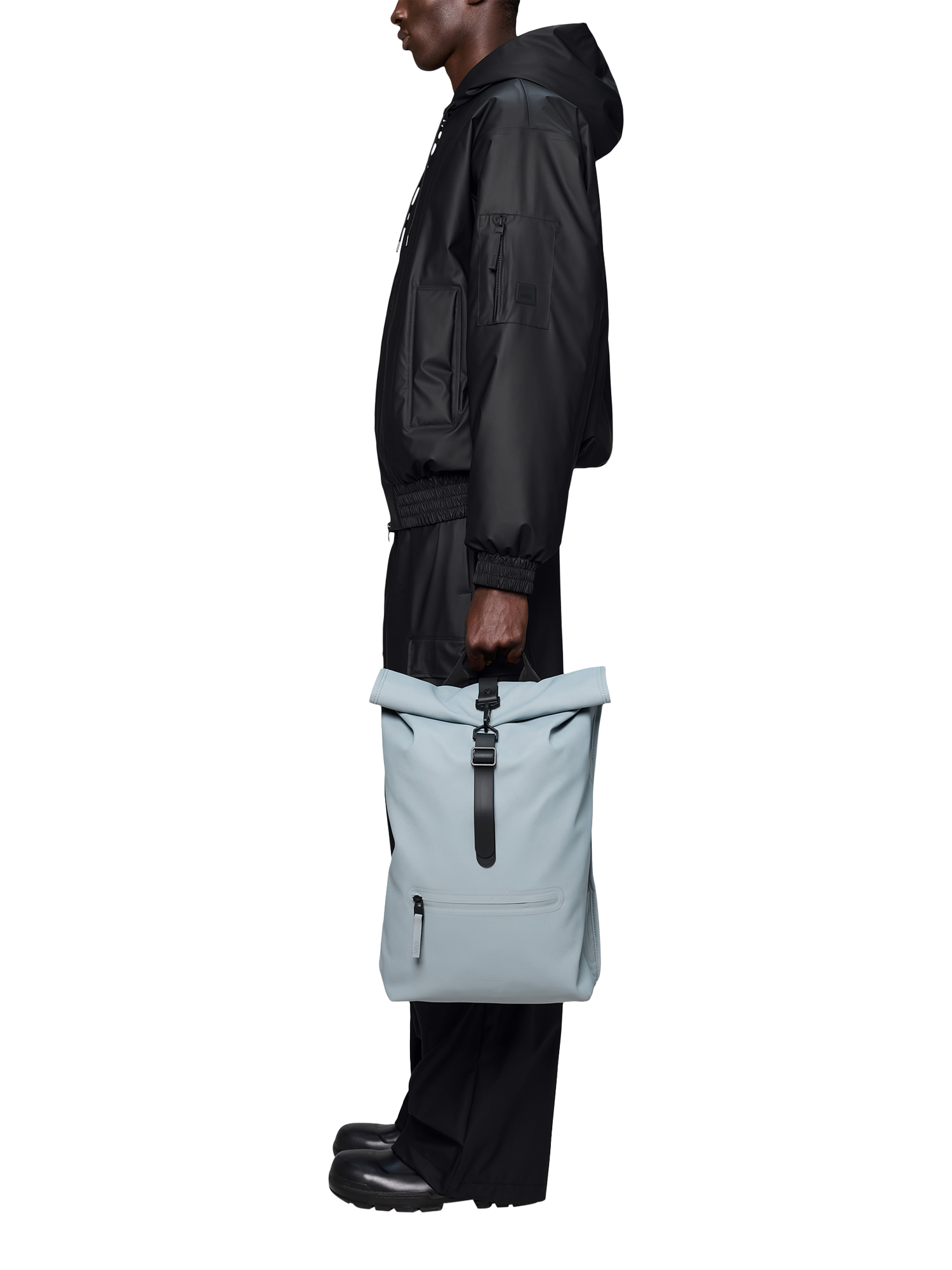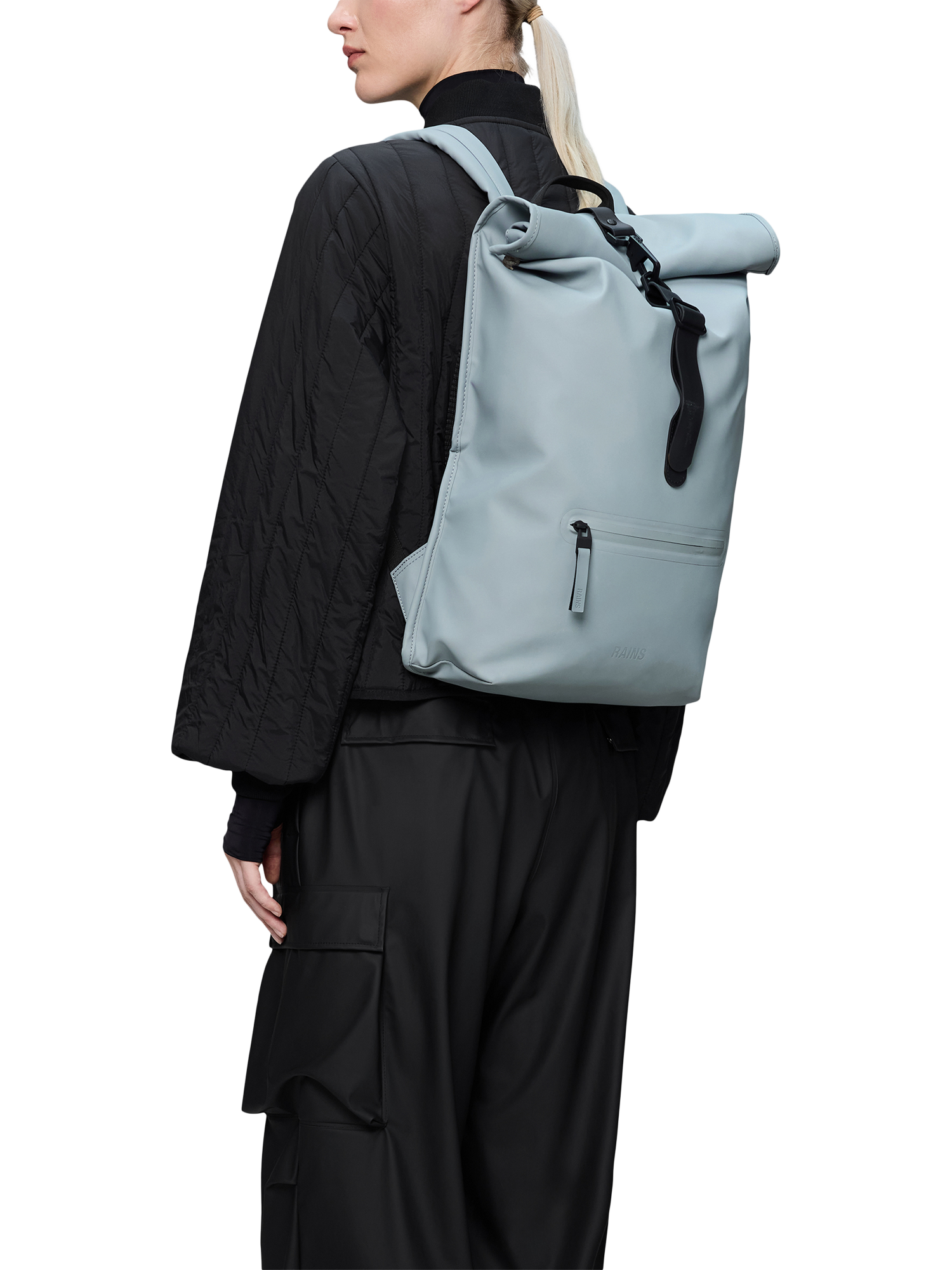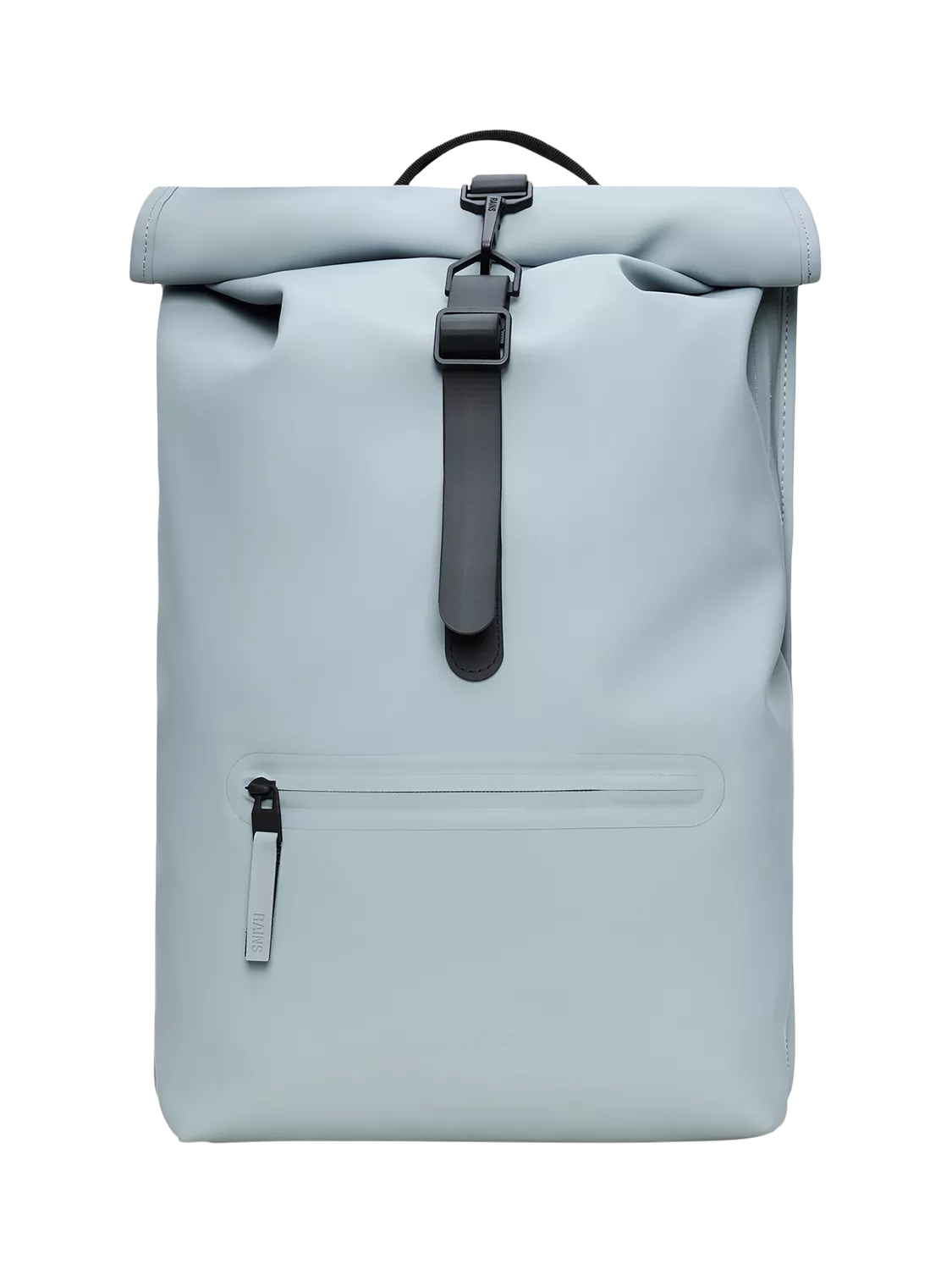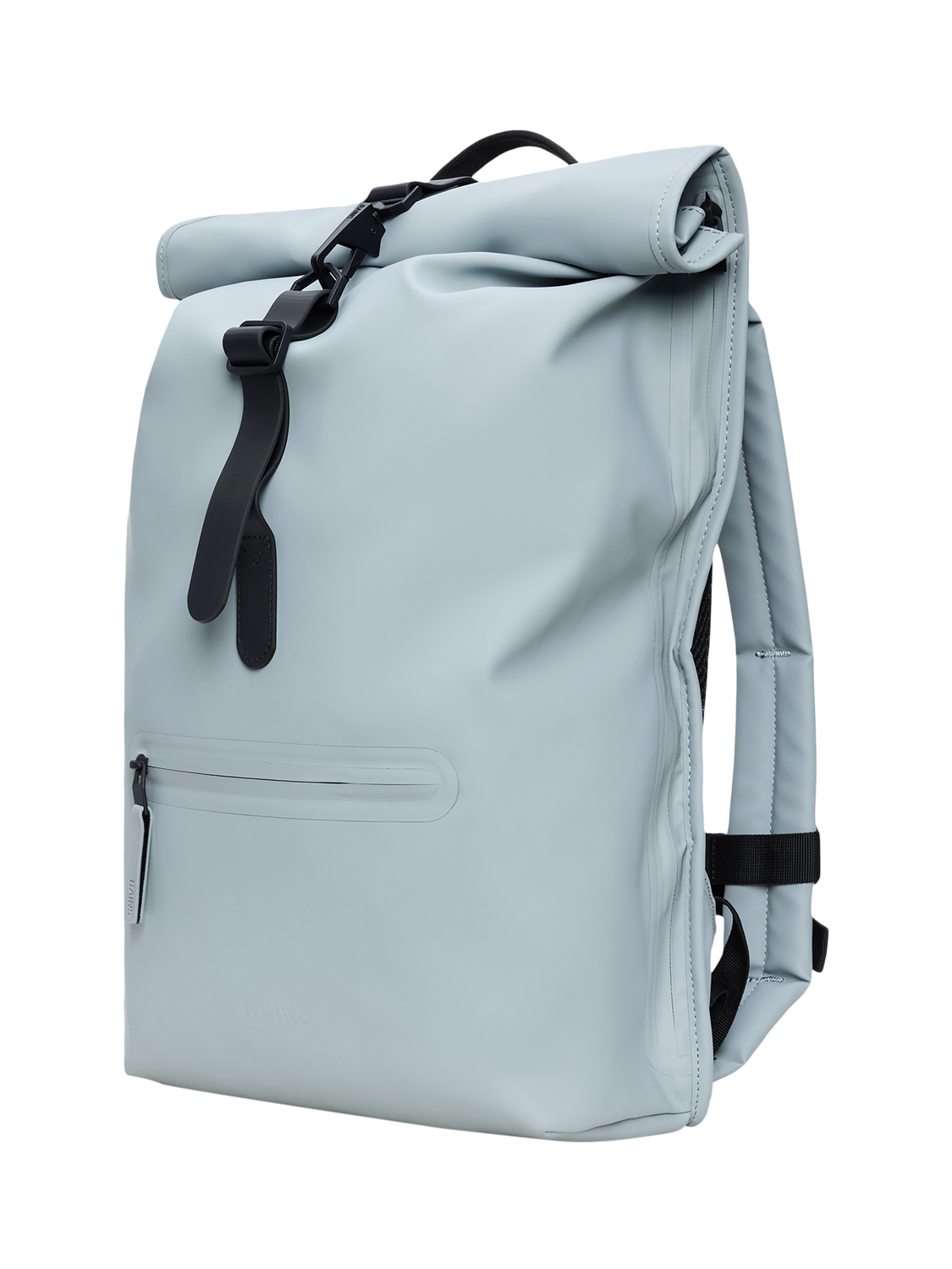 Roll-top Rucksack is cut from Rains' signature PU fabric, engineered for carrying strength, durability and a smooth feel.