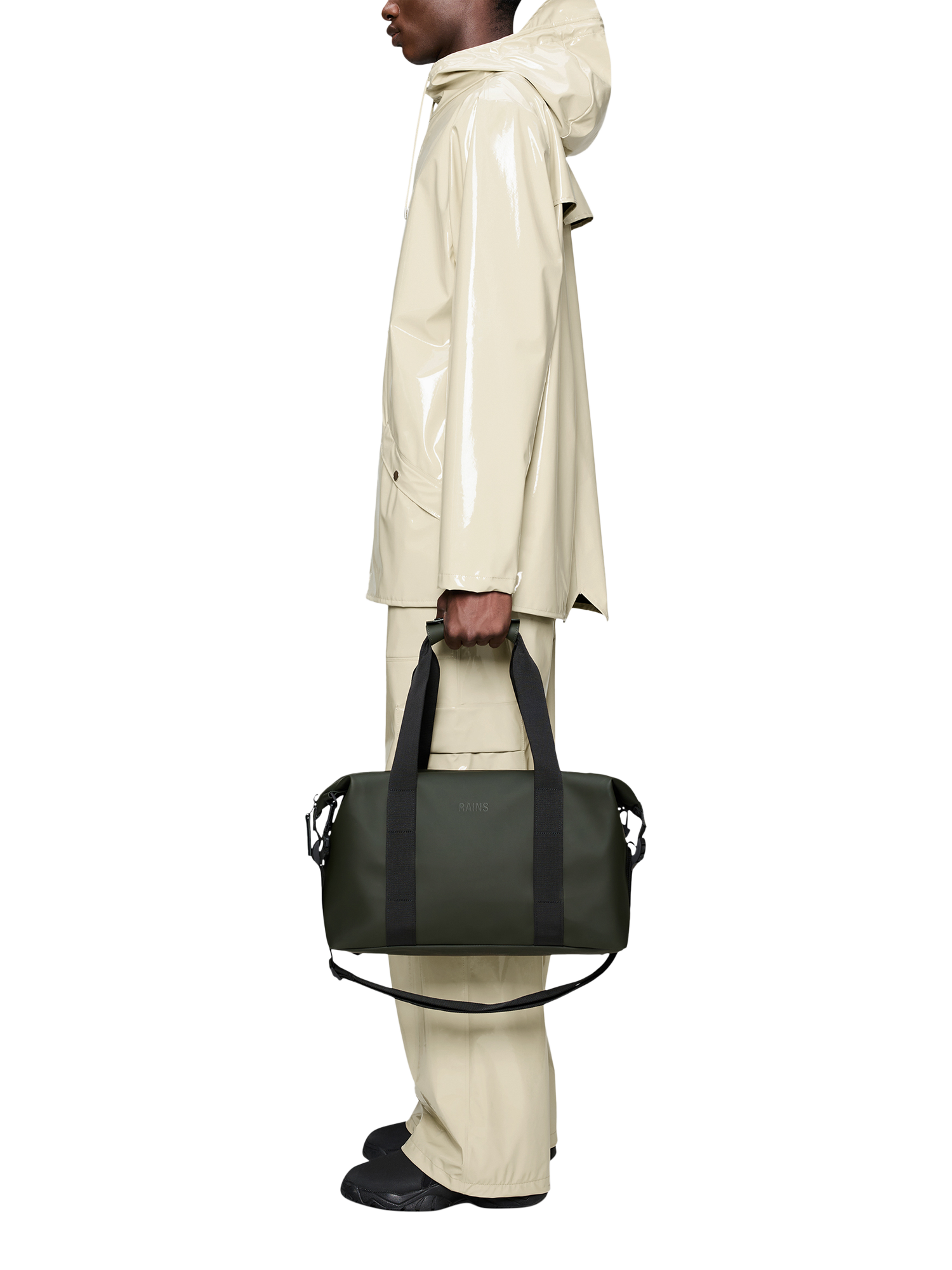 Hilo Weekend Bag Small is cut from Rains’ signature waterproof PU fabric, engineered for carrying strength, durability, and a smooth feel.