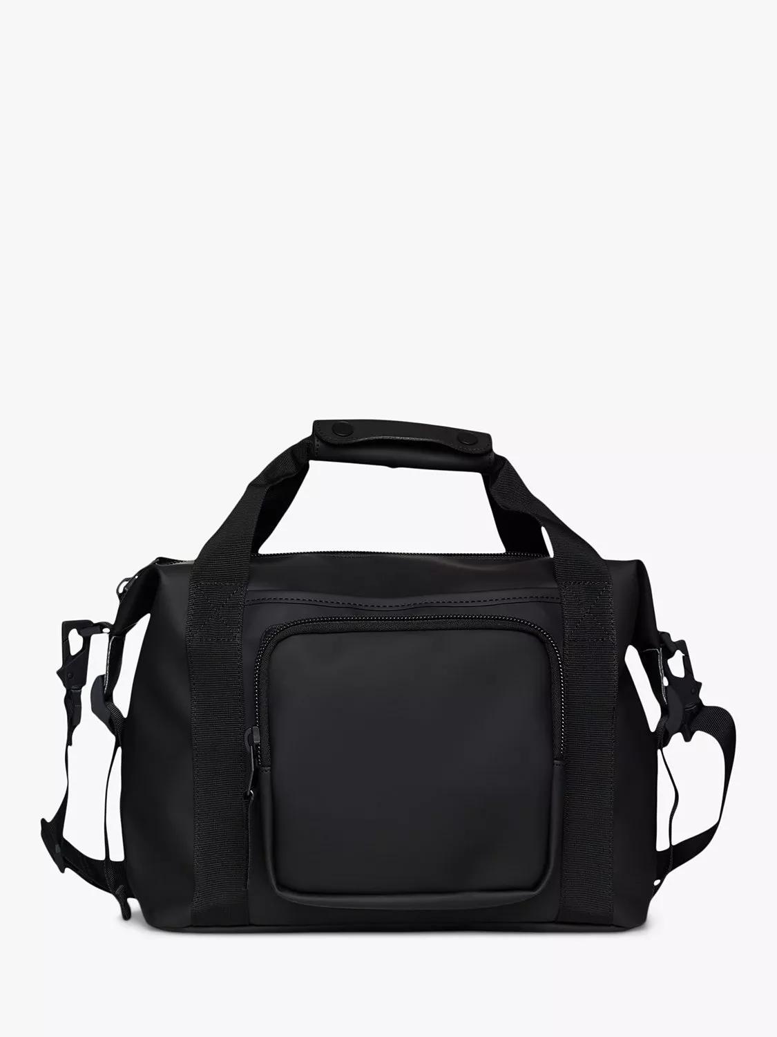 The bag has a utility feel, underlined by its strap details and front pocket, ideal for keys, airpods and smaller essentials. Finished with a detachable shoulder strap and side compression straps, keeping belongings in place. A back-mounted trolley sleeve, with zip pocket, allows the bag to be slid onto telescopic trolley handles for easy transportation. Sized to fit the Rains Texel Cabin Trolley and Texel Cabin Bag. May not fit trolley bags from other manufacturers.