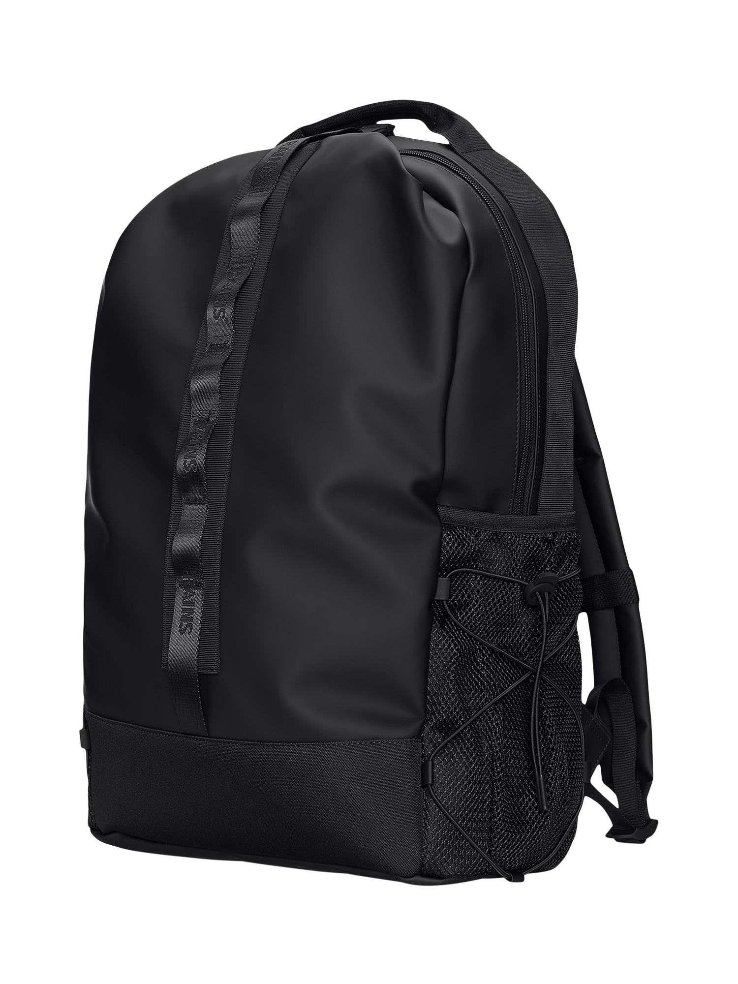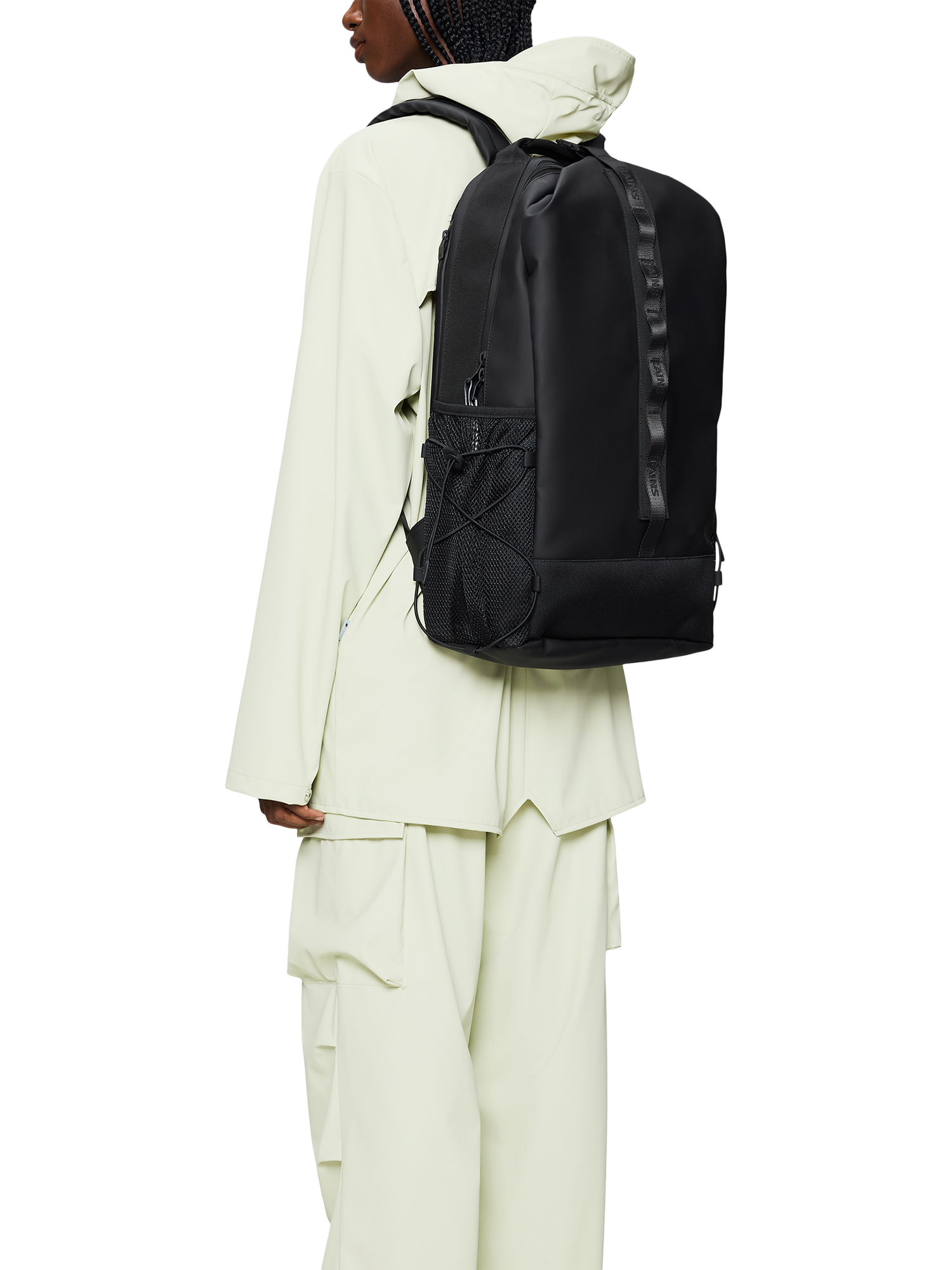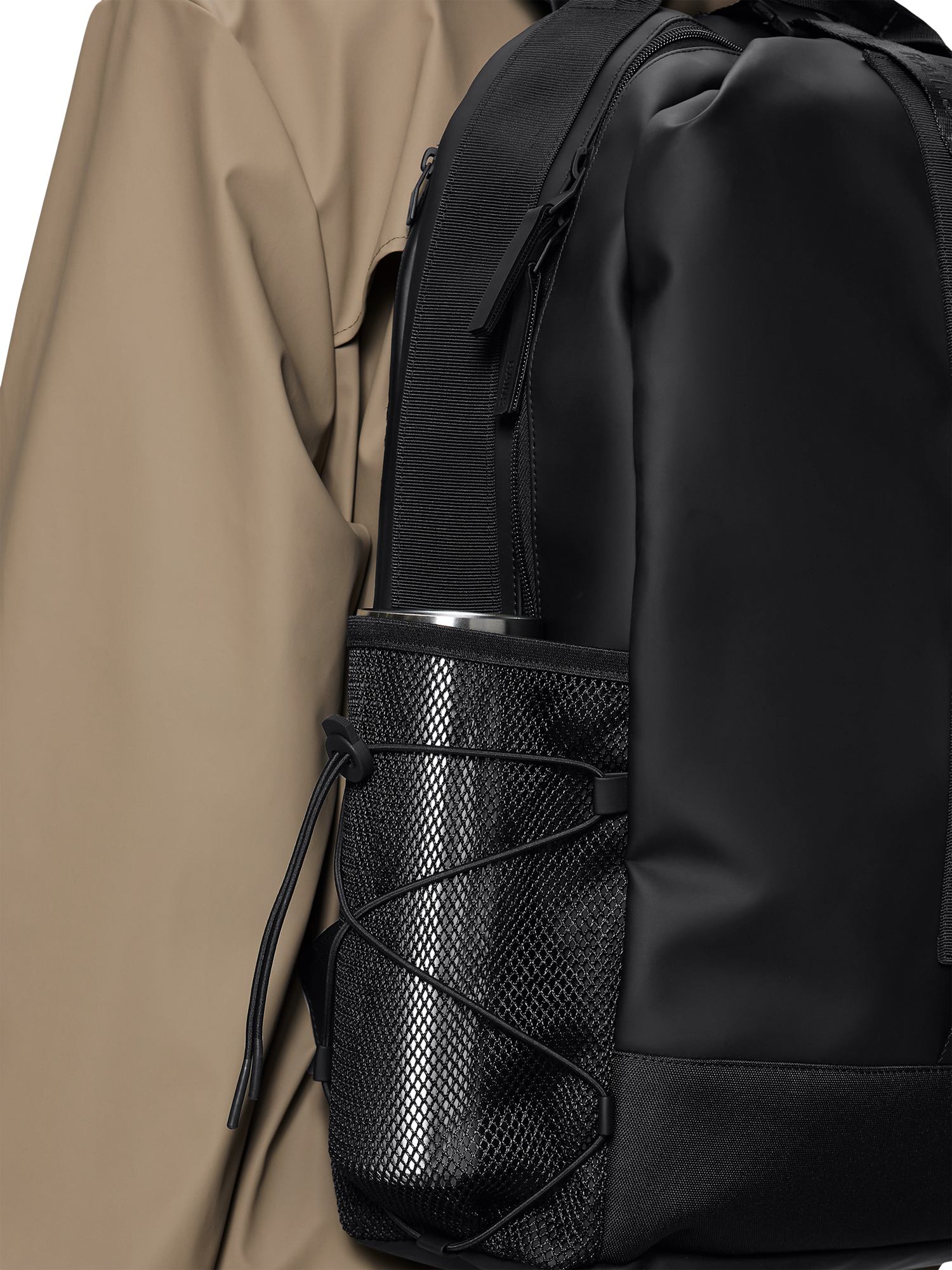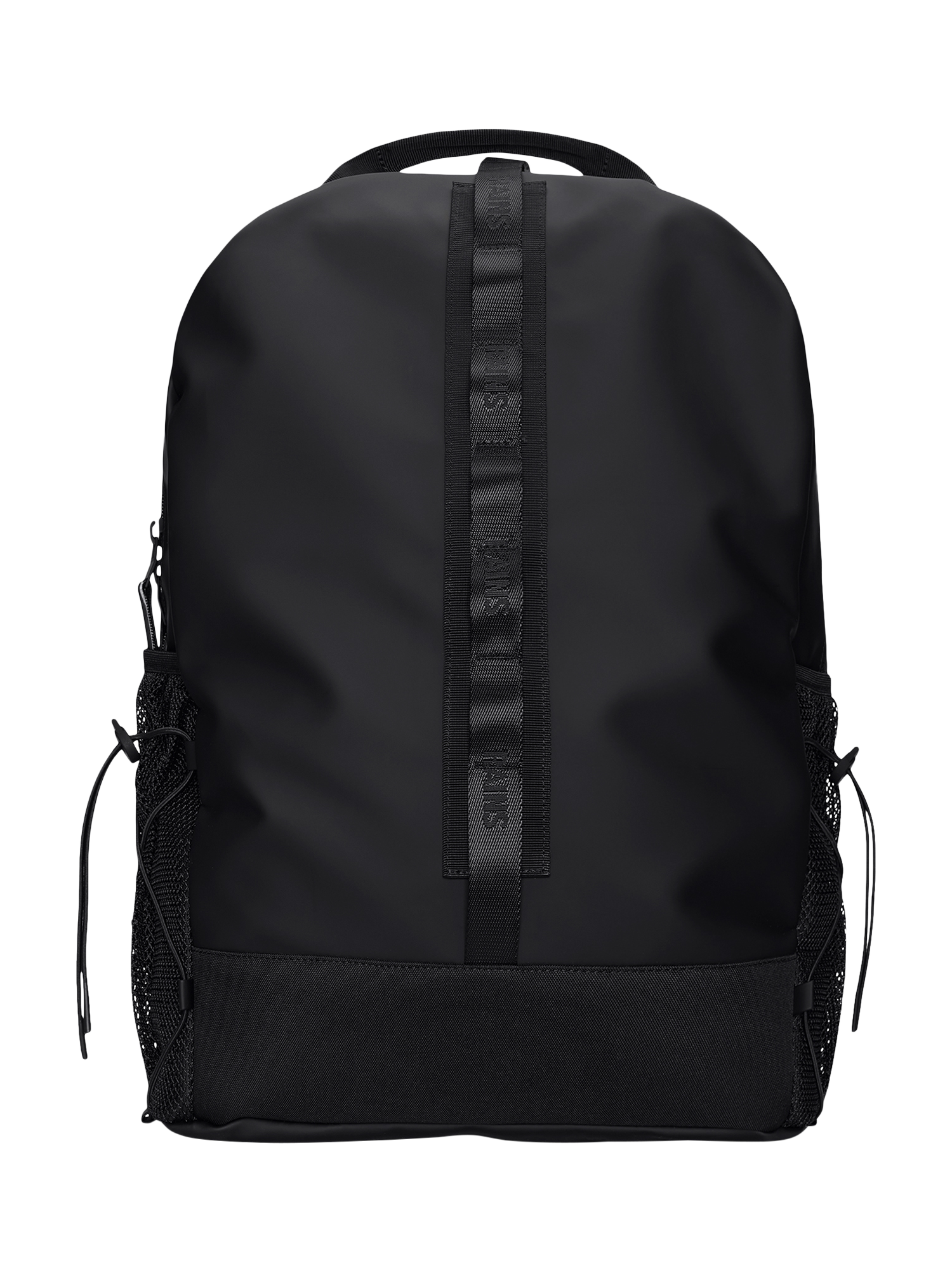 The exterior has side mesh pockets with elastic cords for water bottle, umbrella etc., a D-ring and branded webbing details. The padded back panel, adjustable padded back straps and chest strap assures great comfort when on the move. Trail Clip Front Backpack is cut from Rains' signature PU fabric, engineered for carrying strength, durability and a smooth feel.