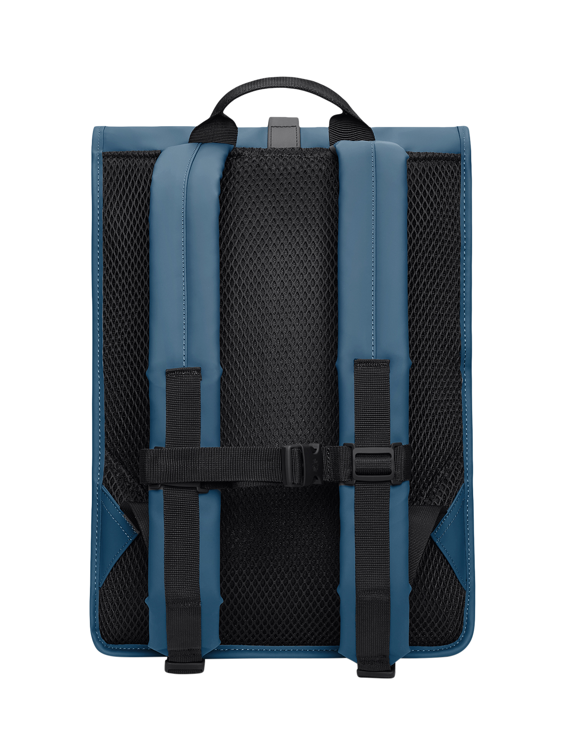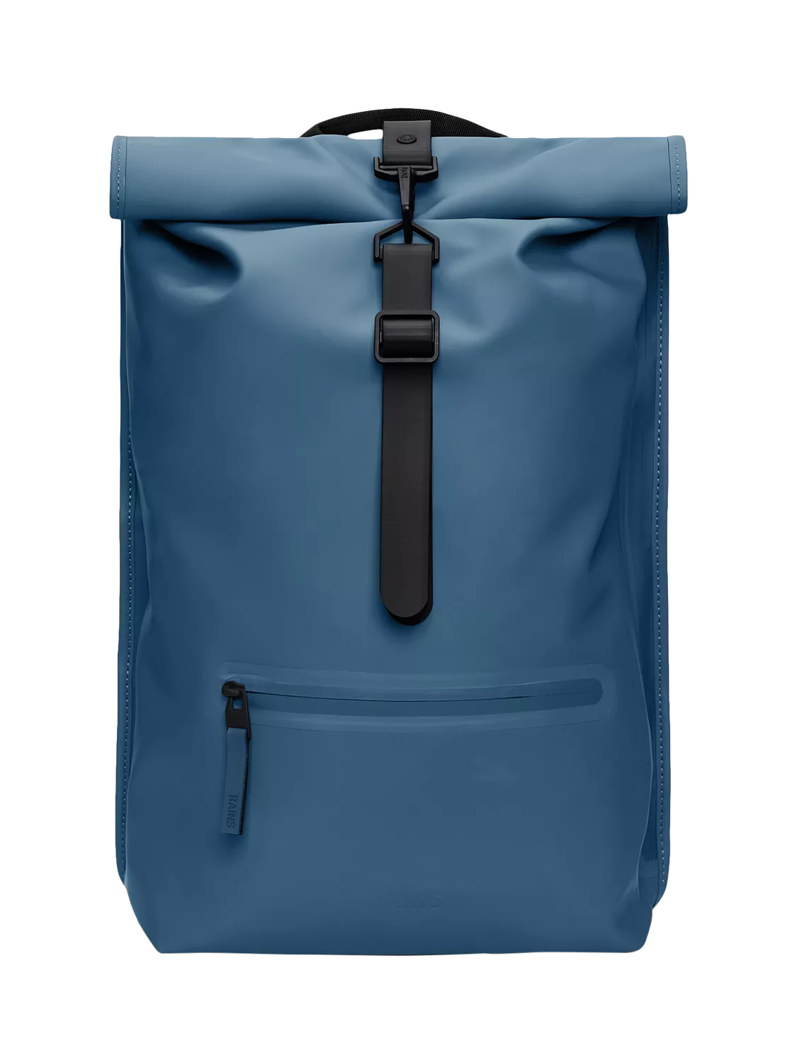 Rolltop Rucksack is cut in Rains' signature waterproof PU fabric engineered for carrying strength, durability, and a smooth feel.