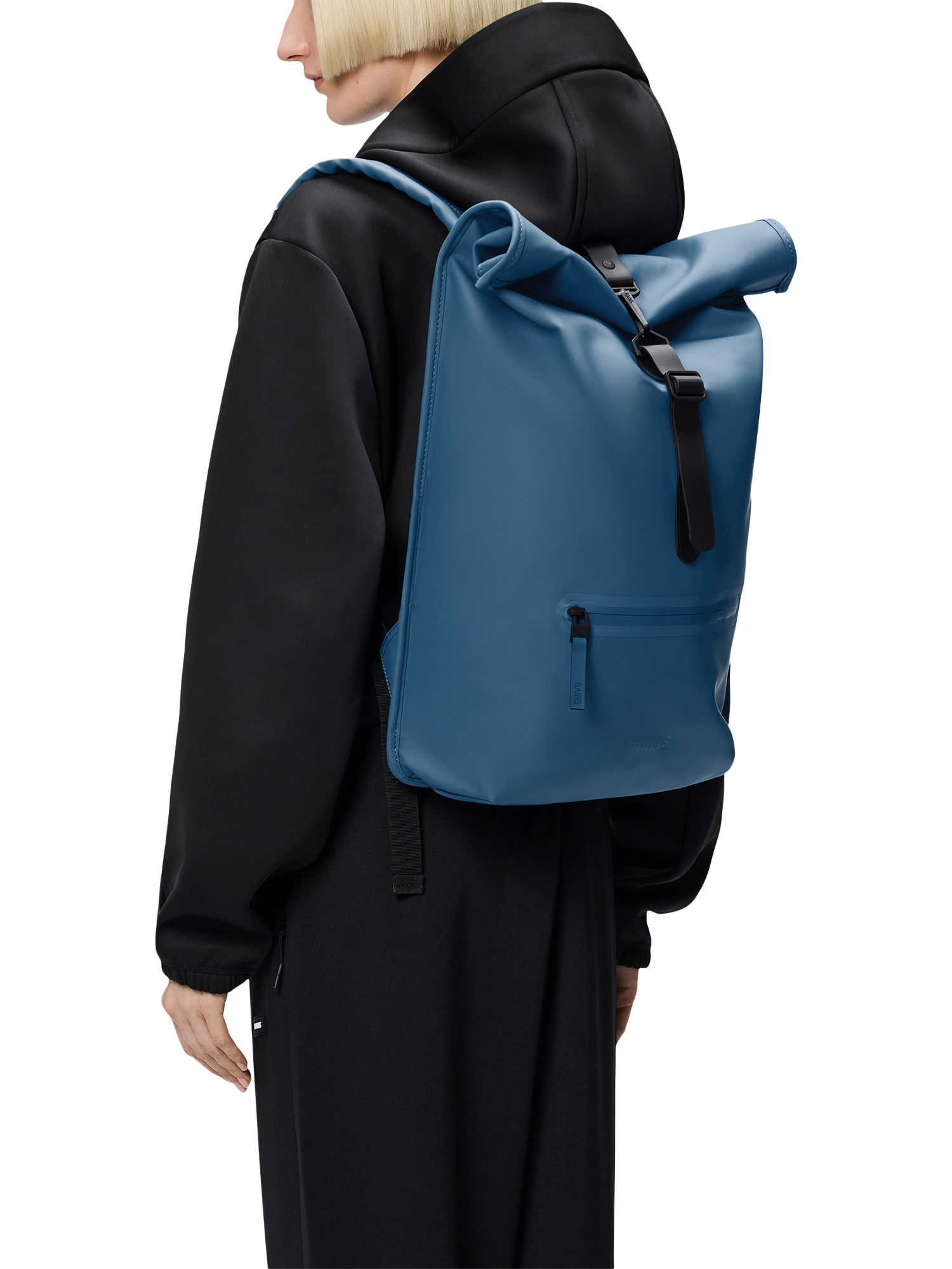 The Rains Rolltop Rucksack keeps precipitation out when travelling, making it a city staple that's great for commutes on bike or foot. To protect essentials from rain, fold the rolltop into a tight scroll and secure using the signature carabiner.