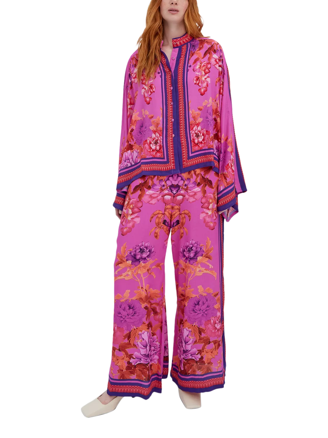 Introducing the Alisa Shirt, a vibrant addition to any fashion-forward wardrobe. This statement piece crafted in viscose crepe features a bold floral print with a rich fusion of colourful floral hues, set against a lively self colour background. Accented with contrast colour trims for a touch of elegance, it has a structured collar and billowing bell sleeves for a chic, modern look. Perfect for brightening up the office or a casual day out.
