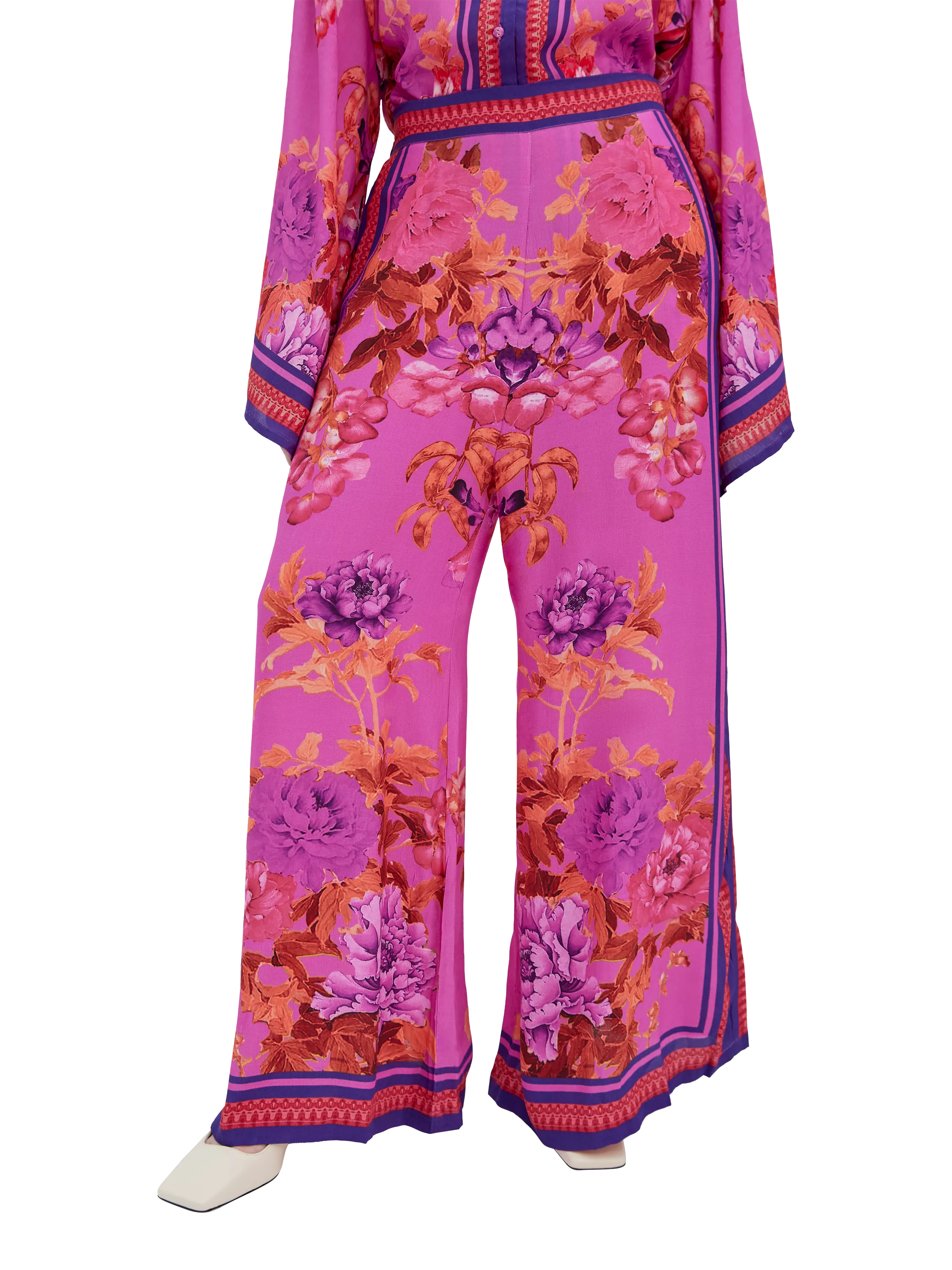 Make a vibrant addition to your style repertoire with the Alina Pink Trousers. Bursting with lush florals and framed by bold, bohemian trim, these wide-leg trousers exude effortless elegance. The high-waist design and fluid drape create a flattering silhouette, perfect for elevating your casual look or adding a splash of colour to your evening ensemble. Crafted in viscose crepe, these statement trousers are a must for a standout summer style.
