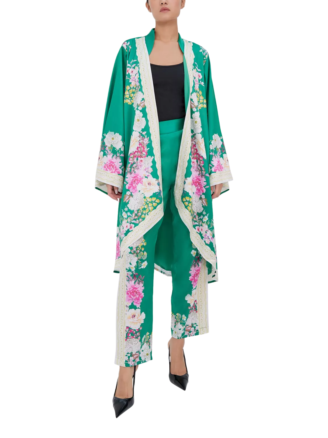 A stunning satin kimono in an eye-catching floral design.