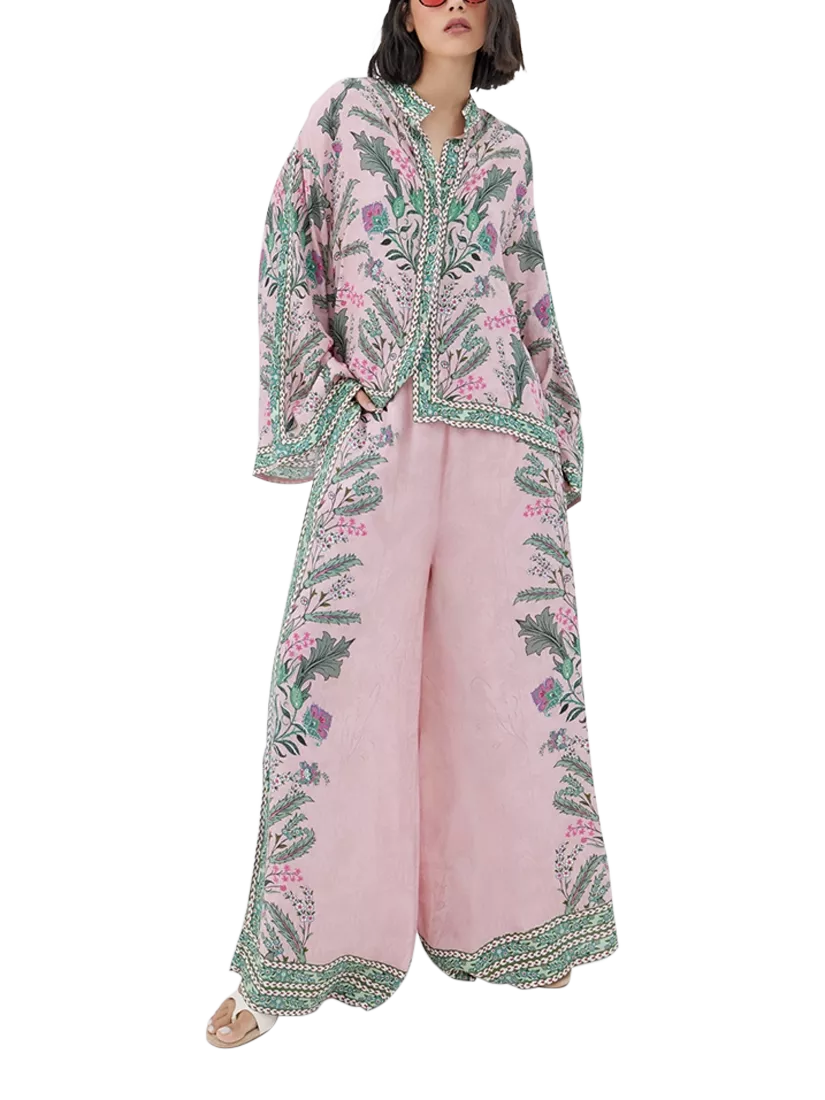 The Ariyah shirt is a flowy top featuring vibrant floral motifs. It boasts a structured collar with a keyhole neckline, button-down front, and wide sleeves edged in printed borders. Lightweight and elegant, it's perfect for resort wear or festive occasions.