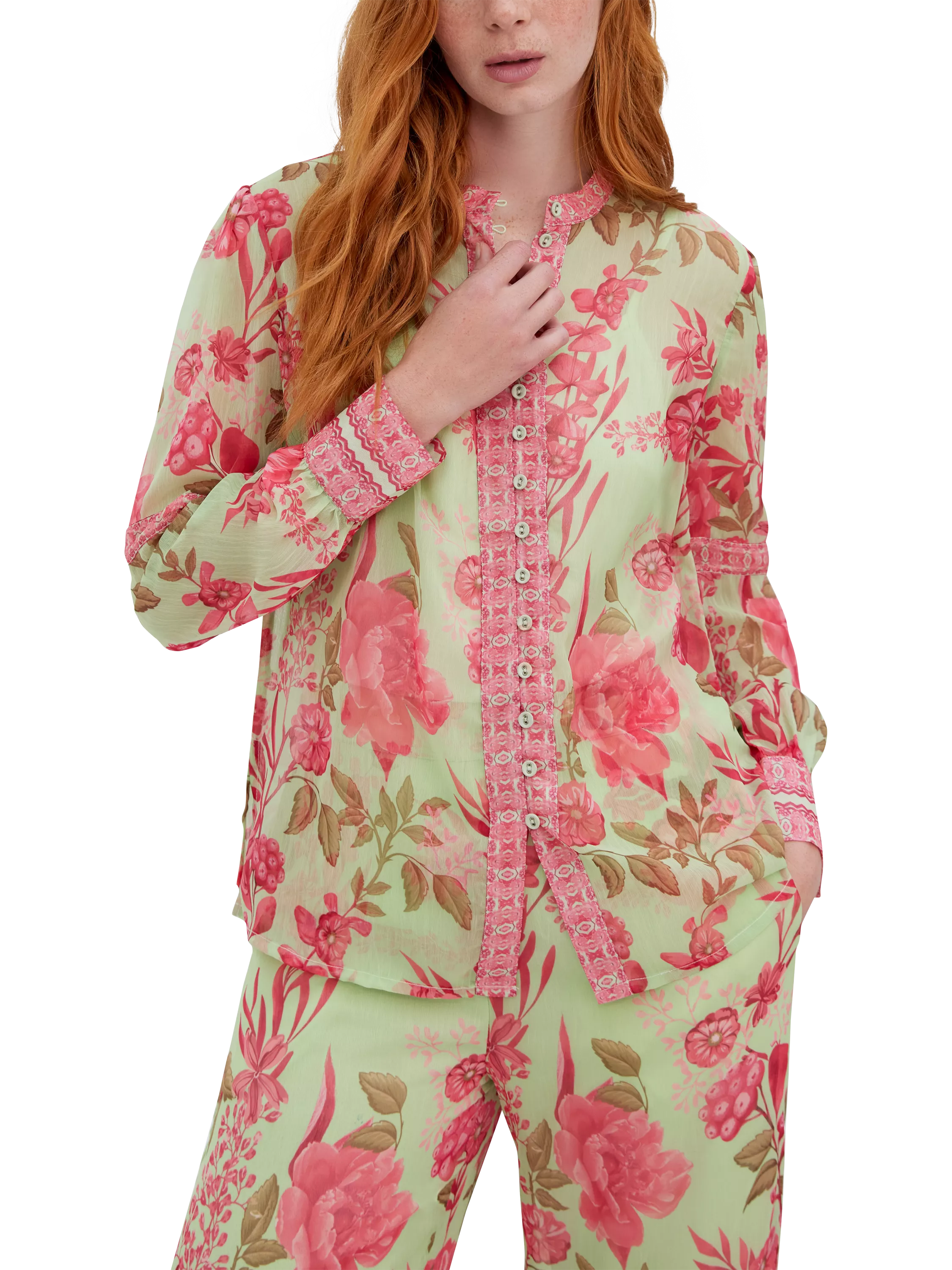 The shirt features a button-down front and detailed cuffs, a high neckline and subtly puffed long sleeves for timeless elegance.
